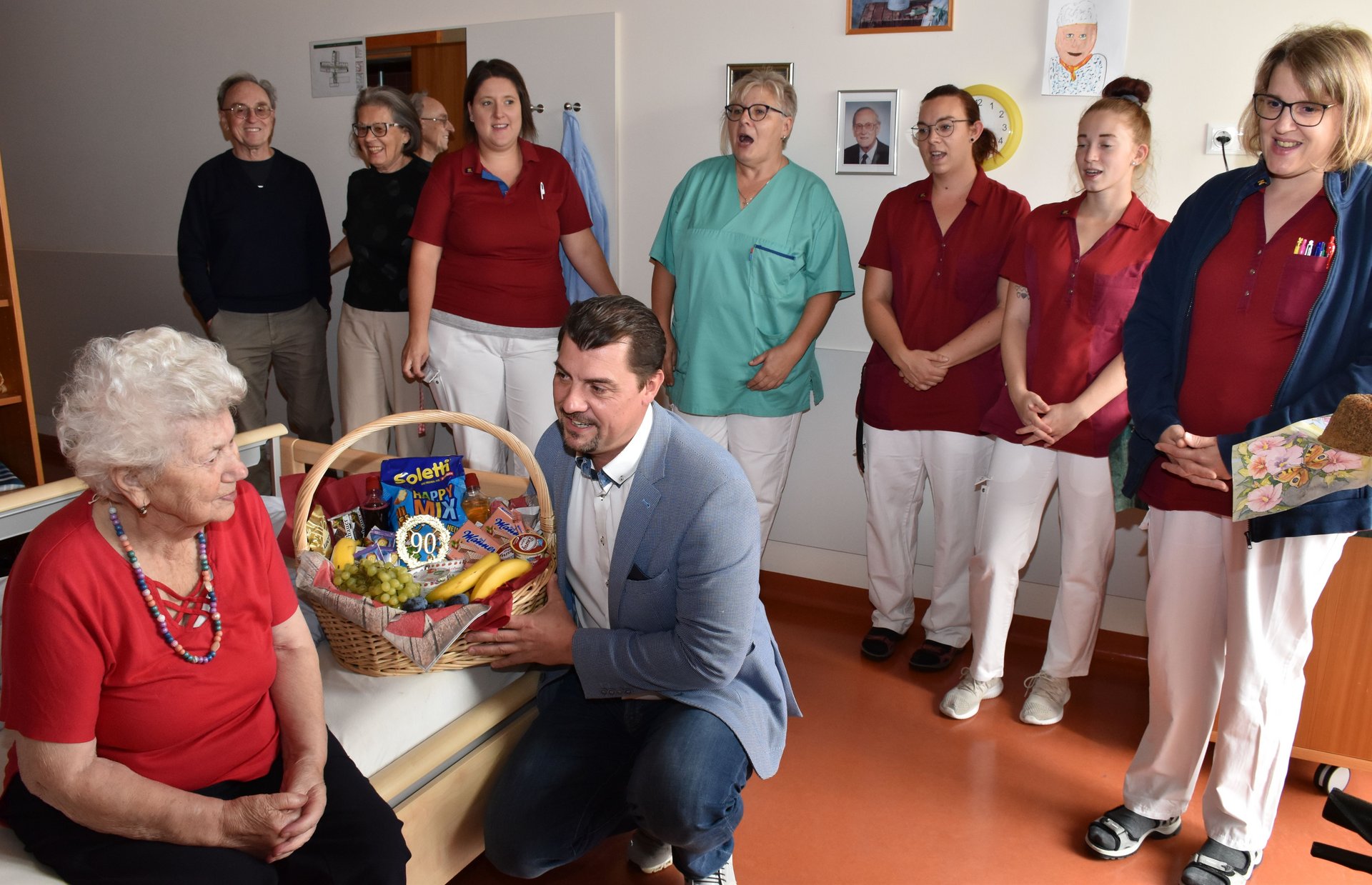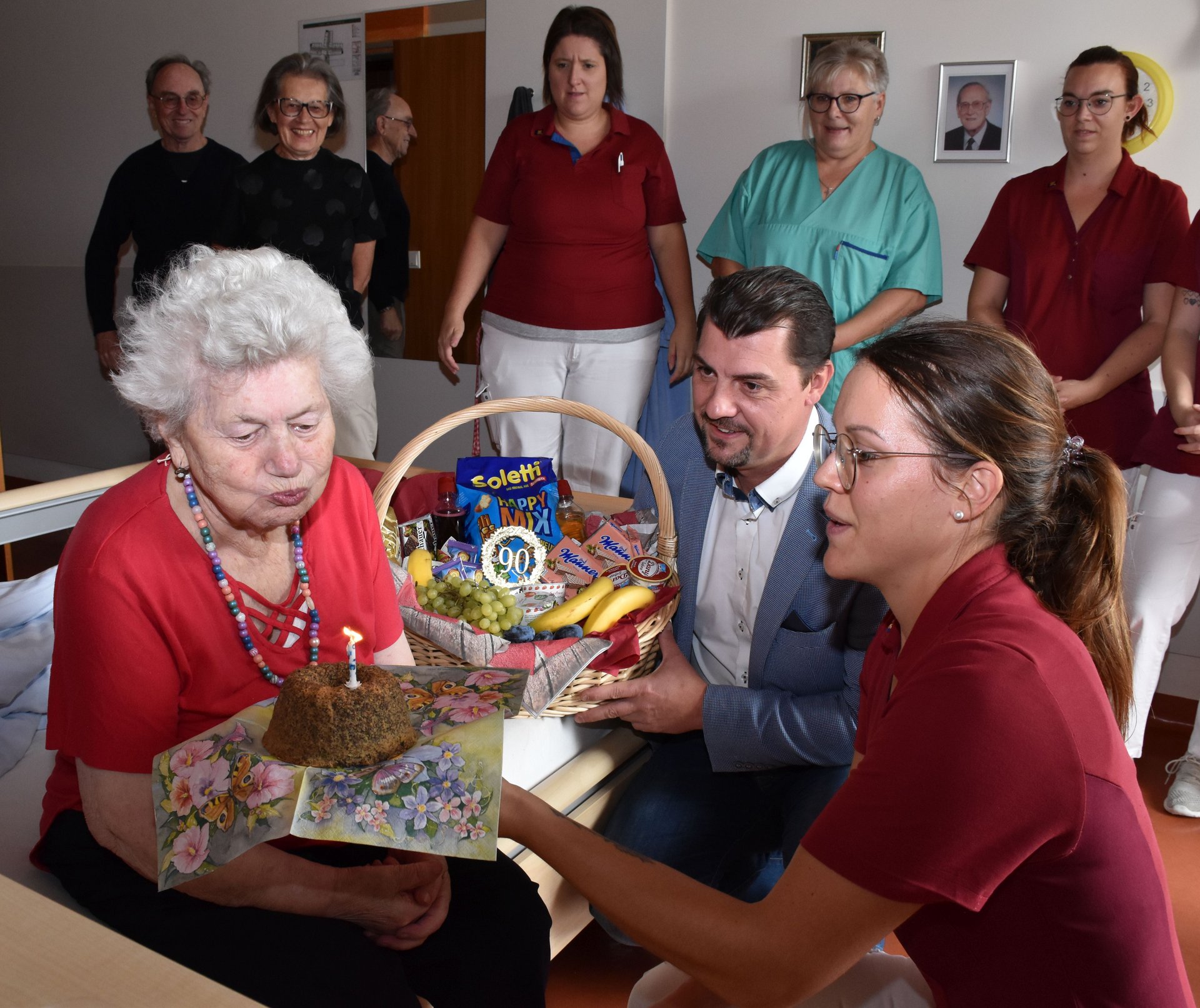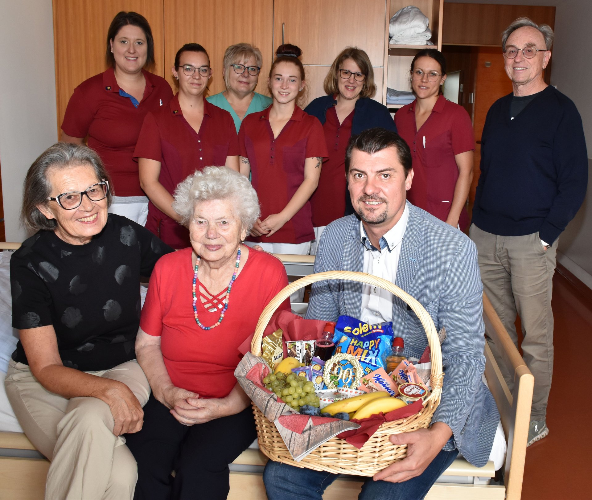 Zum 90. Geburtstag wurde unsere liebe Fr. Elisabeth Arnberger im Zimmer überrascht. Dir. Rainer Hirschmann gratulierte mit einem Geschenkskorb und die Kolleginnen vom WBR 2 statteten der Jubilarin einen Besuch ab und brachten einen Kuchen mit!