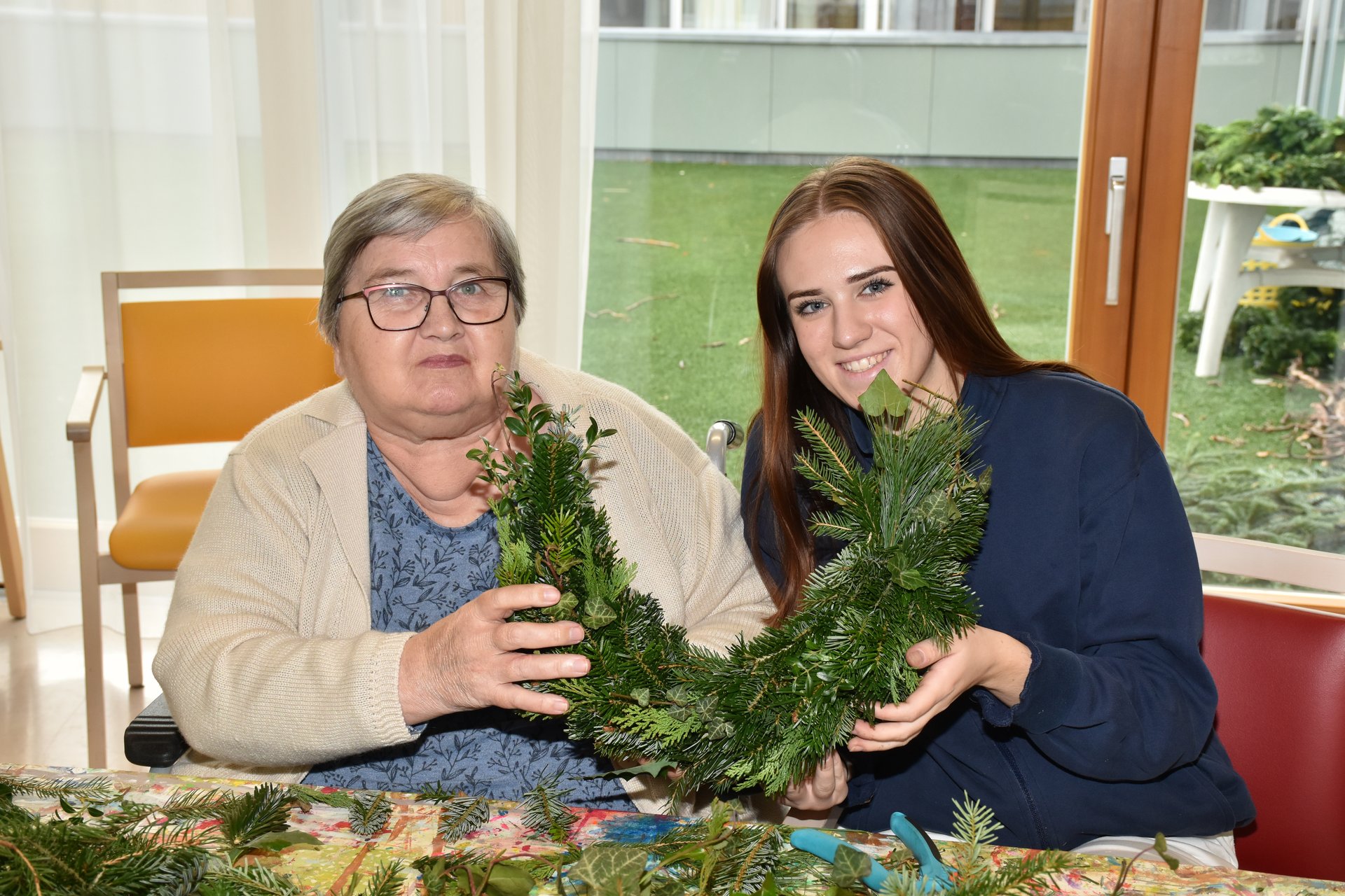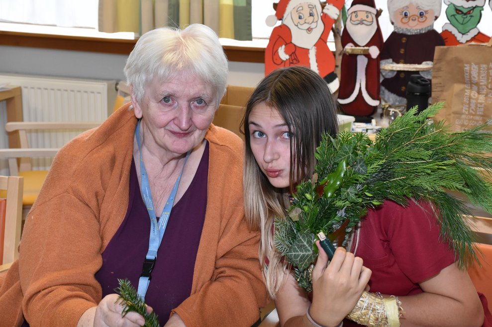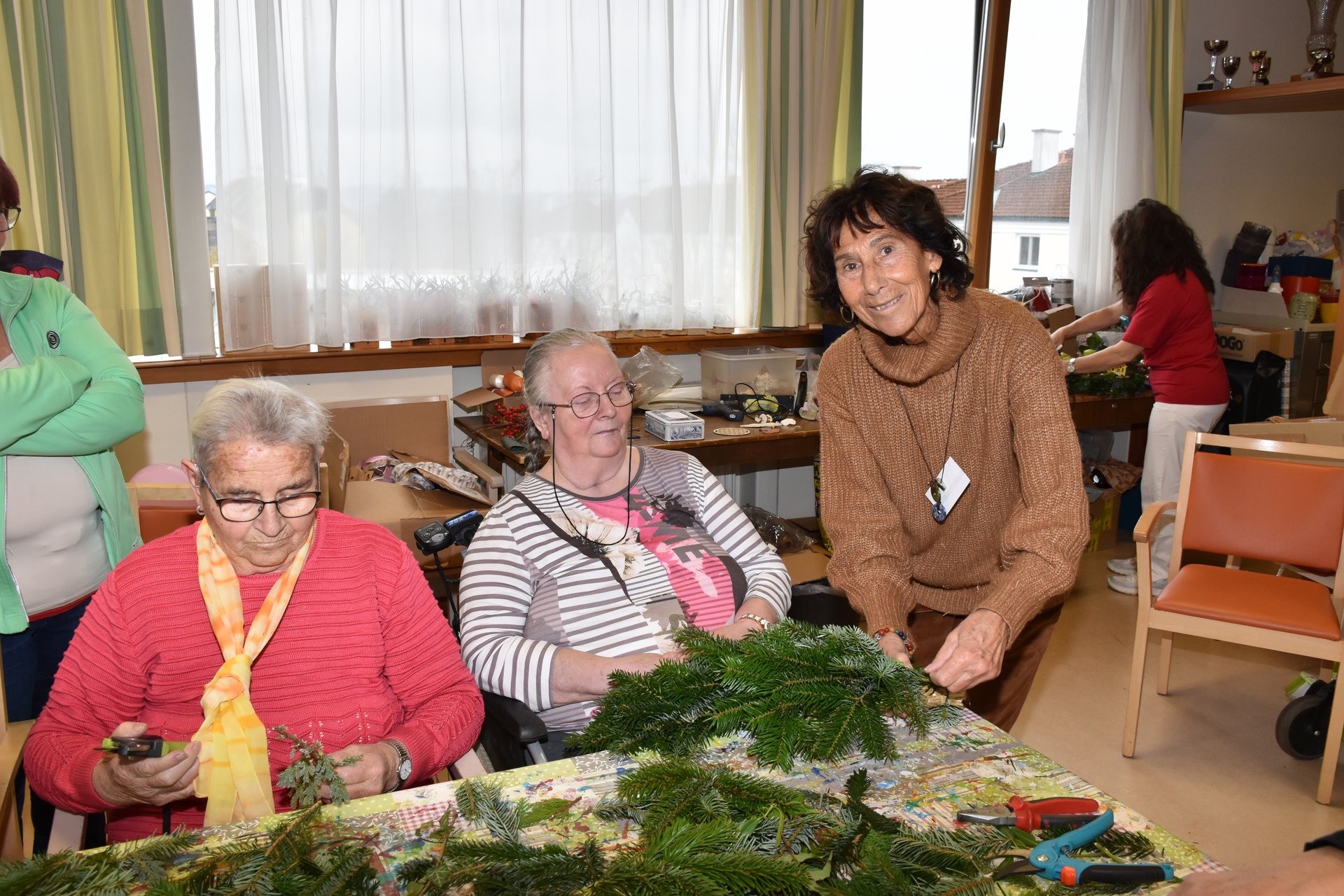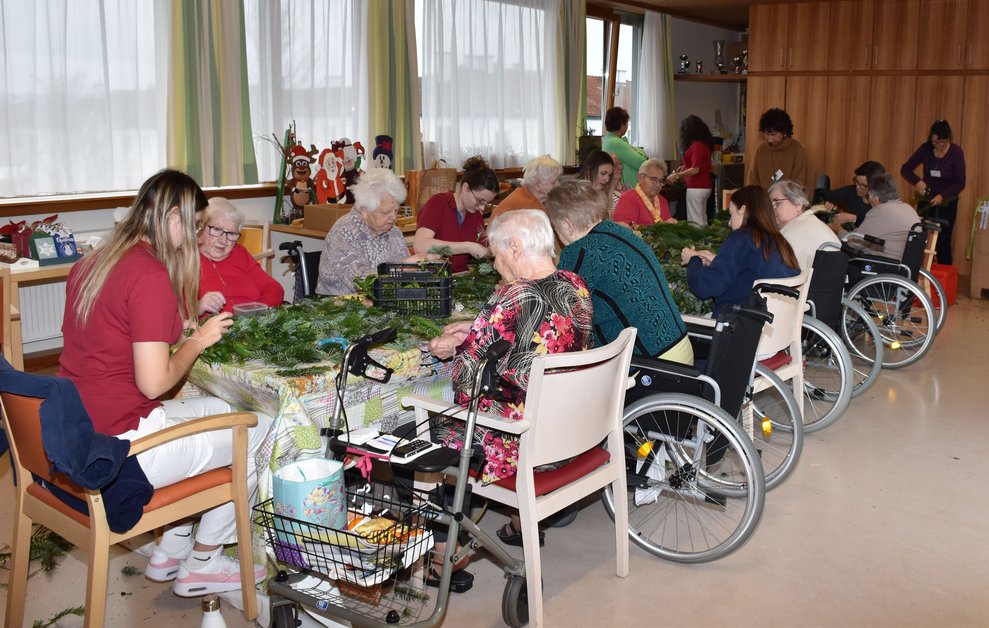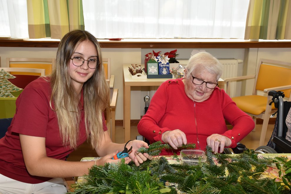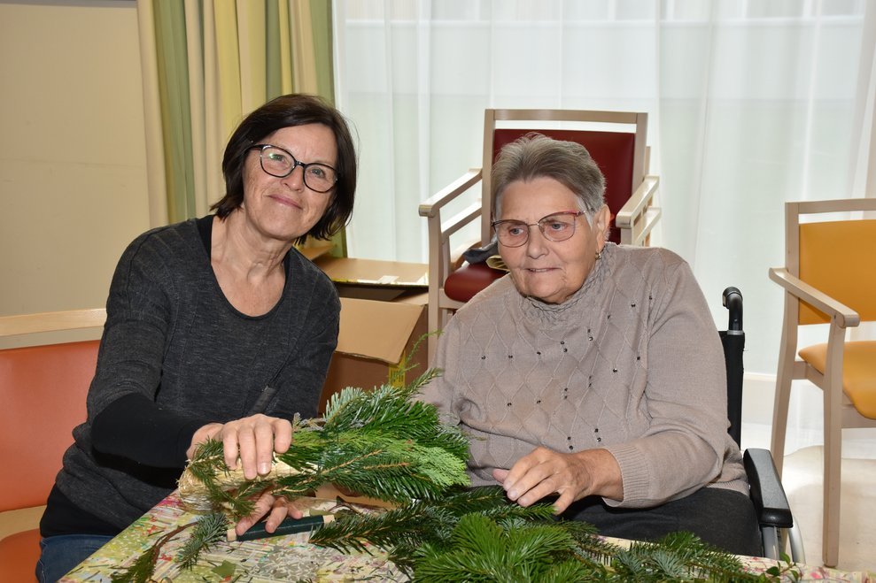 Der, der weiß wie es geht, tut sich leicht - der, der es nicht weiß, kann es aber erlernen! Die Rede ist vom Adventkranzbinden! Es gibt verschiedene Techniken und zahlreiche Tipps dazu, aber wie haben wohl unsere Bewohnerinnen die Kränze früher gemacht? Eine allgemein gültige Antwort darauf habe ich beim gemeinsamen Binden nicht gefunden, doch eines wurde mir sehr rasch klar: Die Damen können es einfach, haben es einfach drauf! Respekt vor diesen geschickten Händen!