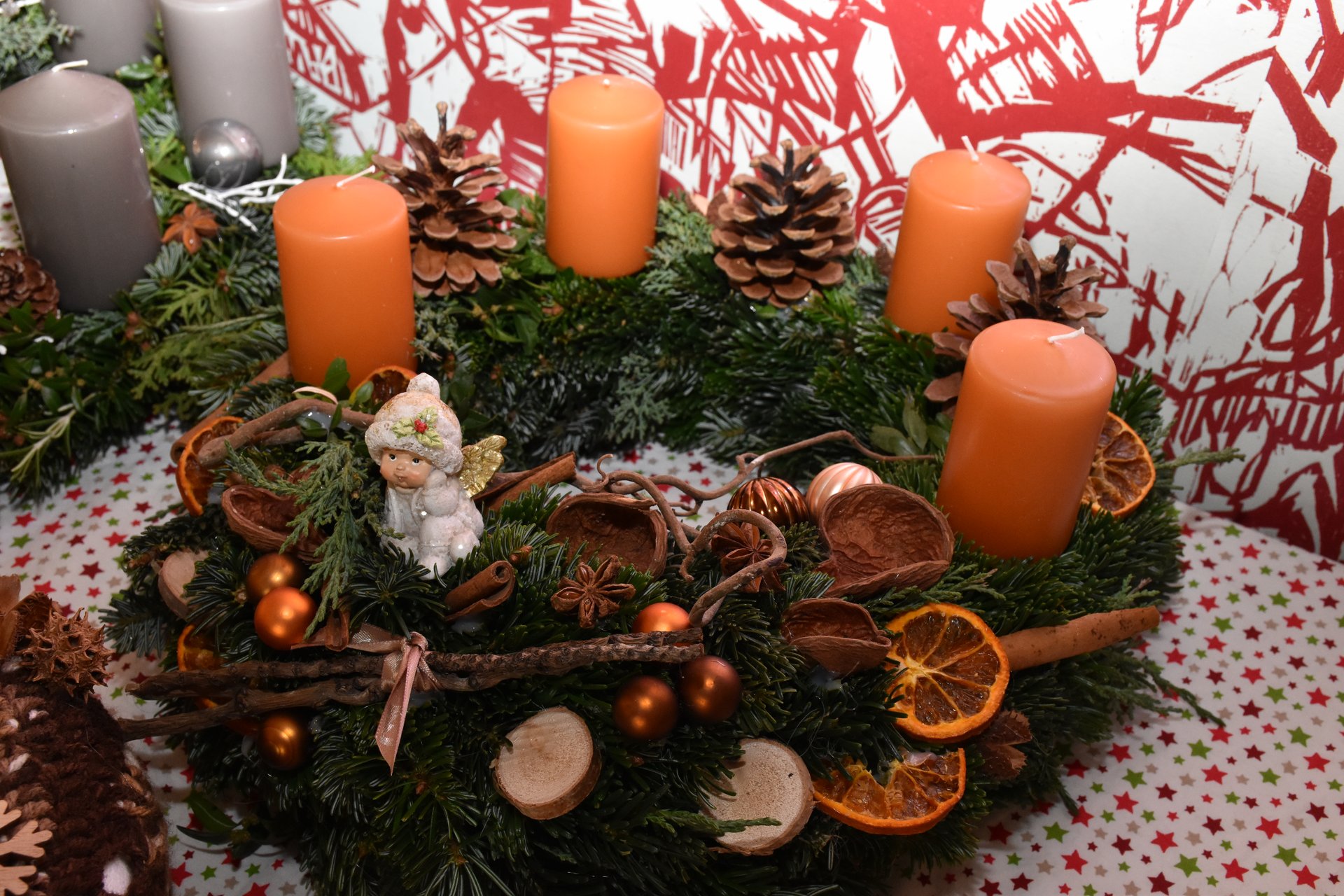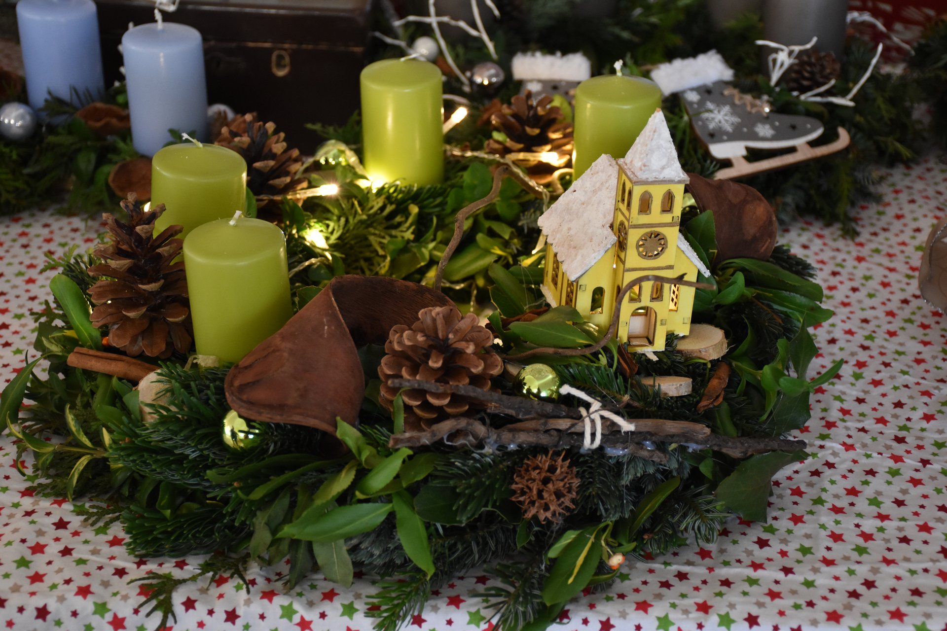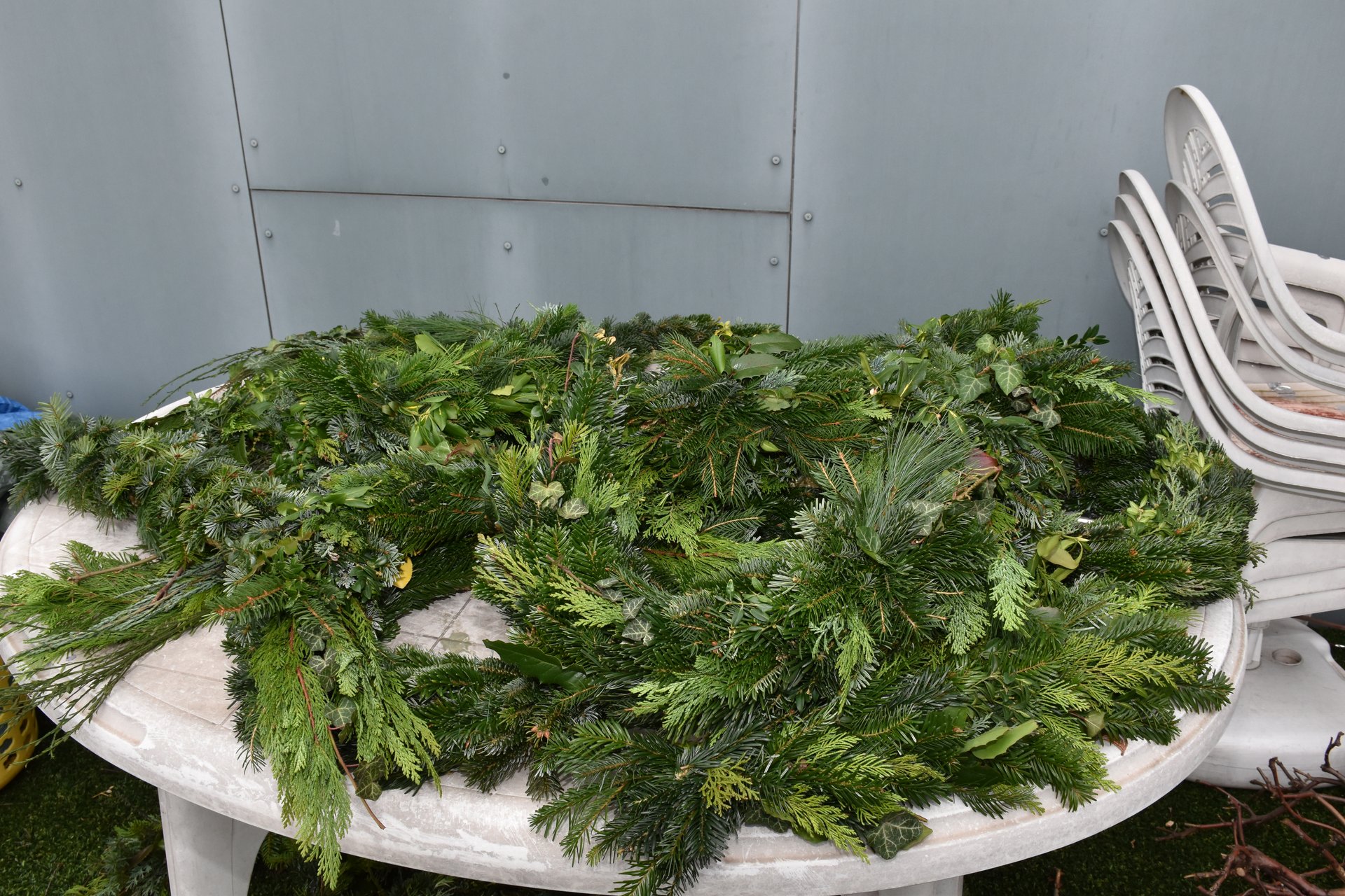 Adventkranz binden für den Weihnachtsmarkt.
