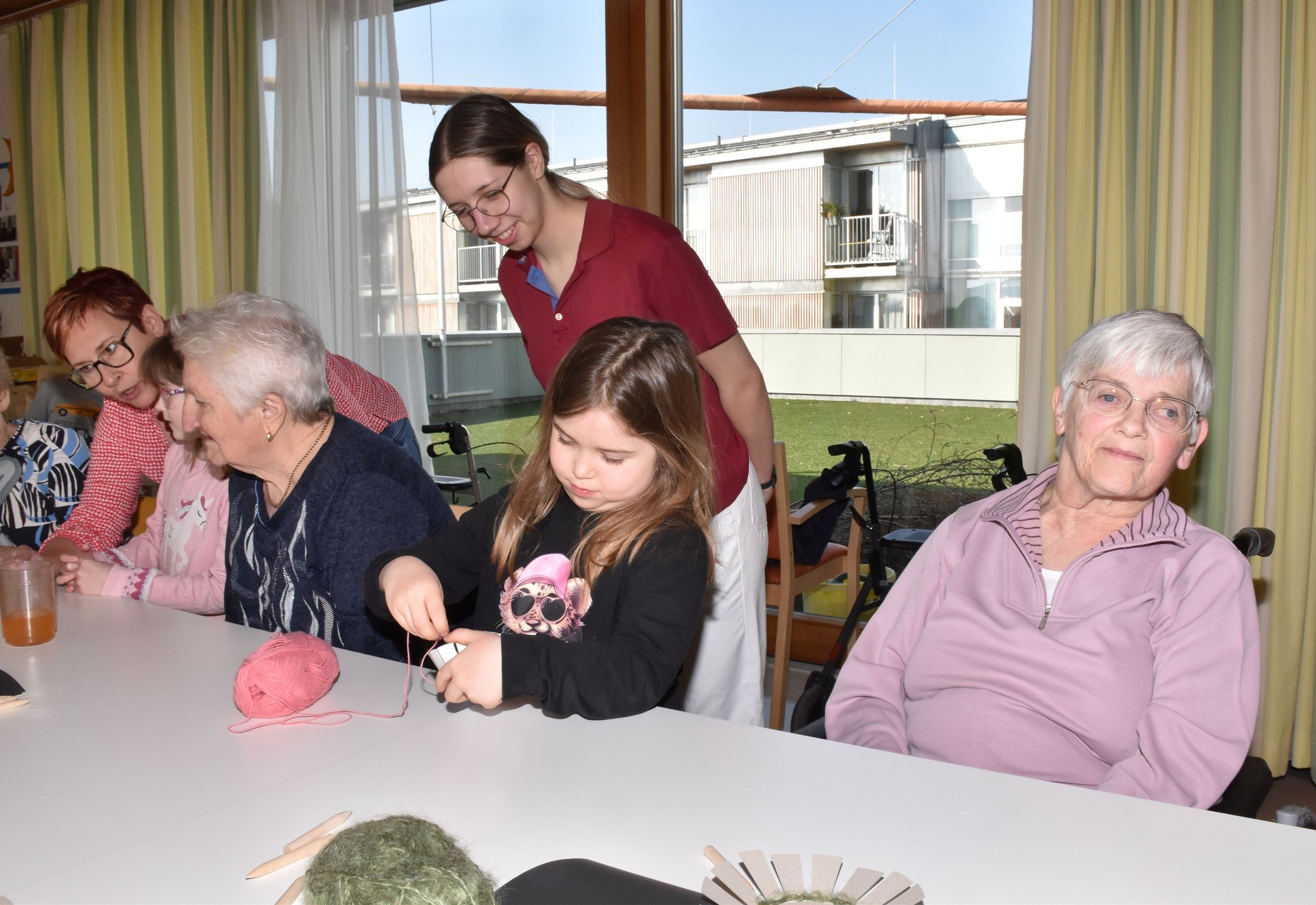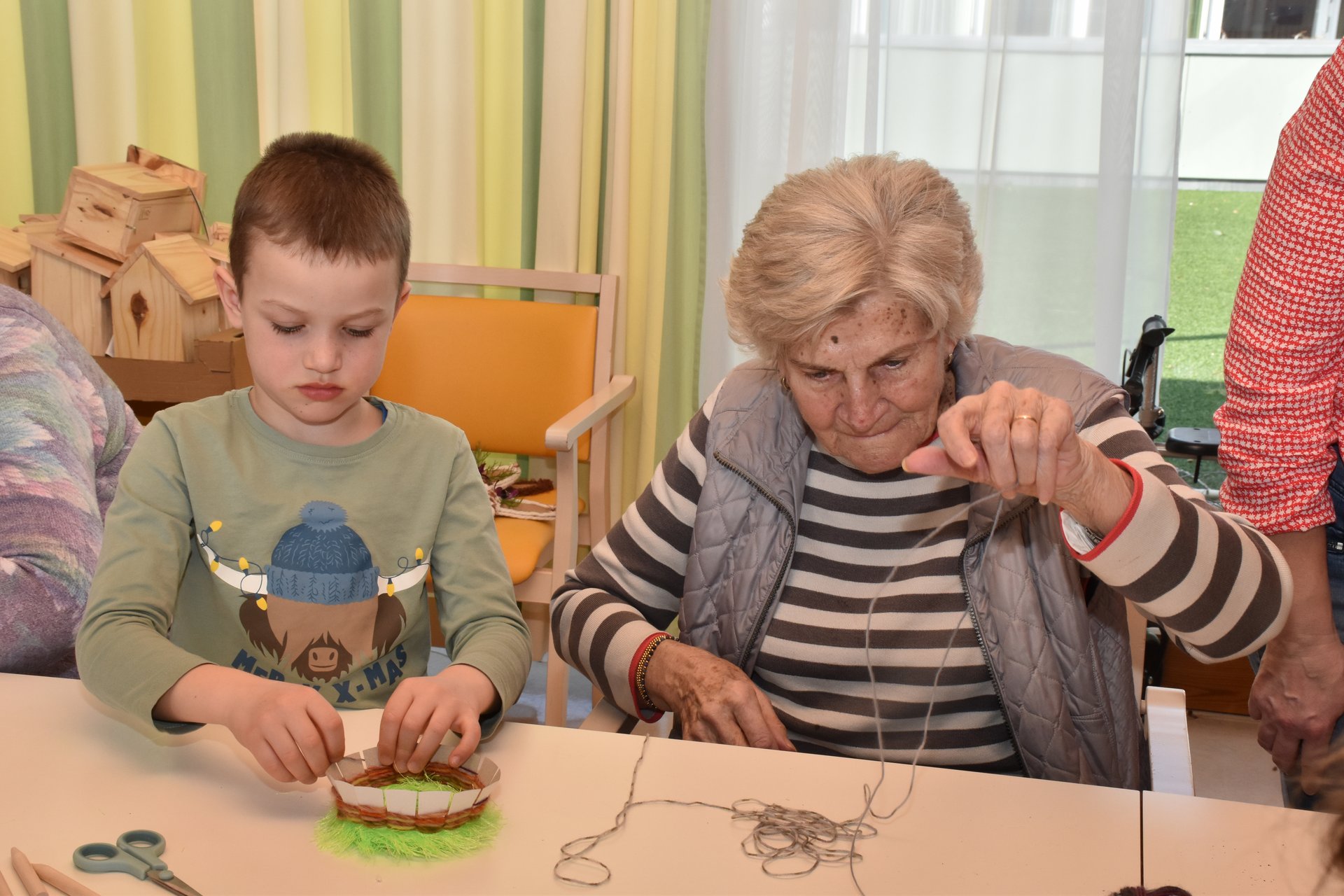 Wir basteln für den Osterhasen, denn schließlich braucht er ja ein geeignetes Körbchen oder Nest, um die bunten Eier und Schokolade darin zu verstecken. Darum werden seit 10 Uhr vormittags auch fleißig Körberl geflochten und vorbereitet. Die Kinder bekommen dabei von unseren Bewohnerinnen und Bewohnern sowie von Ehrenamtlichen große Unterstützung. Was die Kinder zu diesem Zeitpunkt noch nicht wissen: Der Osterhase kommt bei uns ein bisserl früher und wird heute schon etwas ins Nesterl legen. Schließlich sollte man für den Besuch der Kinder auch gebührend danke sagen!