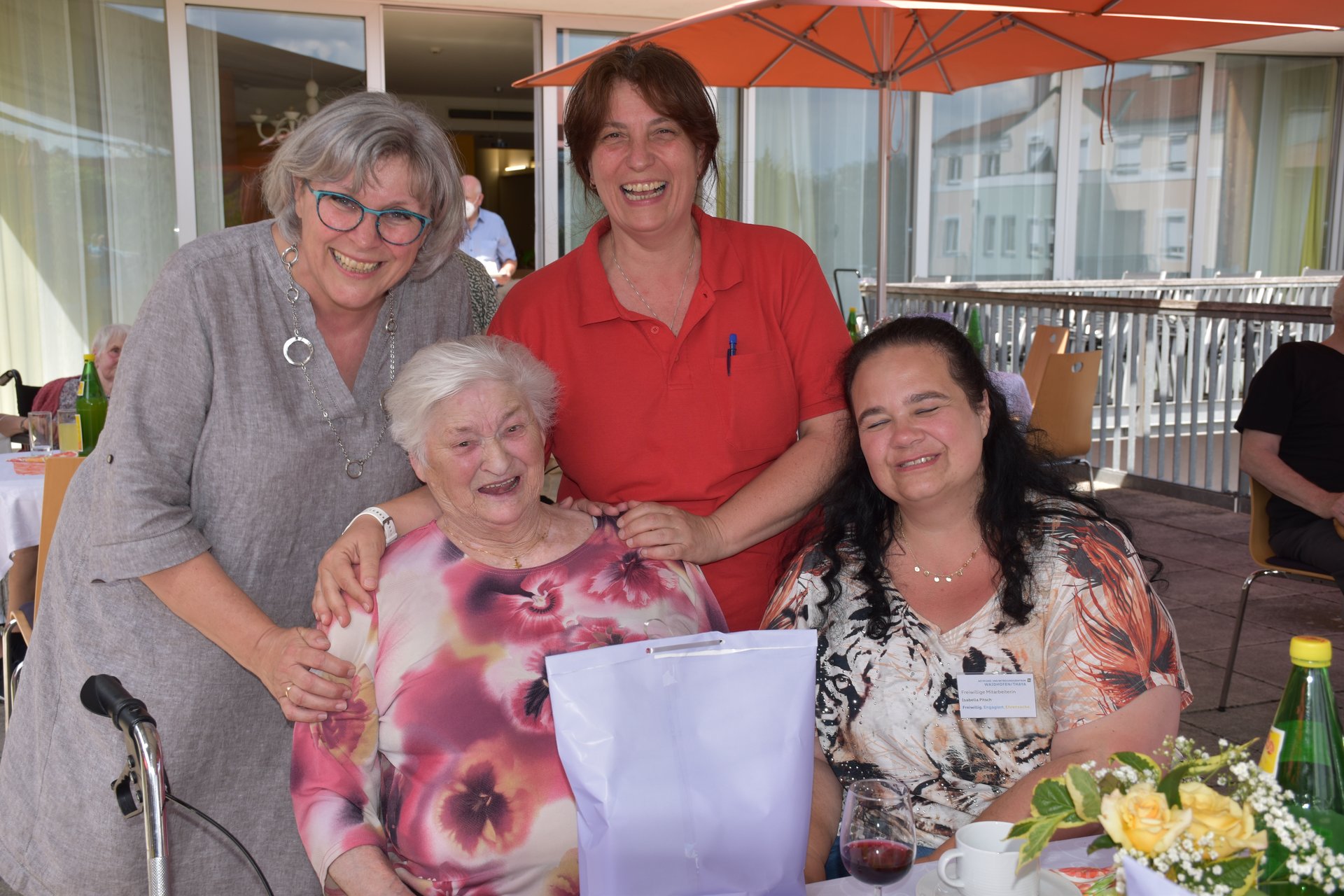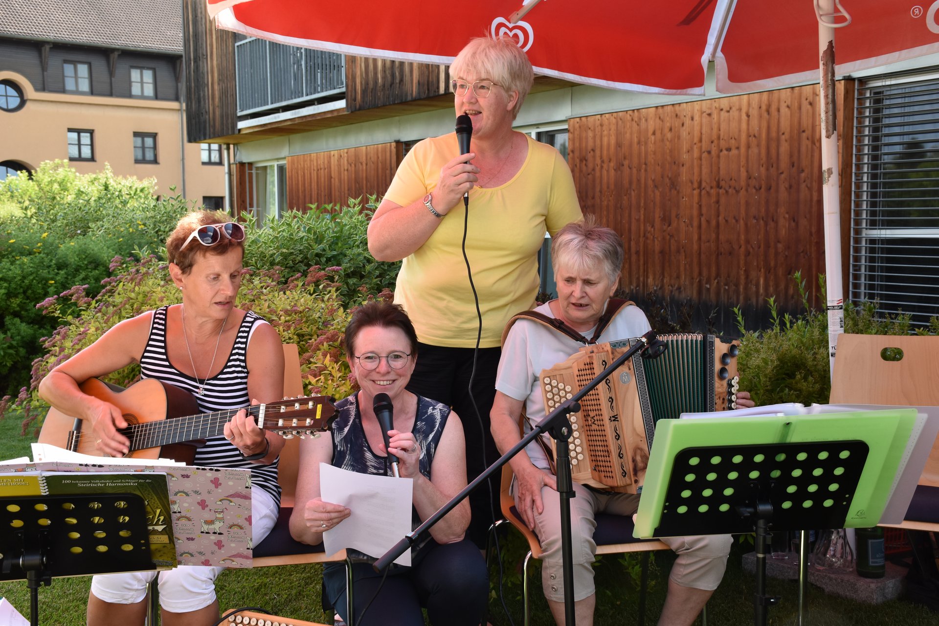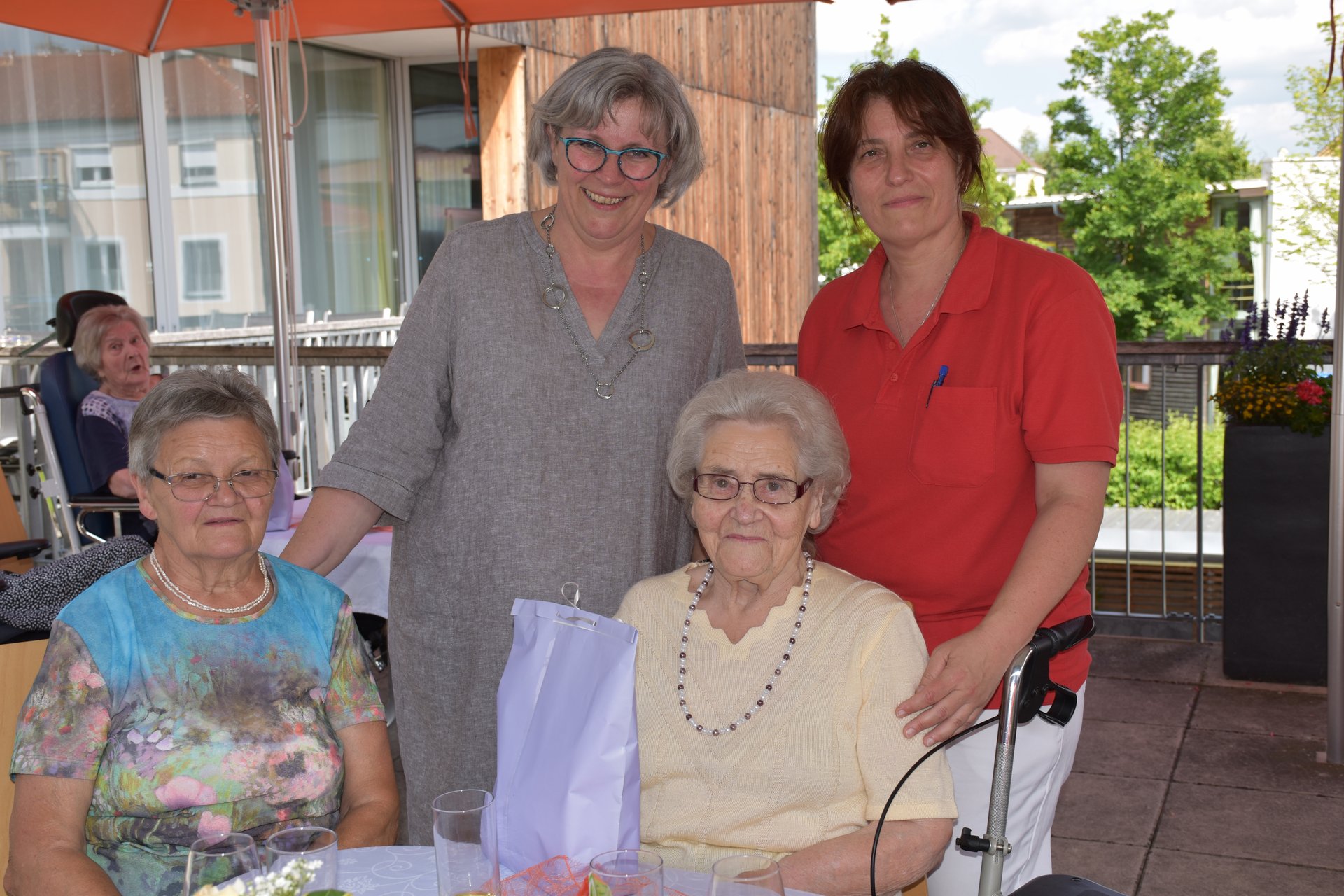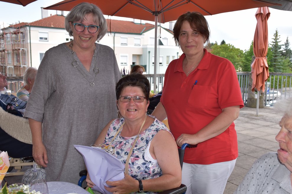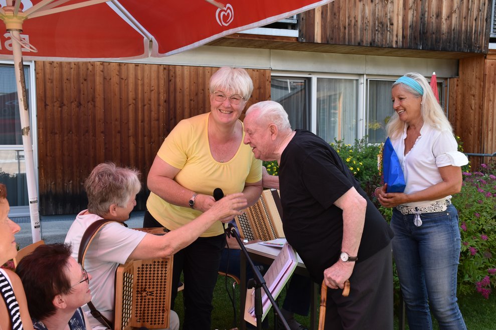 Im Garten des Hauses und bei wunderschönem Wetter fand die Geburtstagsfeier aller im Mai und Juni geborenen Bewohnerinnen und Bewohner statt! Für die tolle Stimmung, Musik und Gesang, durften wir wieder unsere Freiwilligen Mitarbeiterinnen und Mitarbeiter Karin Hölzl, Gertrude Dangl, Mathilde Perzi, Christa Wanko und Herbert Ecker bei uns begrüßen!
