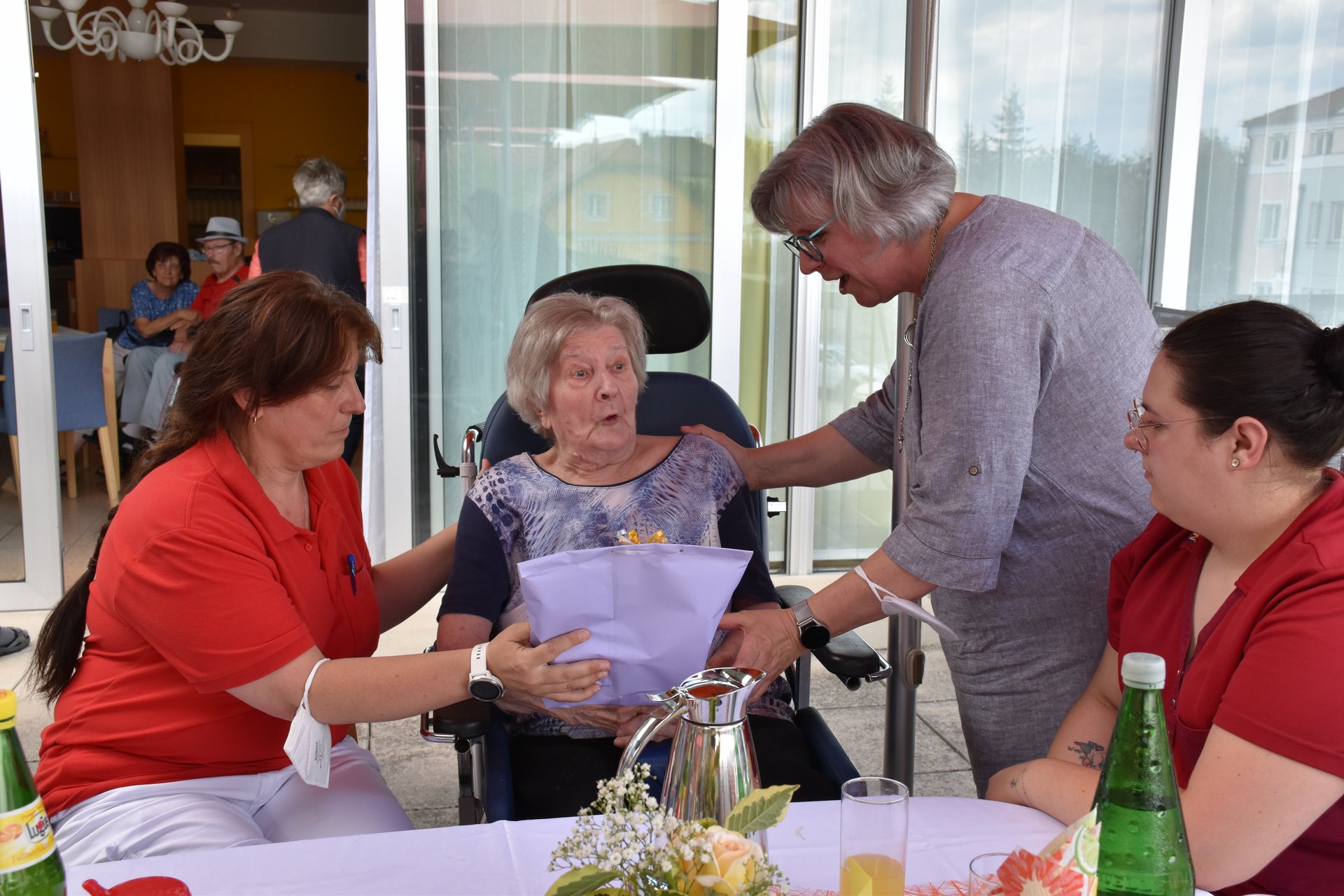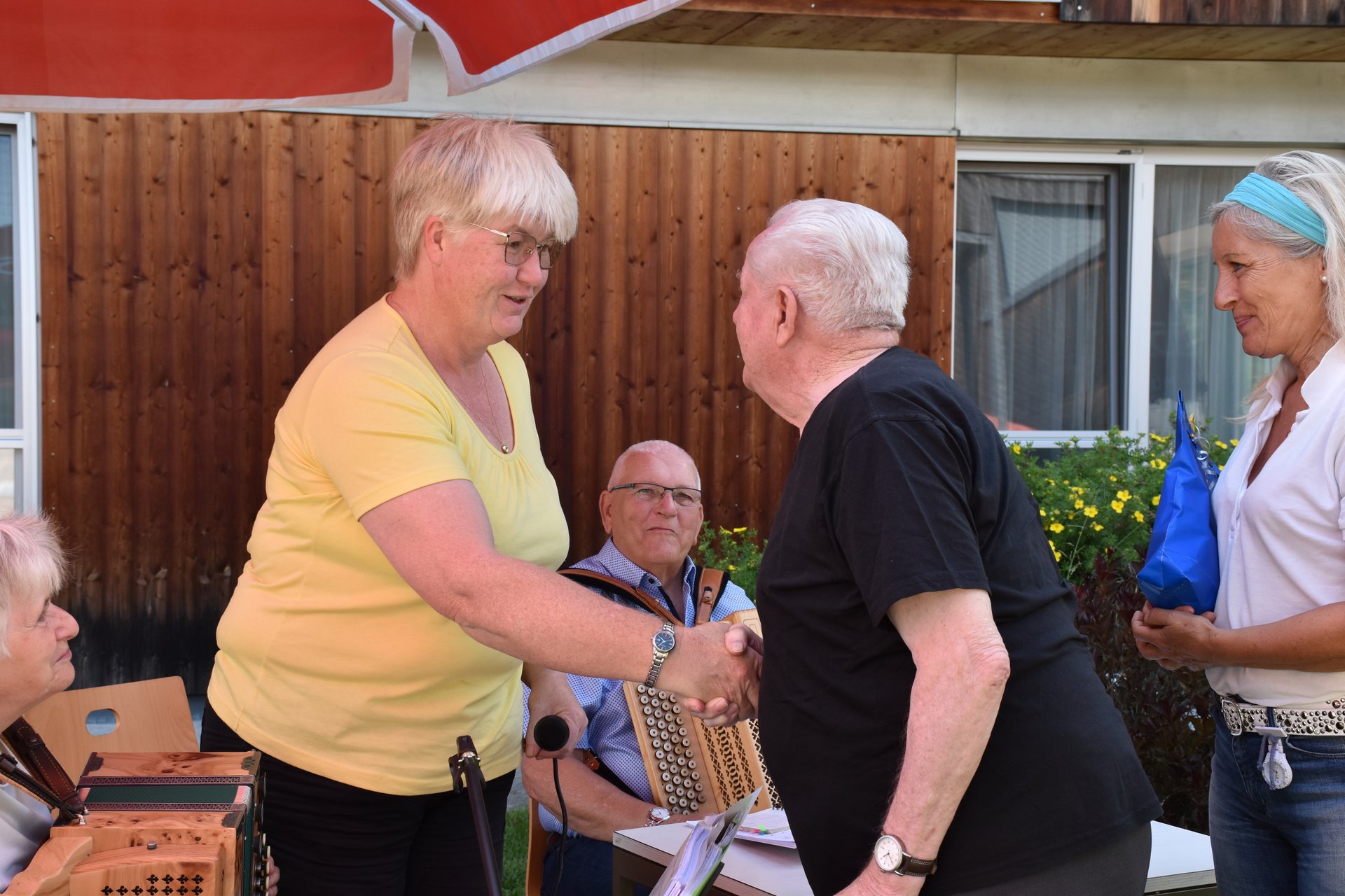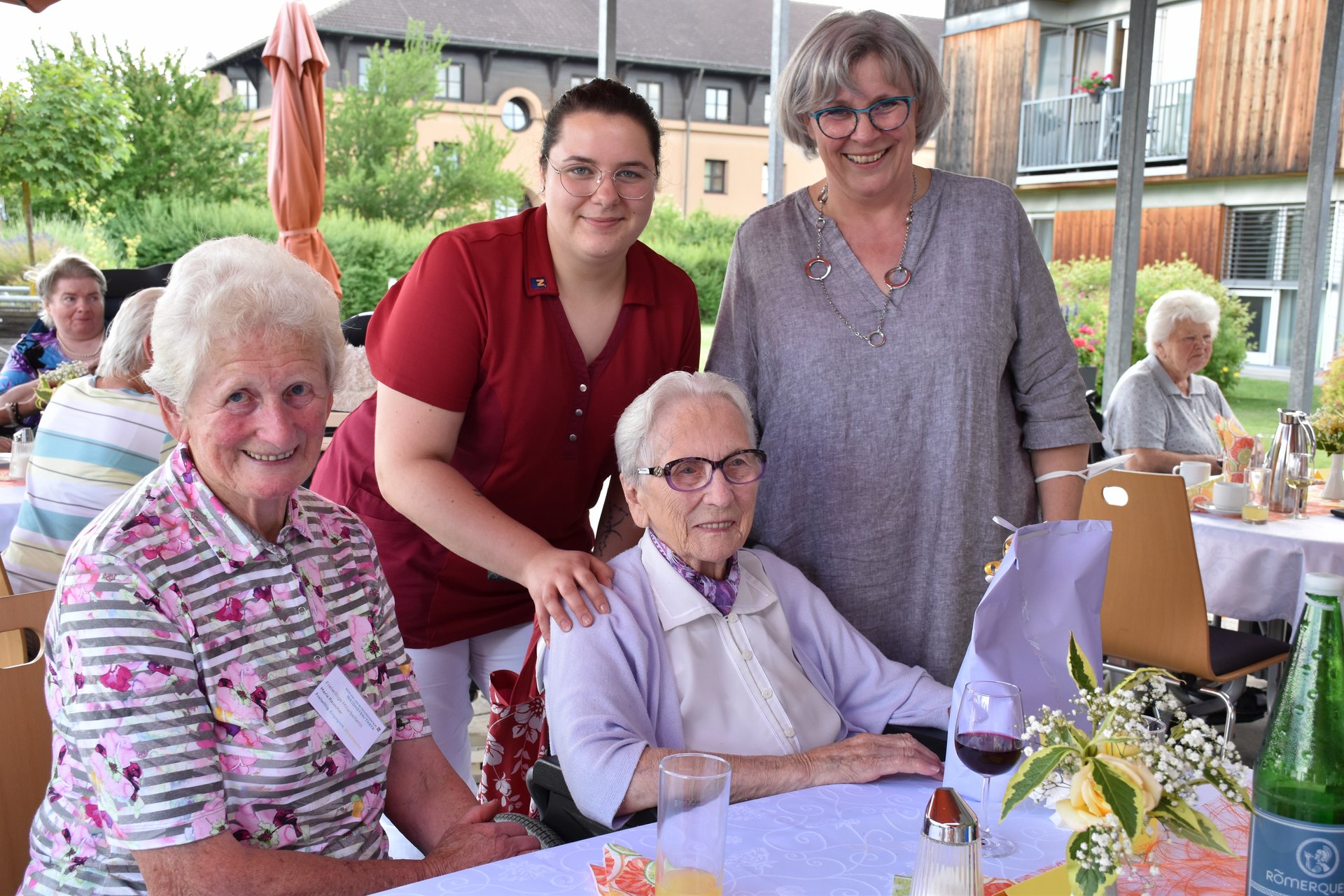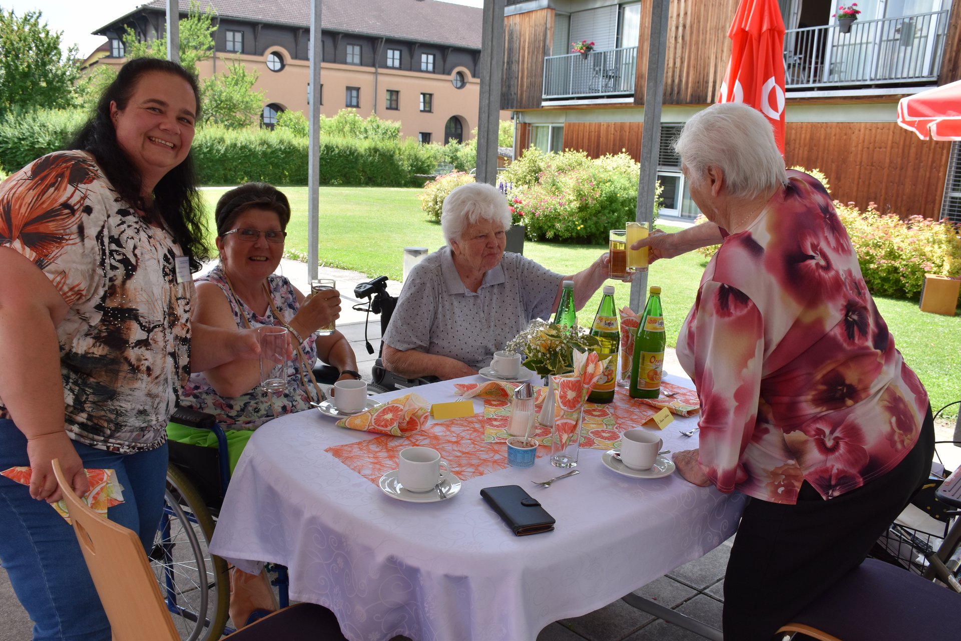 Im Garten des Hauses und bei wunderschönem Wetter fand die Geburtstagsfeier aller im Mai und Juni geborenen Bewohnerinnen und Bewohner statt! Für die tolle Stimmung, Musik und Gesang, durften wir wieder unsere Freiwilligen Mitarbeiterinnen und Mitarbeiter Karin Hölzl, Gertrude Dangl, Mathilde Perzi, Christa Wanko und Herbert Ecker bei uns begrüßen!