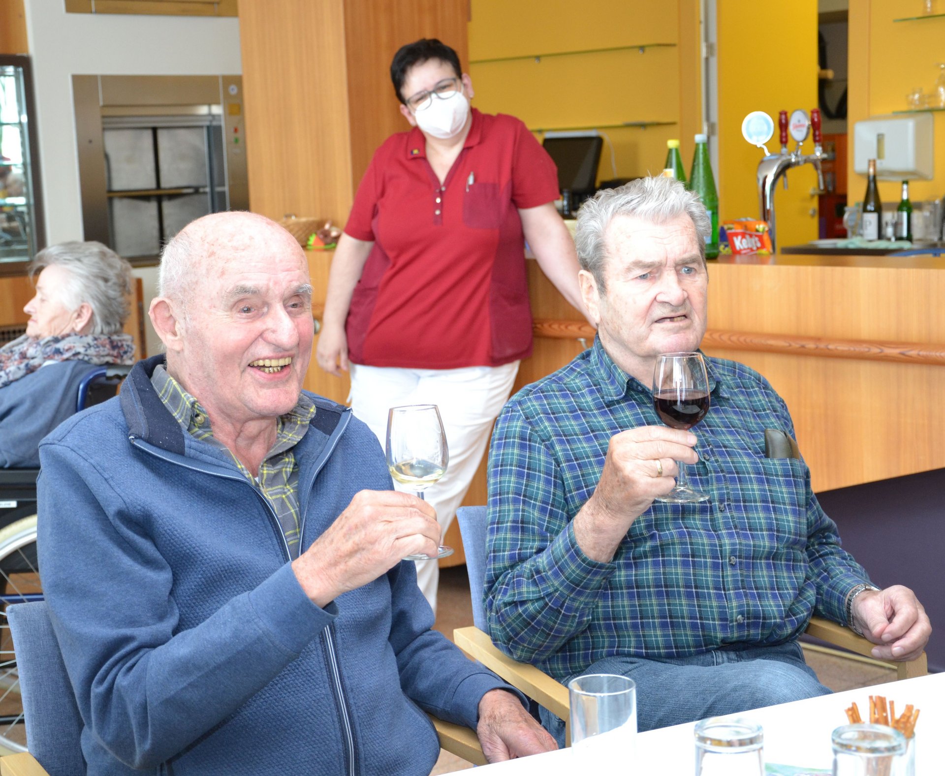 Die Cafeteria ist mehr als nur ein Ort zum Kaffeetrinken. Es ist fast schon ein erweitertes Wohnzimmer mit besonderer Atmosphäre, wo, geplaudert, genossen und gelacht wird. Es ist für die BewohnerInnen ein wichtiger Platz der zum Verweilen einlädt. Hat jeder einen Platz ergattert, gibt man ihn nicht gerne her. Natürlich auch weil aus dem Hintergrund dezente Akkordeon Musik das Wohlfühlen unterstützt. Die BewohnerInnen lieben es und das ganze Team ermöglicht es einen Weg in die Normalität zu gehen!