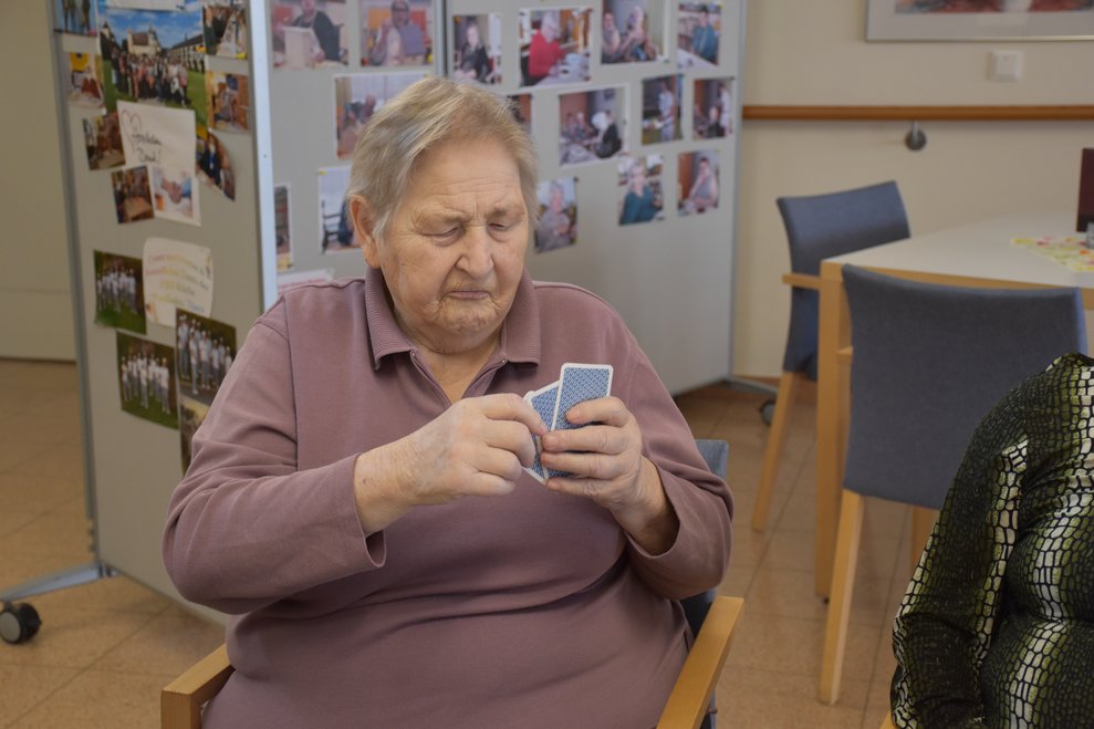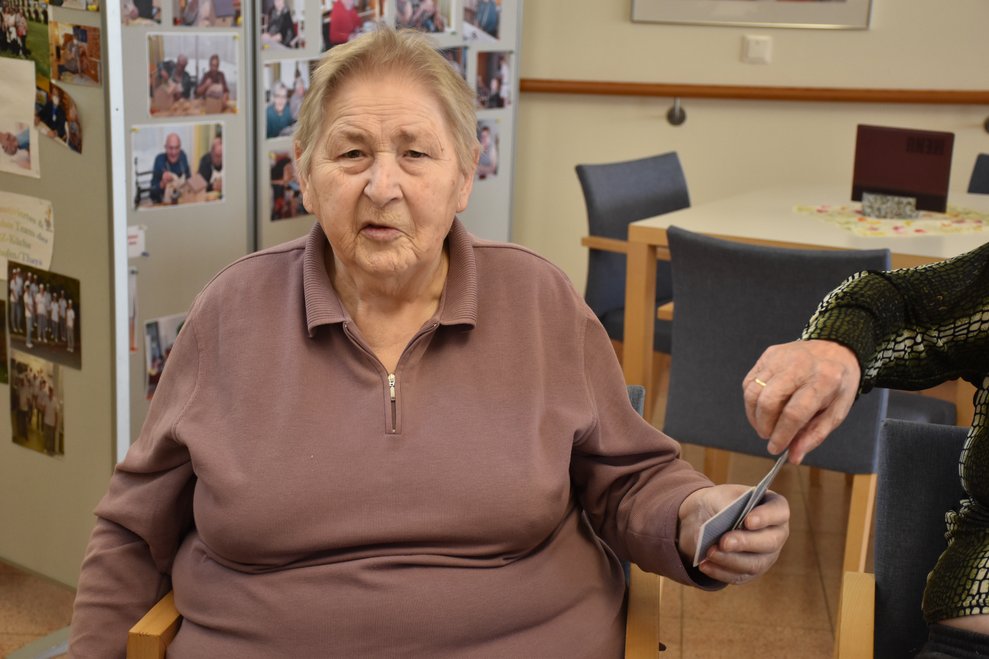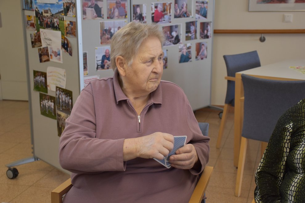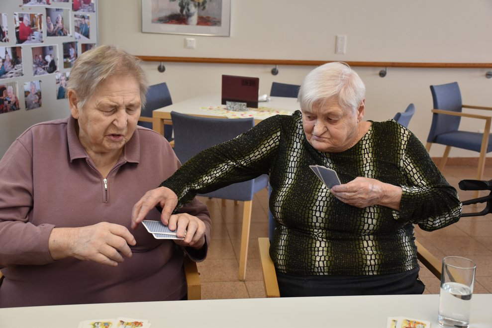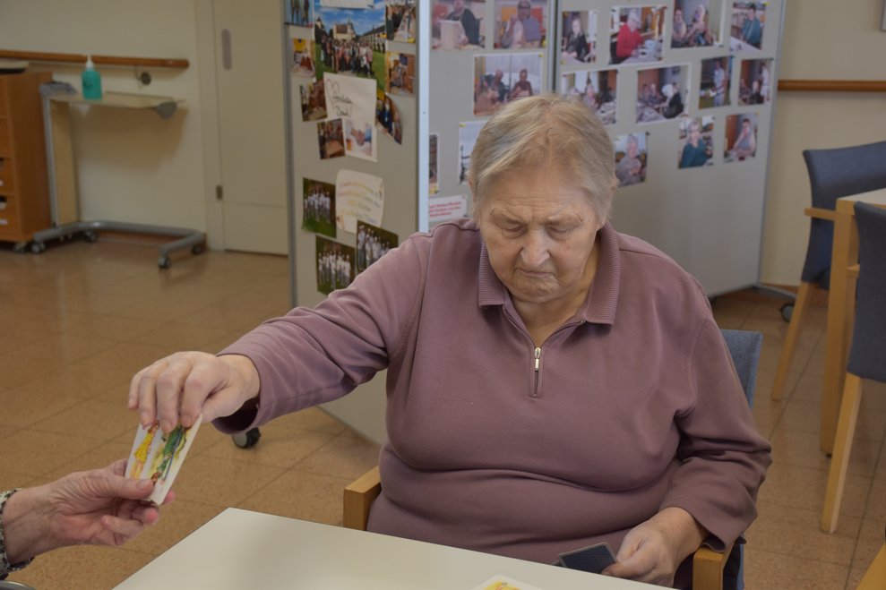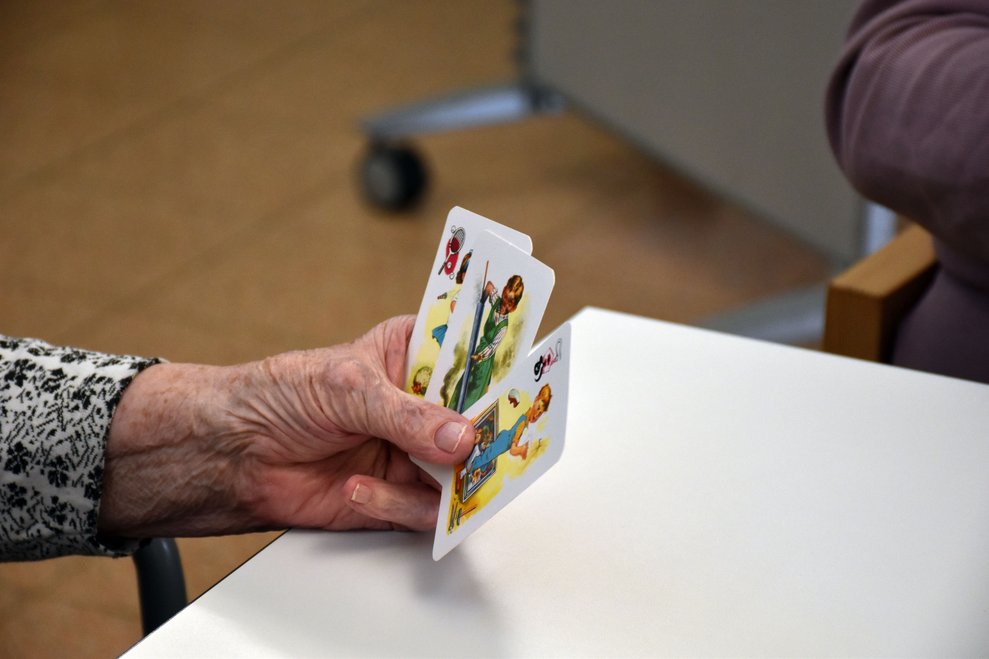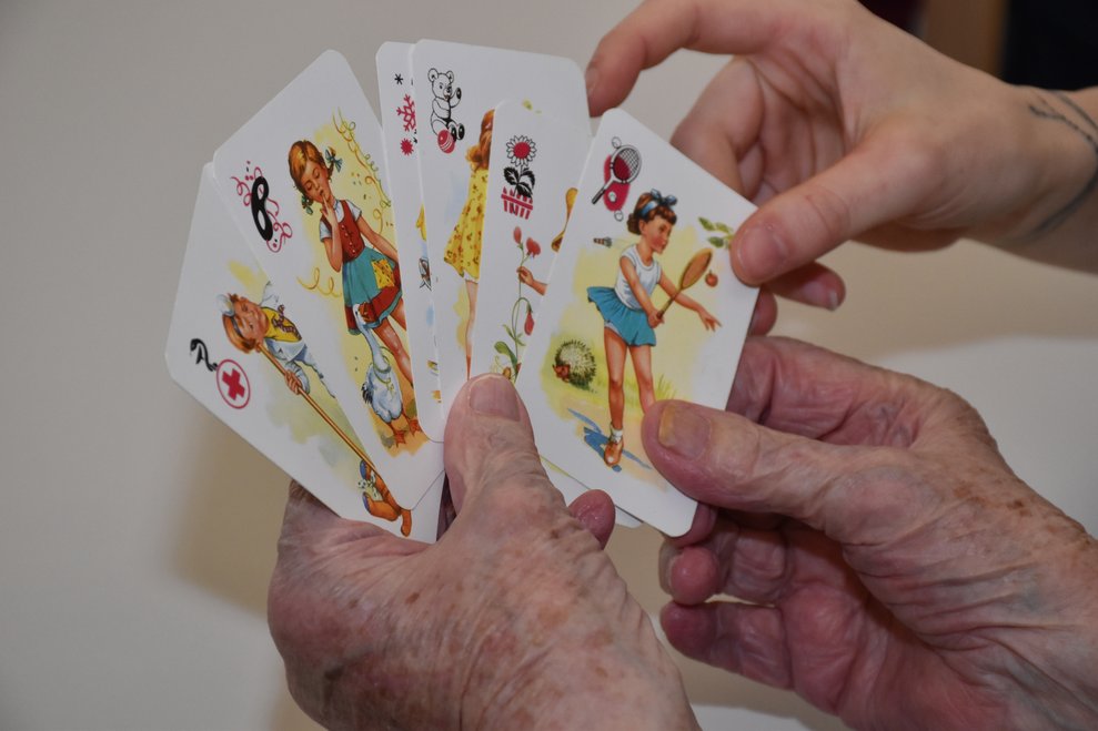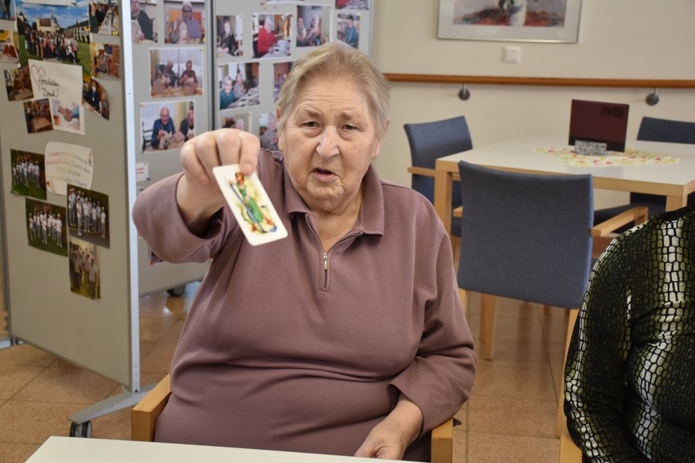 "Schwarzer Peter" ist ein Kartenspiel, an das sich unsere Bewohnerinnen und Bewohner gut erinnern können und es auch noch sehr gerne spielen! Von deren Erzählungen her wissen wir, dass früher dem Verlierer ein schwarzer Punkt auf die Stirn gemalt wurde und dass oft das ganze Gesicht regelrecht schwarz war. Wir haben uns gegenseitig nicht bemalt, doch schauen sie selbst, wie die Spielrunde verlaufen ist!