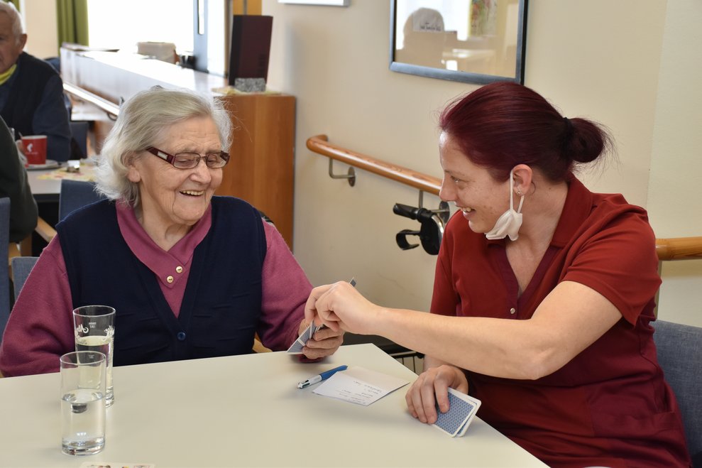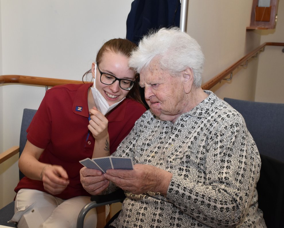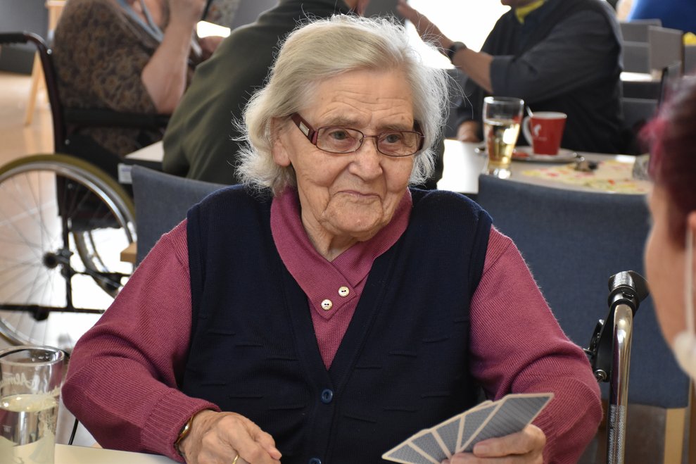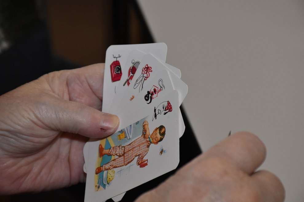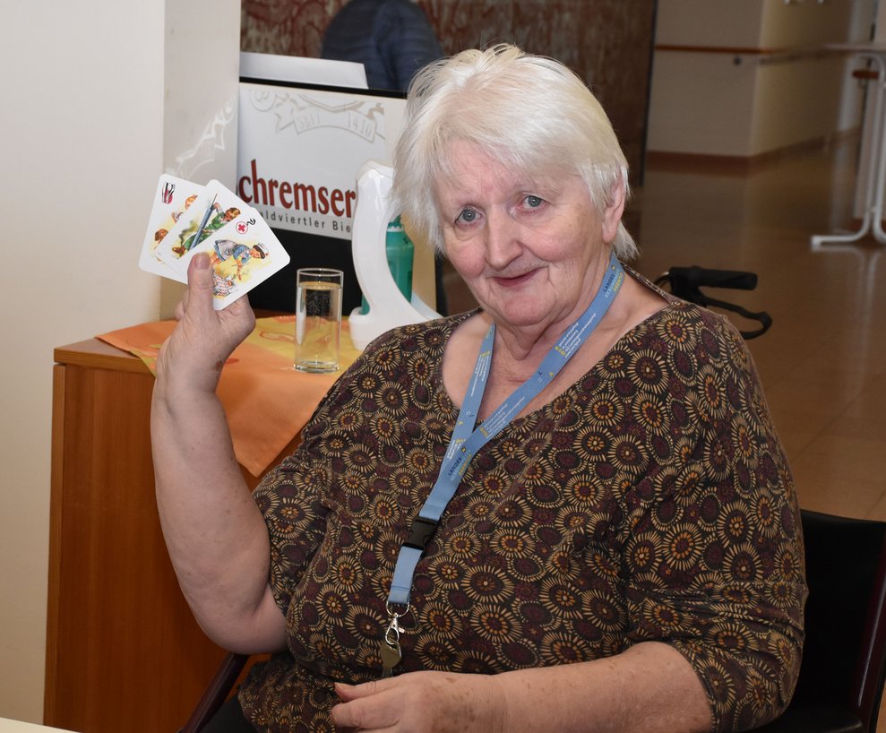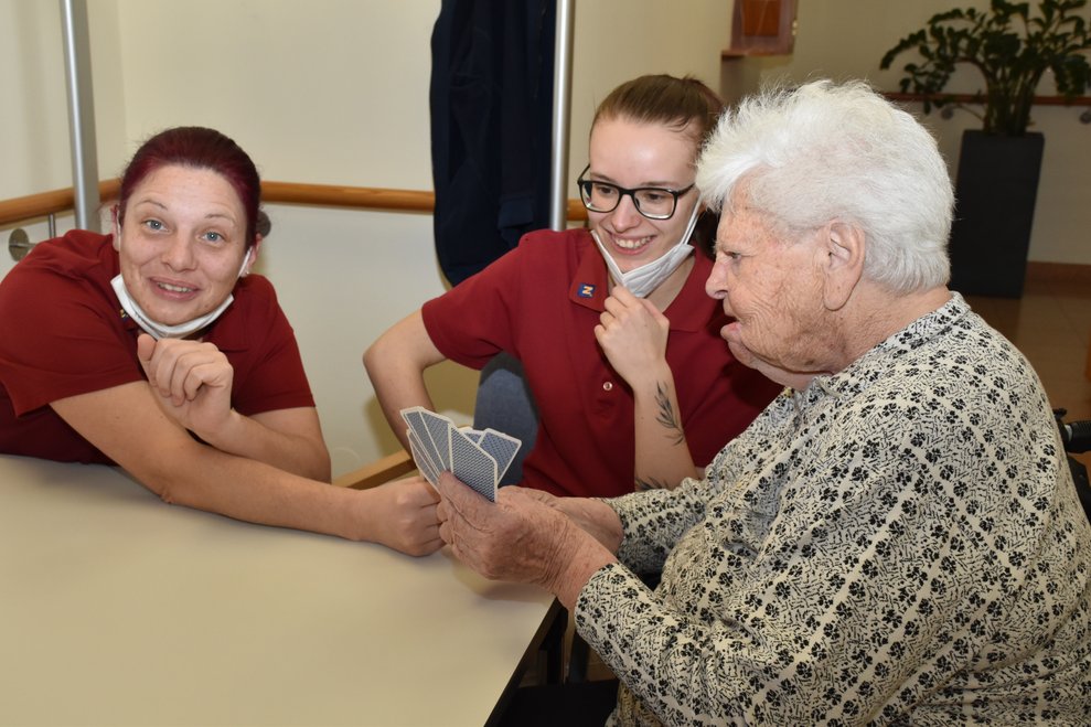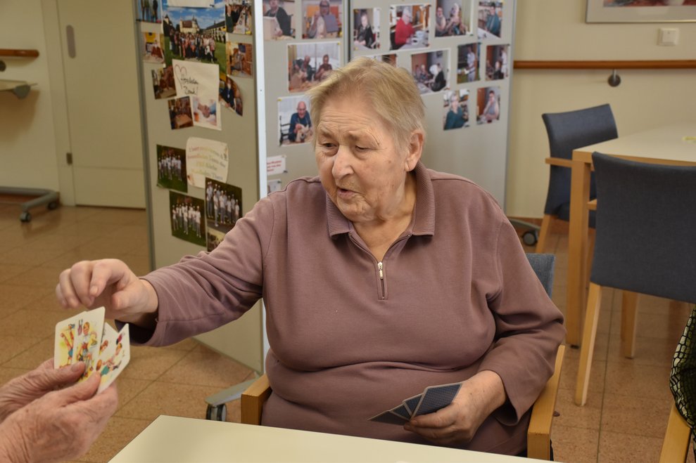 "Schwarzer Peter" ist ein Kartenspiel, an das sich unsere Bewohnerinnen und Bewohner gut erinnern können und es auch noch sehr gerne spielen! Von deren Erzählungen her wissen wir, dass früher dem Verlierer ein schwarzer Punkt auf die Stirn gemalt wurde und dass oft das ganze Gesicht regelrecht schwarz war. Wir haben uns gegenseitig nicht bemalt, doch schauen sie selbst, wie die Spielrunde verlaufen ist!