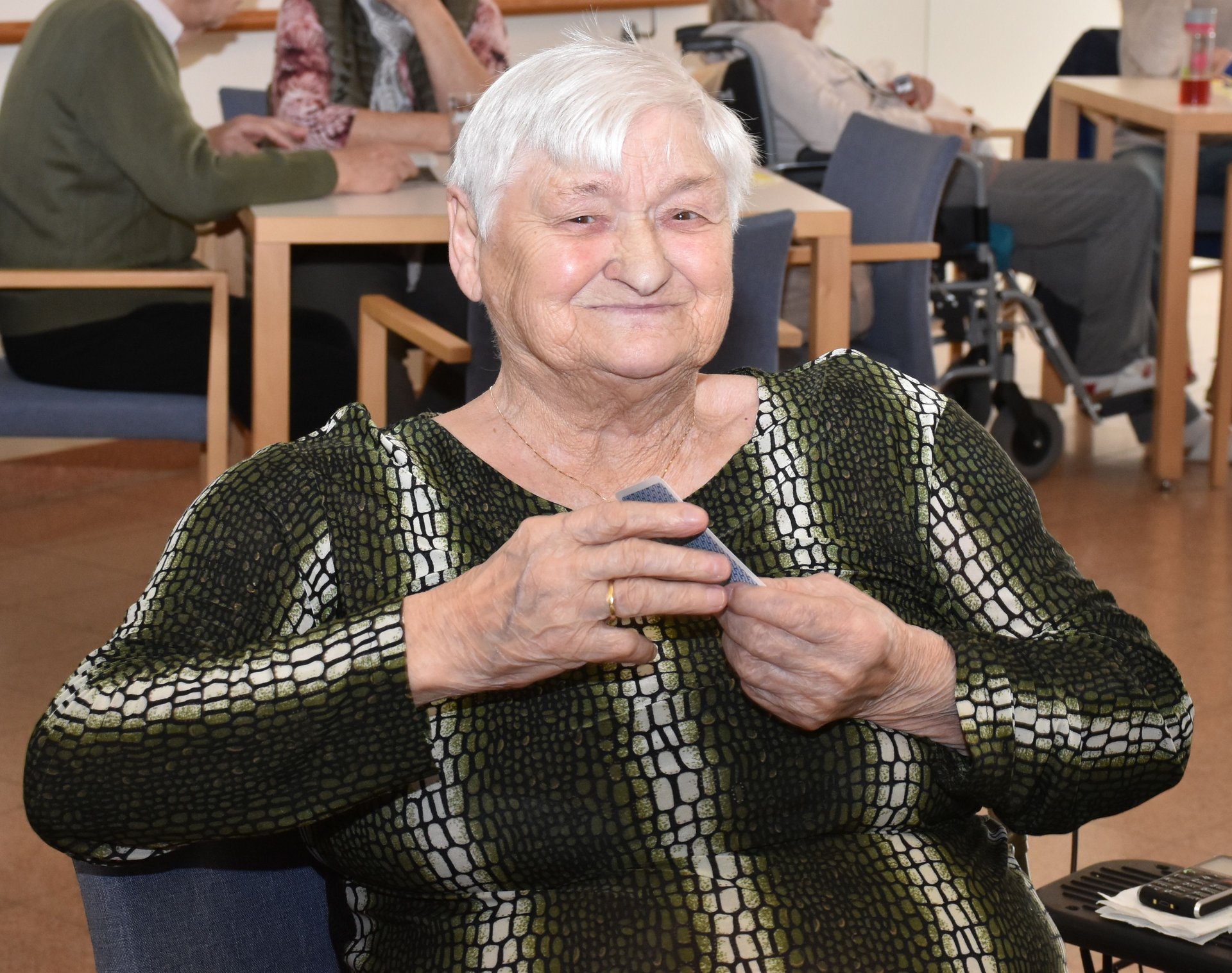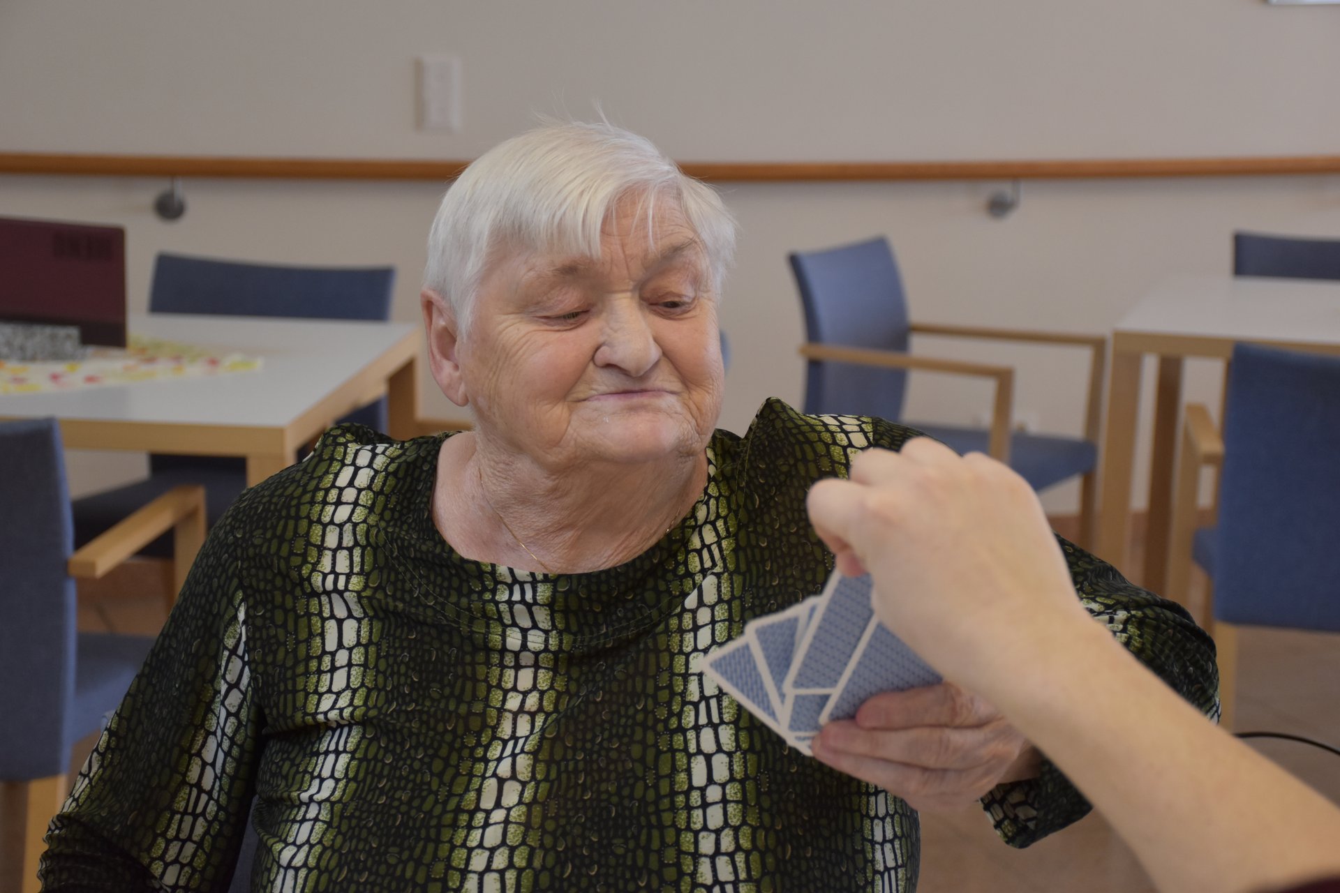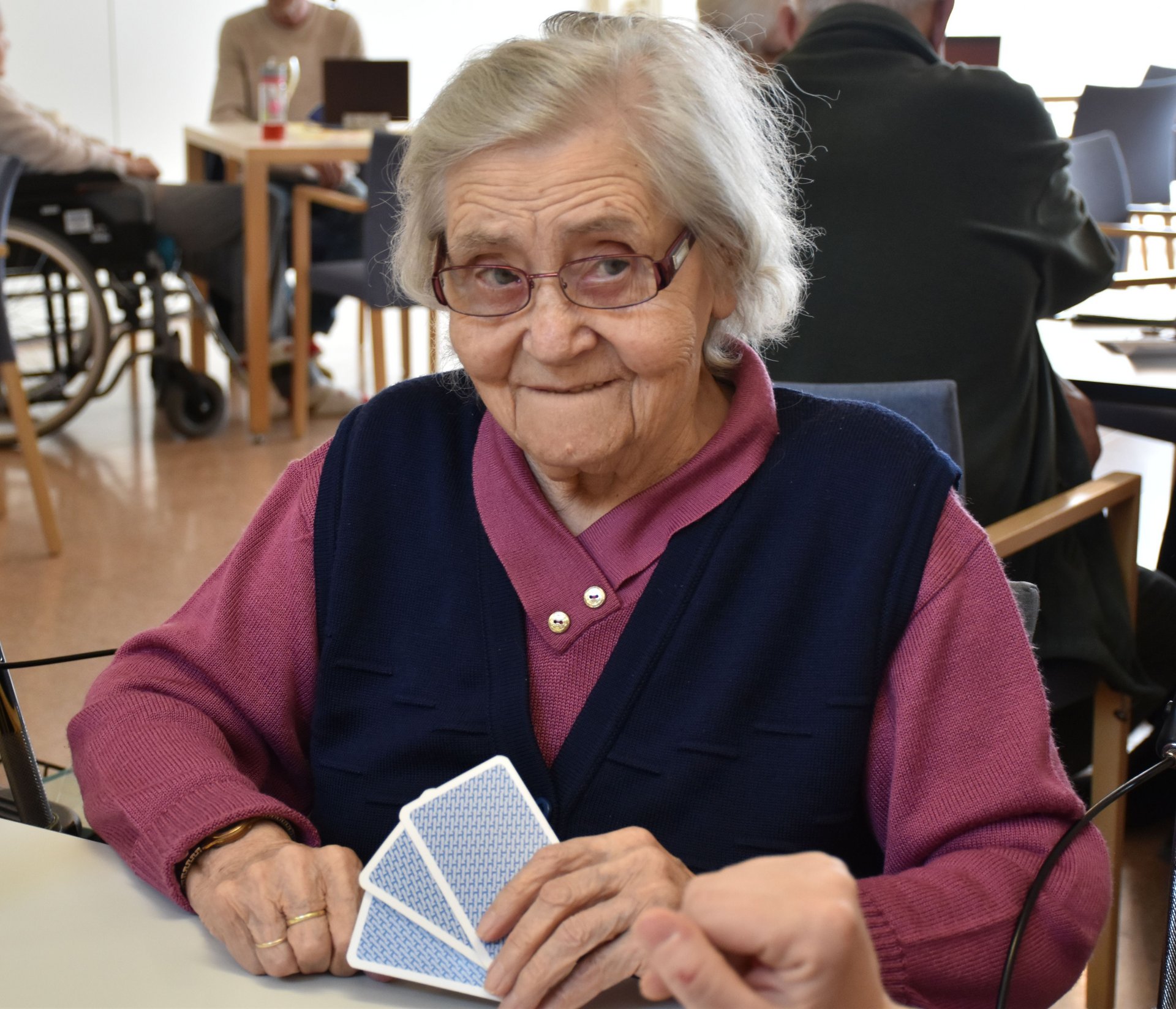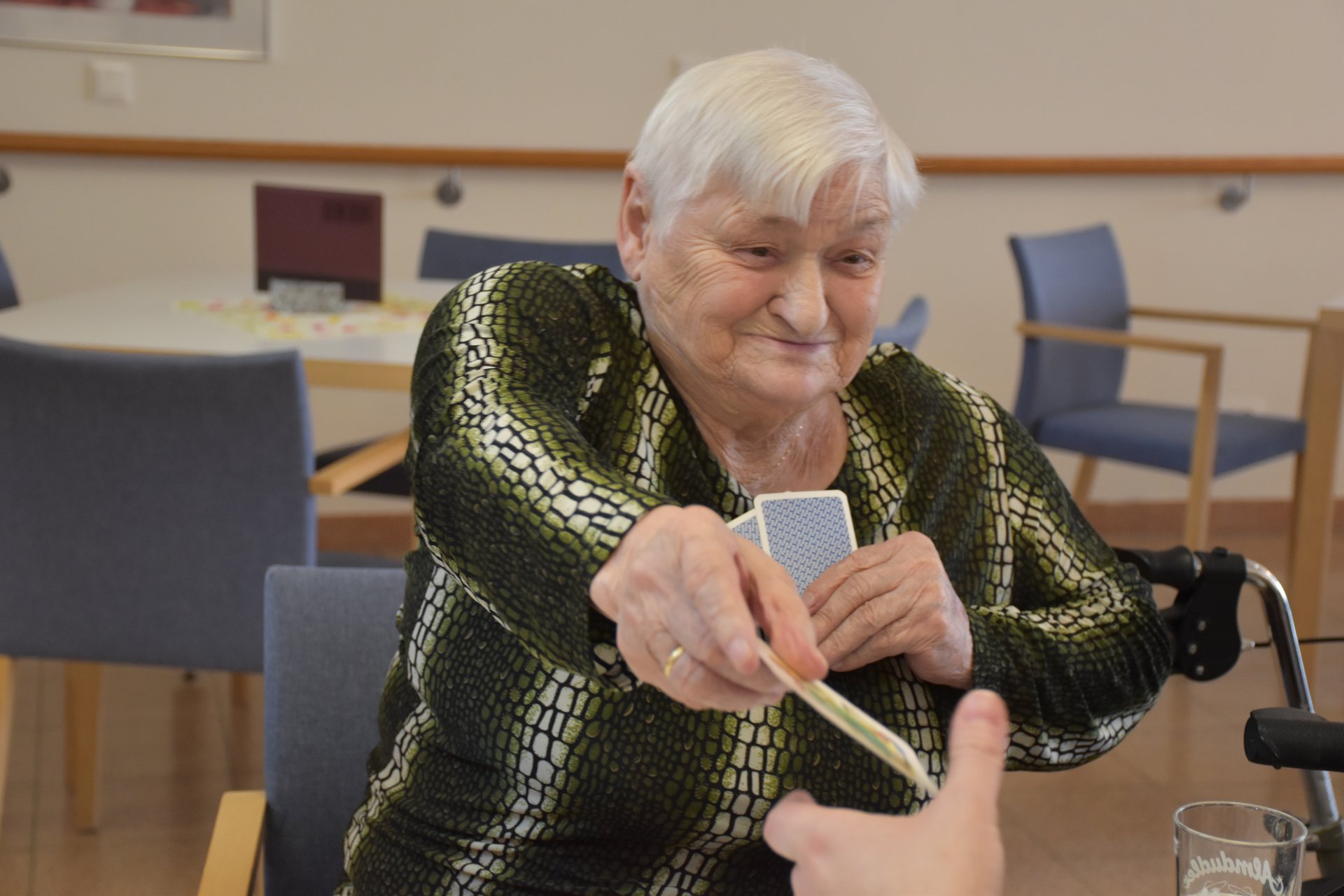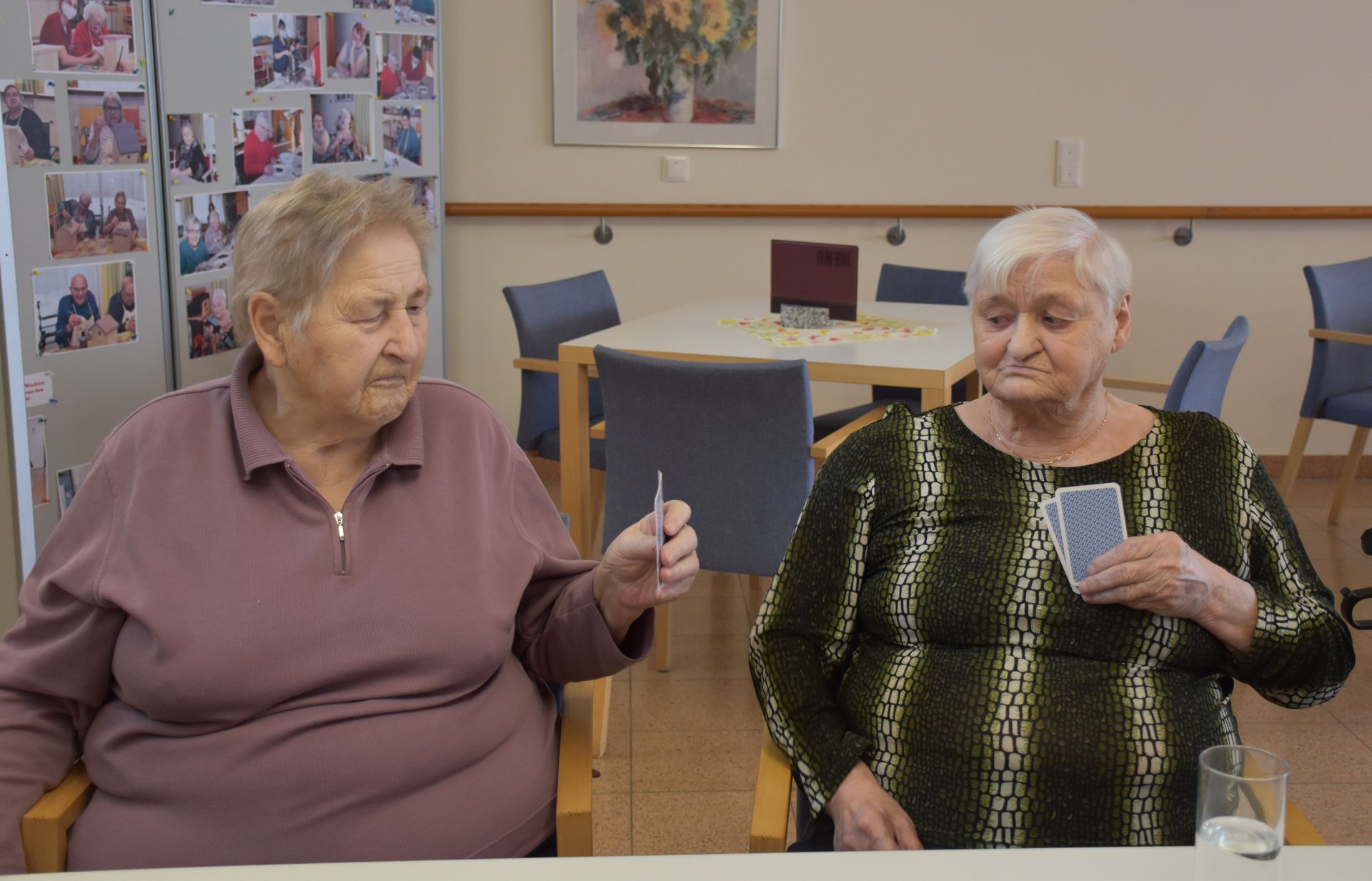 "Schwarzer Peter" ist ein Kartenspiel, an das sich unsere Bewohnerinnen und Bewohner gut erinnern können und es auch noch sehr gerne spielen! Von deren Erzählungen her wissen wir, dass früher dem Verlierer ein schwarzer Punkt auf die Stirn gemalt wurde und dass oft das ganze Gesicht regelrecht schwarz war. Wir haben uns gegenseitig nicht bemalt, doch schauen sie selbst, wie die Spielrunde verlaufen ist!