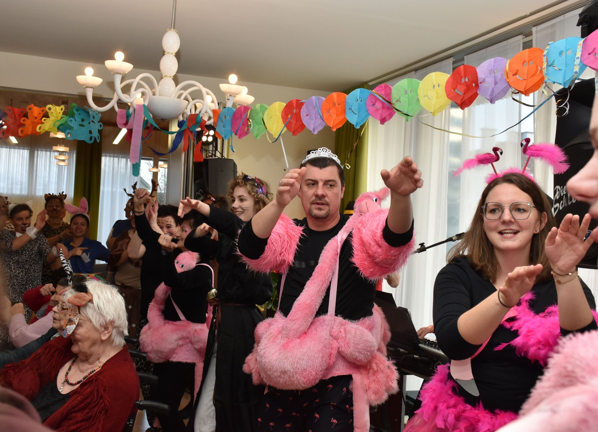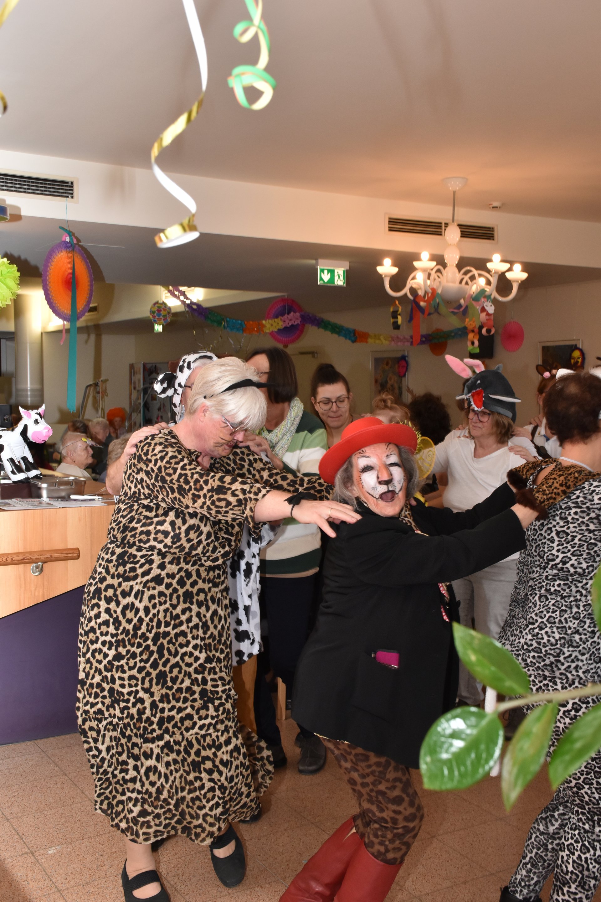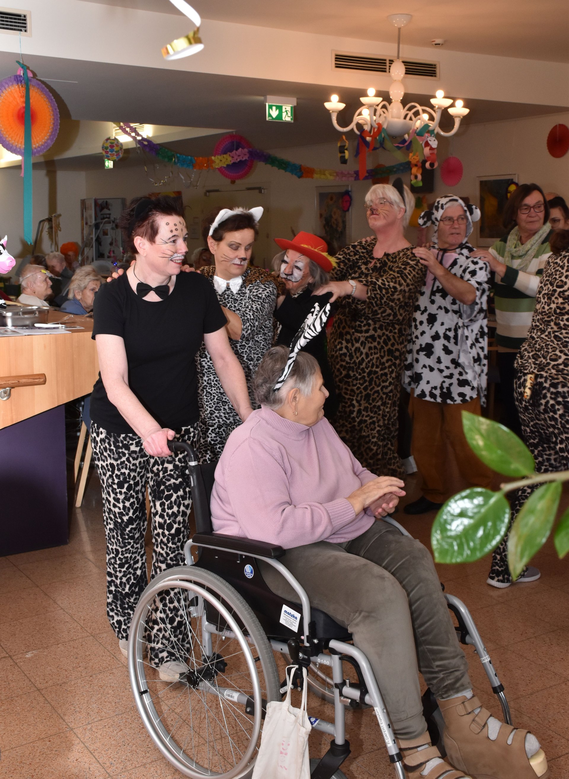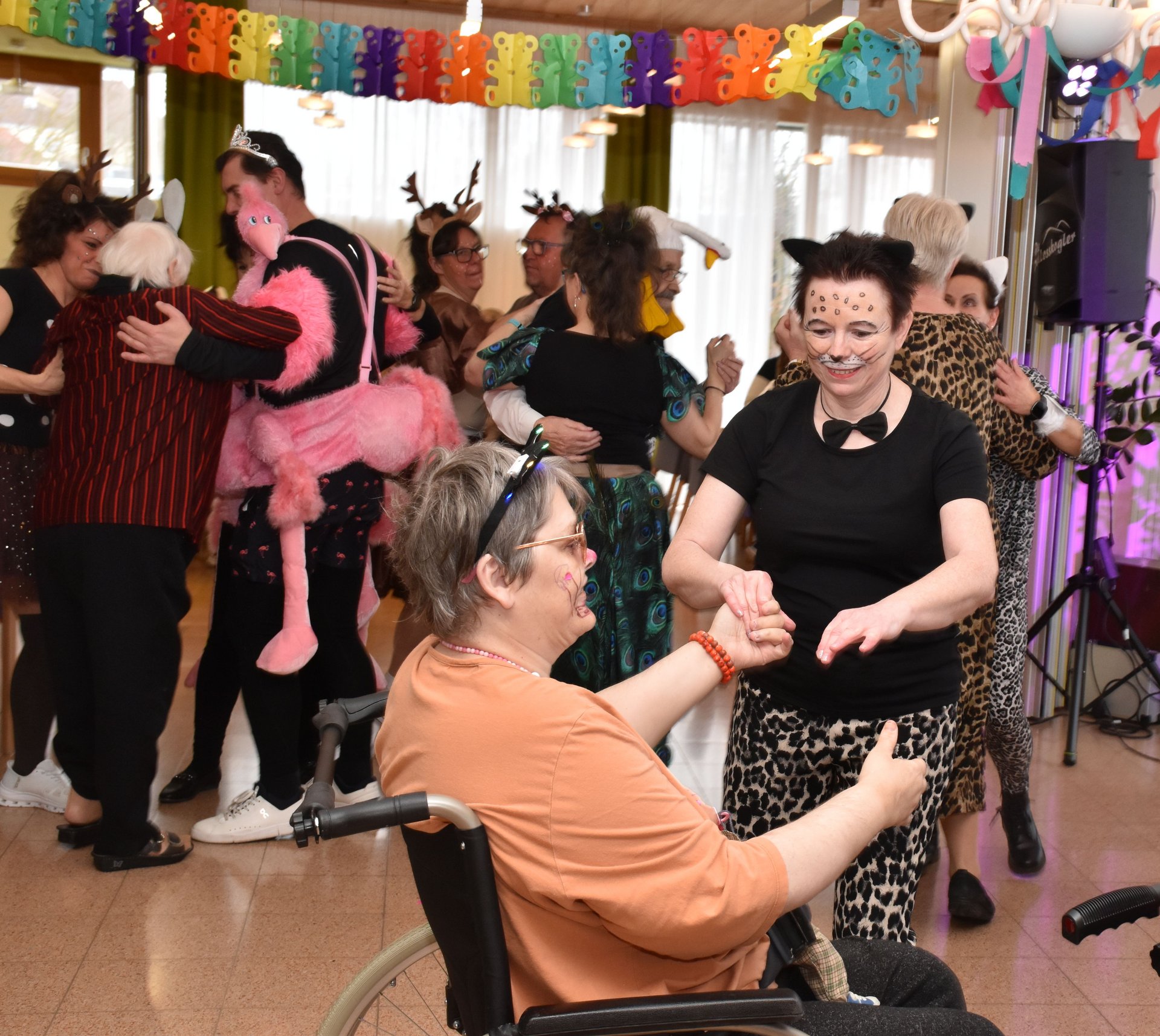 Am 19. Jänner nachmittags herrschte im PBZ Waidhofen/Thaya kurzzeitig tierischer Ausnahmezustand: Flamingo, Pfau, Wolf, Rehe & Co wurden gesichtet – und das gleich in beachtlicher Anzahl. Da watschelten doch plötzlich Flamingos durch die Gänge, Bären tanzten Polka und Wildkatzen schlichen über die Tanzfläche. Doch inzwischen konnte Entwarnung gegeben werden: Niemand ist entlaufen, vielmehr wurde ausgelassen Fasching gefeiert. Getreu dem Motto „Wehe, wenn sie losgelassen!“ sorgte die tierische Truppe für ordentlich Wirbel, beste Laune und so manches Schmunzeln. Wer sich genau hinter den Masken verbarg, blieb zwar nicht in allen Fällen eindeutig erkennbar – fest steht jedoch: Zahlreiche engagierte Ehrenamtliche sowie Mitarbeiterinnen und Mitarbeiter des Hauses, allen voran Kaufmännischer Direktor Rainer Hirschmann als Flamingo, hatten ein gemeinsames Ziel. Sie wollten den Bewohnerinnen und Bewohnern einen unvergesslich fröhlichen Nachmittag abseits des Alltags bescheren. Stundenlang flatterten, hüpften und tanzten die Tiere durch das Haus und ließen sich nur kurz mit Krapfen und Kaffee zähmen. Doch kaum war der letzte Bissen verdrückt, ging das Spektakel schon wieder weiter: Gemeinsam mit den Bewohnerinnen und Bewohnern wurde die Cafeteria kurzerhand zur Safari-Tanzfläche umfunktioniert. Für den richtigen Sound sorgten „Die Schlosskogler“, die mit Showeinlagen und Stimmungshits wie „Oben gute Laune, unten gute Laune“ den musikalischen Käfig endgültig öffneten. Die Tanzfläche war gestopft voll: Kühe, Kälber, Bambi, Pfau, Bär, Wolf und viele Wildkatzen bewiesen eindrucksvoll, dass man auch mit Fell, Federn oder Hufen erstaunlich gut das Tanzbein schwingen kann. Kurzzeitig konnte auf dem Tanzparkett eine kleine Biene gesichtet werden, die sich unbeirrt ihren Weg über die Tanzfläche bahnte. Beim Zusammenräumen am Ende des Nachmittags waren noch immer alle Tiere brav vor Ort. Doch dann verloren sich ihre Spuren. Zurück blieben lachende Gesichter, Muskelkater vom Tanzen und die leise Hoffnung, dass der Zoo nächstes Jahr wieder ausbricht. „Ein riesiges Dankeschön an alle, die dieses fröhlich-freche Faschingsfest möglich gemacht haben“, freut sich die Leitung des Hauses.