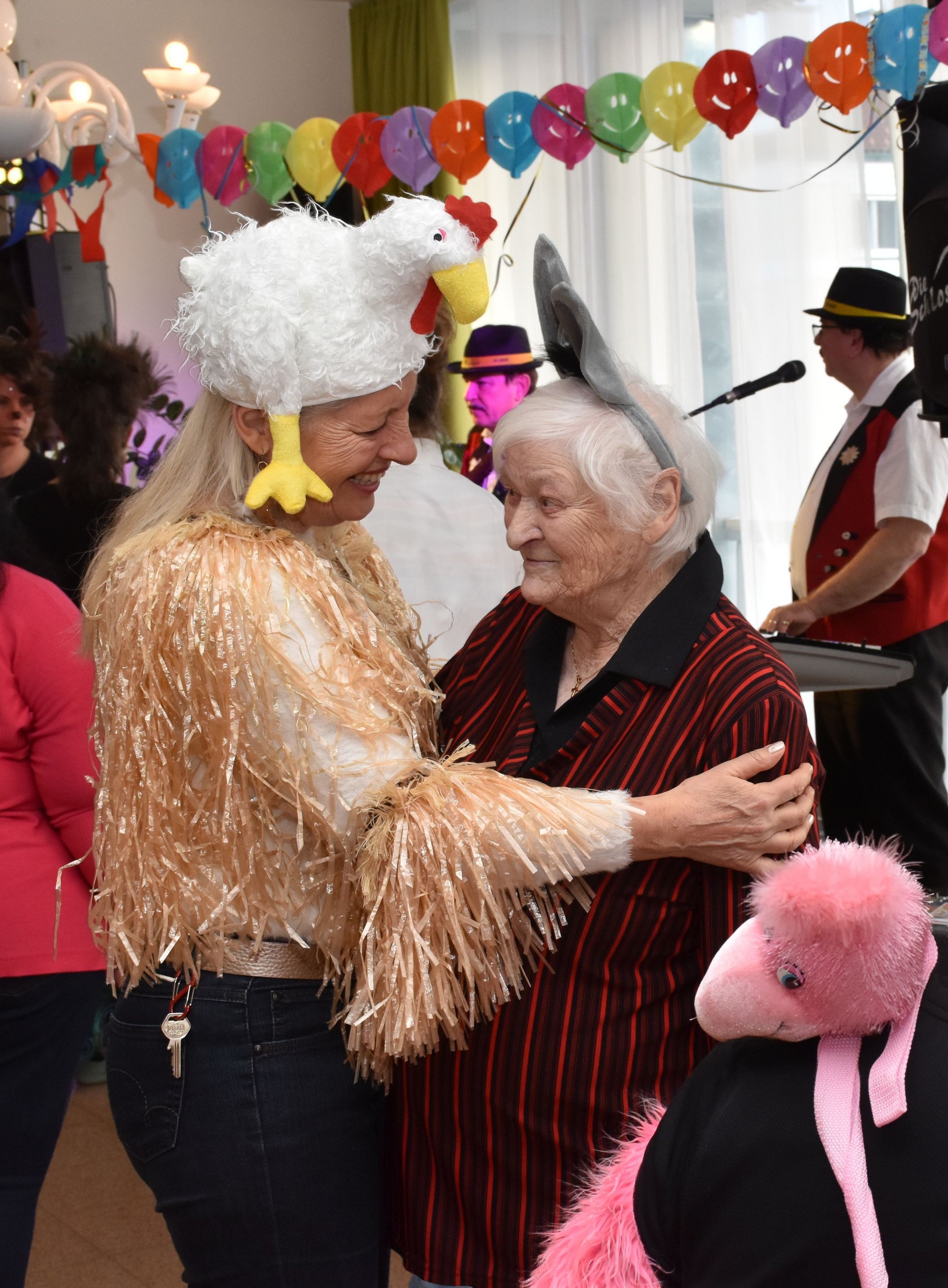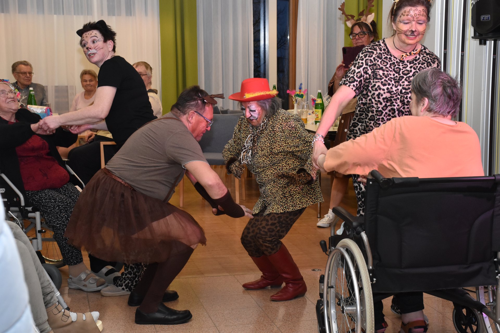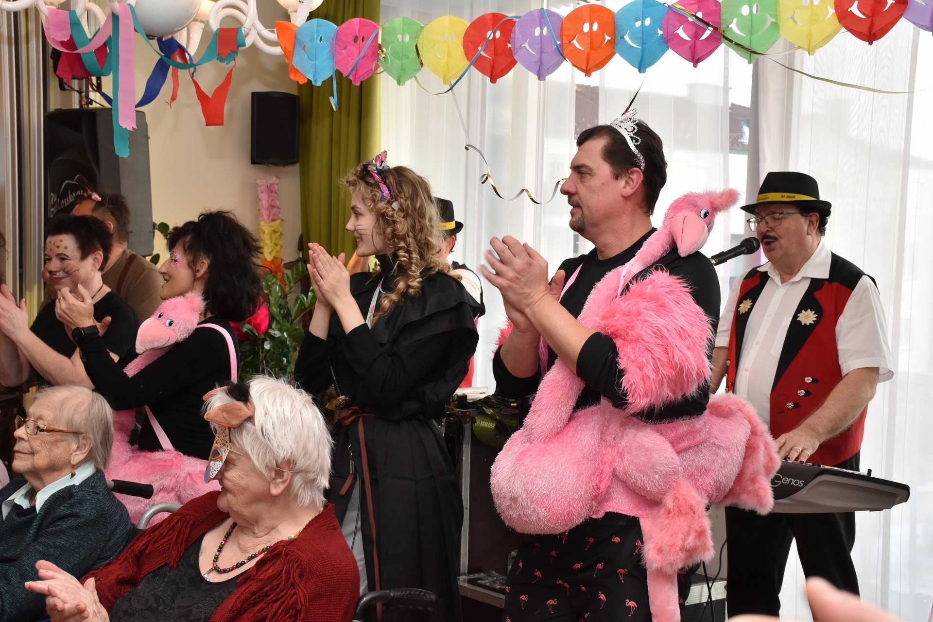 Am 19. Jänner nachmittags herrschte im PBZ Waidhofen/Thaya kurzzeitig tierischer Ausnahmezustand: Flamingo, Pfau, Wolf, Rehe & Co wurden gesichtet – und das gleich in beachtlicher Anzahl. Da watschelten doch plötzlich Flamingos durch die Gänge, Bären tanzten Polka und Wildkatzen schlichen über die Tanzfläche. Doch inzwischen konnte Entwarnung gegeben werden: Niemand ist entlaufen, vielmehr wurde ausgelassen Fasching gefeiert. Getreu dem Motto „Wehe, wenn sie losgelassen!“ sorgte die tierische Truppe für ordentlich Wirbel, beste Laune und so manches Schmunzeln. Wer sich genau hinter den Masken verbarg, blieb zwar nicht in allen Fällen eindeutig erkennbar – fest steht jedoch: Zahlreiche engagierte Ehrenamtliche sowie Mitarbeiterinnen und Mitarbeiter des Hauses, allen voran Kaufmännischer Direktor Rainer Hirschmann als Flamingo, hatten ein gemeinsames Ziel. Sie wollten den Bewohnerinnen und Bewohnern einen unvergesslich fröhlichen Nachmittag abseits des Alltags bescheren. Stundenlang flatterten, hüpften und tanzten die Tiere durch das Haus und ließen sich nur kurz mit Krapfen und Kaffee zähmen. Doch kaum war der letzte Bissen verdrückt, ging das Spektakel schon wieder weiter: Gemeinsam mit den Bewohnerinnen und Bewohnern wurde die Cafeteria kurzerhand zur Safari-Tanzfläche umfunktioniert. Für den richtigen Sound sorgten „Die Schlosskogler“, die mit Showeinlagen und Stimmungshits wie „Oben gute Laune, unten gute Laune“ den musikalischen Käfig endgültig öffneten. Die Tanzfläche war gestopft voll: Kühe, Kälber, Bambi, Pfau, Bär, Wolf und viele Wildkatzen bewiesen eindrucksvoll, dass man auch mit Fell, Federn oder Hufen erstaunlich gut das Tanzbein schwingen kann. Kurzzeitig konnte auf dem Tanzparkett eine kleine Biene gesichtet werden, die sich unbeirrt ihren Weg über die Tanzfläche bahnte. Beim Zusammenräumen am Ende des Nachmittags waren noch immer alle Tiere brav vor Ort. Doch dann verloren sich ihre Spuren. Zurück blieben lachende Gesichter, Muskelkater vom Tanzen und die leise Hoffnung, dass der Zoo nächstes Jahr wieder ausbricht. „Ein riesiges Dankeschön an alle, die dieses fröhlich-freche Faschingsfest möglich gemacht haben“, freut sich die Leitung des Hauses.