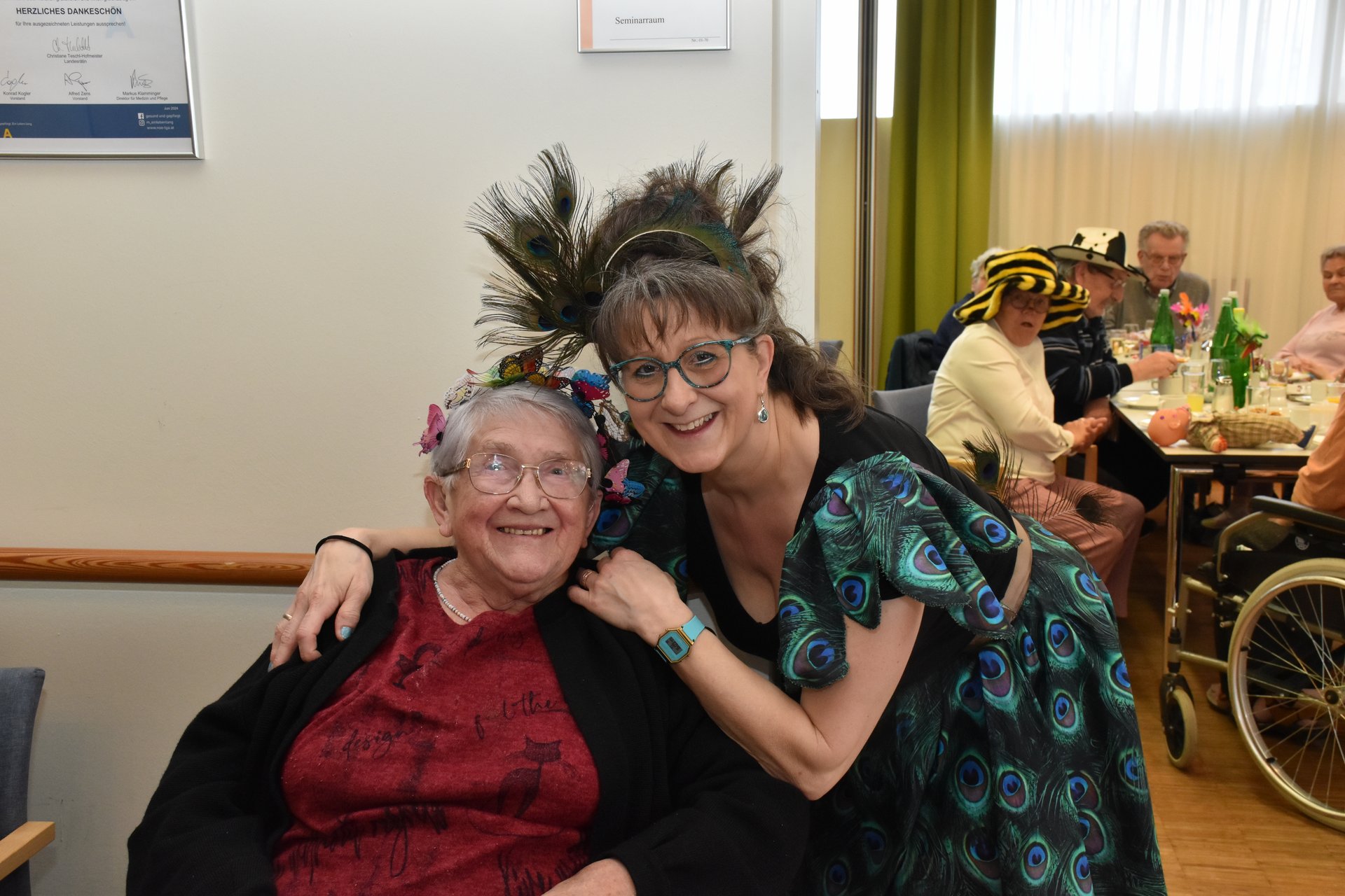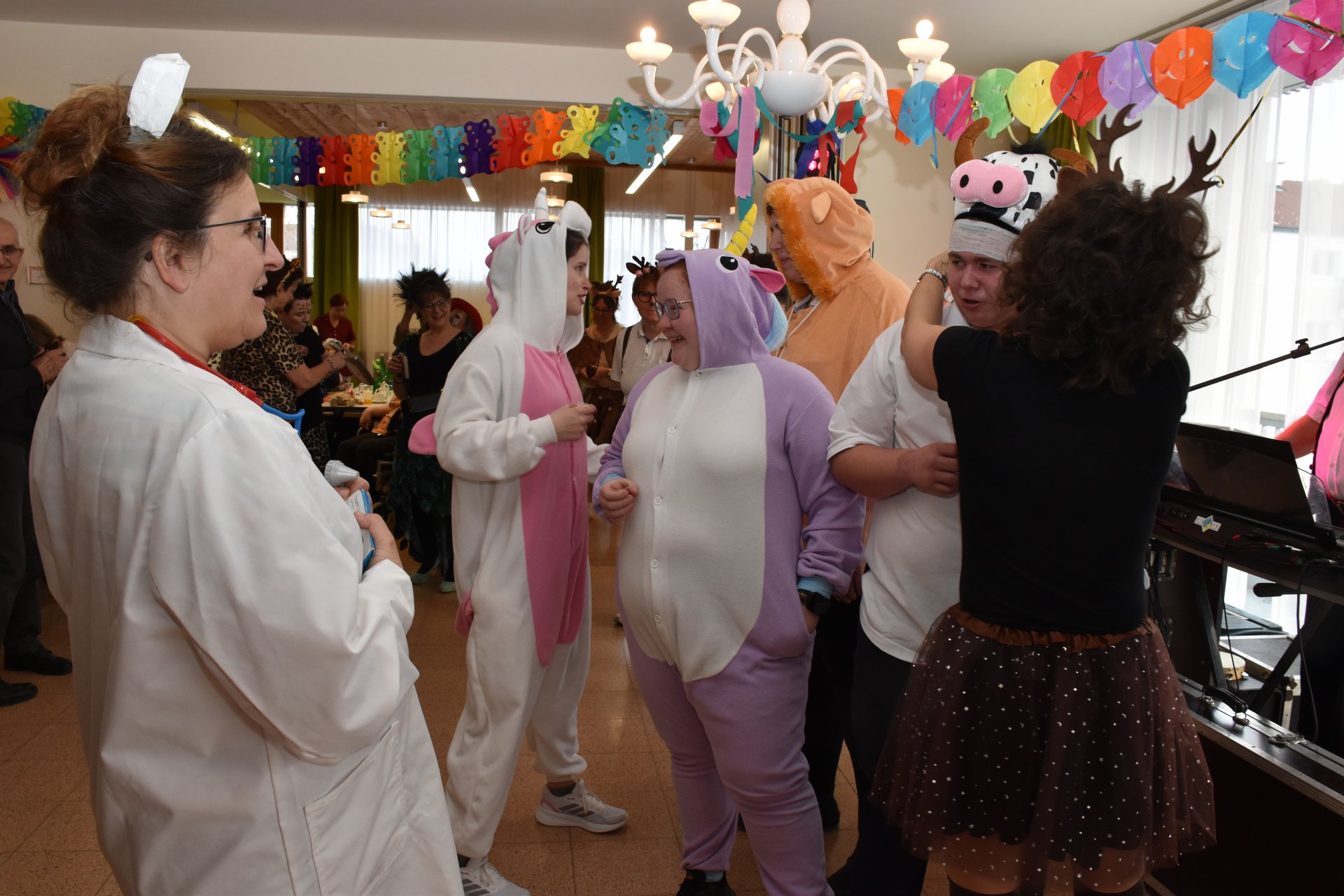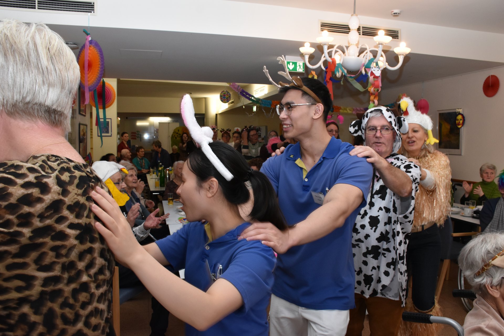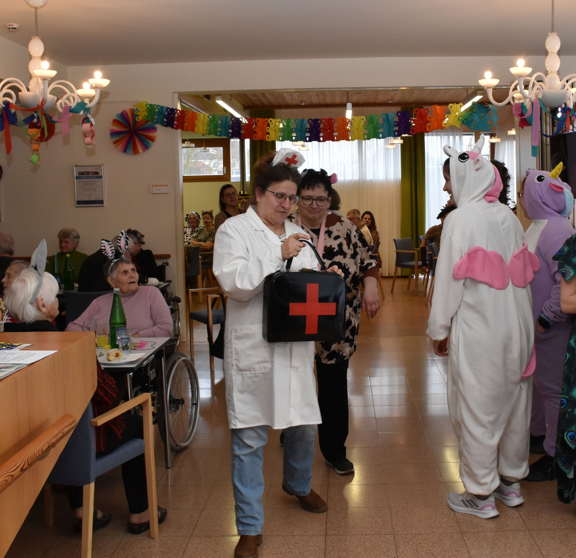 Am 19. Jänner nachmittags herrschte im PBZ Waidhofen/Thaya kurzzeitig tierischer Ausnahmezustand: Flamingo, Pfau, Wolf, Rehe & Co wurden gesichtet – und das gleich in beachtlicher Anzahl. Da watschelten doch plötzlich Flamingos durch die Gänge, Bären tanzten Polka und Wildkatzen schlichen über die Tanzfläche. Doch inzwischen konnte Entwarnung gegeben werden: Niemand ist entlaufen, vielmehr wurde ausgelassen Fasching gefeiert. Getreu dem Motto „Wehe, wenn sie losgelassen!“ sorgte die tierische Truppe für ordentlich Wirbel, beste Laune und so manches Schmunzeln. Wer sich genau hinter den Masken verbarg, blieb zwar nicht in allen Fällen eindeutig erkennbar – fest steht jedoch: Zahlreiche engagierte Ehrenamtliche sowie Mitarbeiterinnen und Mitarbeiter des Hauses, allen voran Kaufmännischer Direktor Rainer Hirschmann als Flamingo, hatten ein gemeinsames Ziel. Sie wollten den Bewohnerinnen und Bewohnern einen unvergesslich fröhlichen Nachmittag abseits des Alltags bescheren. Stundenlang flatterten, hüpften und tanzten die Tiere durch das Haus und ließen sich nur kurz mit Krapfen und Kaffee zähmen. Doch kaum war der letzte Bissen verdrückt, ging das Spektakel schon wieder weiter: Gemeinsam mit den Bewohnerinnen und Bewohnern wurde die Cafeteria kurzerhand zur Safari-Tanzfläche umfunktioniert. Für den richtigen Sound sorgten „Die Schlosskogler“, die mit Showeinlagen und Stimmungshits wie „Oben gute Laune, unten gute Laune“ den musikalischen Käfig endgültig öffneten. Die Tanzfläche war gestopft voll: Kühe, Kälber, Bambi, Pfau, Bär, Wolf und viele Wildkatzen bewiesen eindrucksvoll, dass man auch mit Fell, Federn oder Hufen erstaunlich gut das Tanzbein schwingen kann. Kurzzeitig konnte auf dem Tanzparkett eine kleine Biene gesichtet werden, die sich unbeirrt ihren Weg über die Tanzfläche bahnte. Beim Zusammenräumen am Ende des Nachmittags waren noch immer alle Tiere brav vor Ort. Doch dann verloren sich ihre Spuren. Zurück blieben lachende Gesichter, Muskelkater vom Tanzen und die leise Hoffnung, dass der Zoo nächstes Jahr wieder ausbricht. „Ein riesiges Dankeschön an alle, die dieses fröhlich-freche Faschingsfest möglich gemacht haben“, freut sich die Leitung des Hauses.