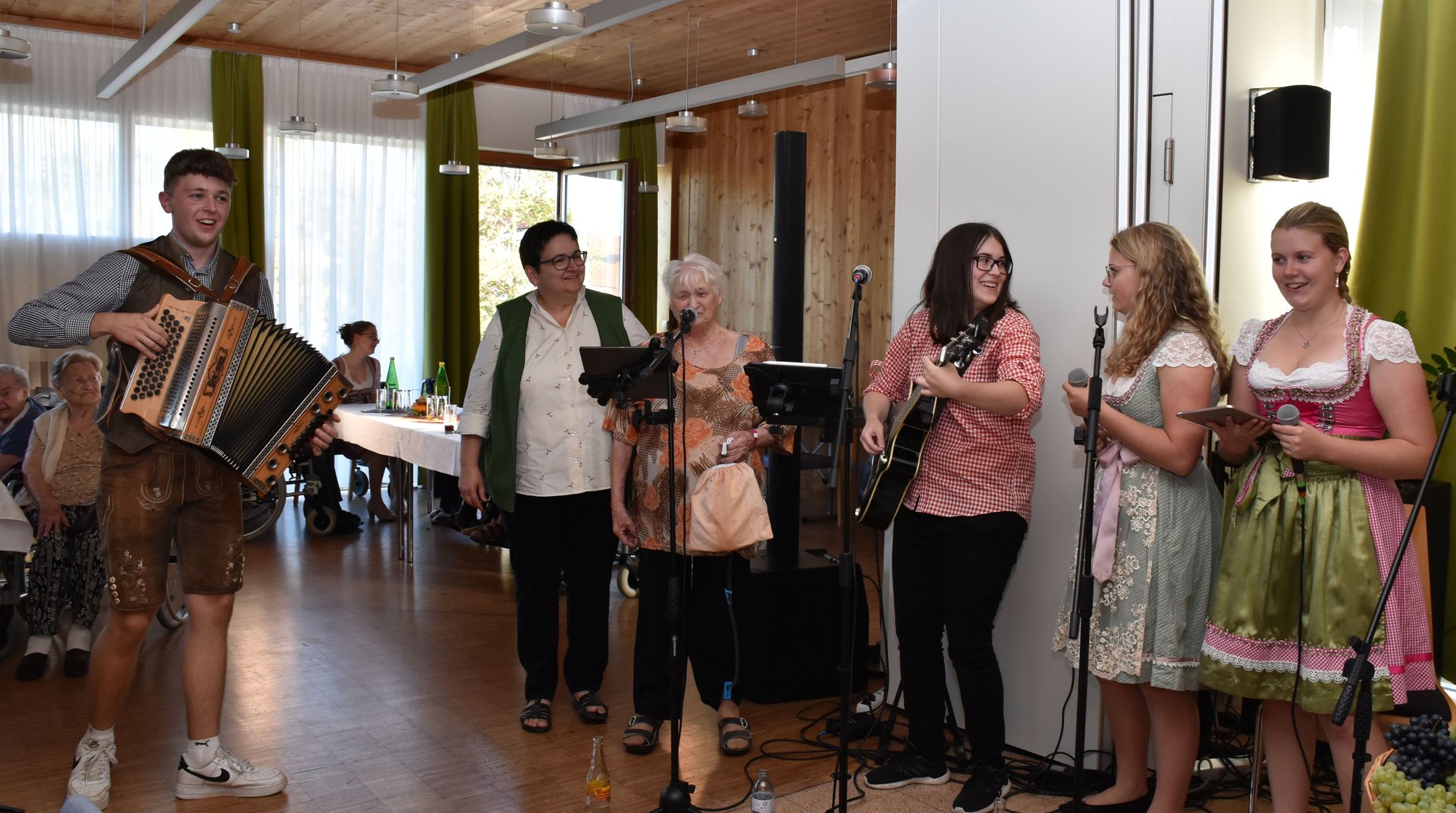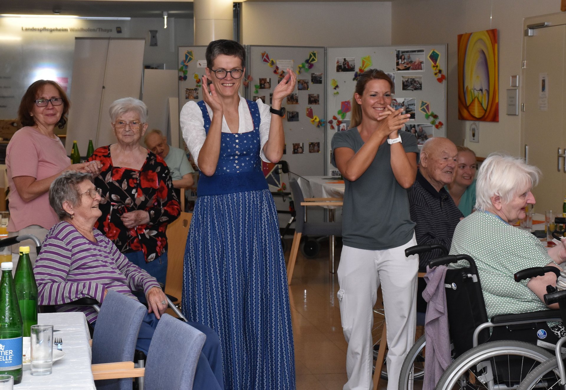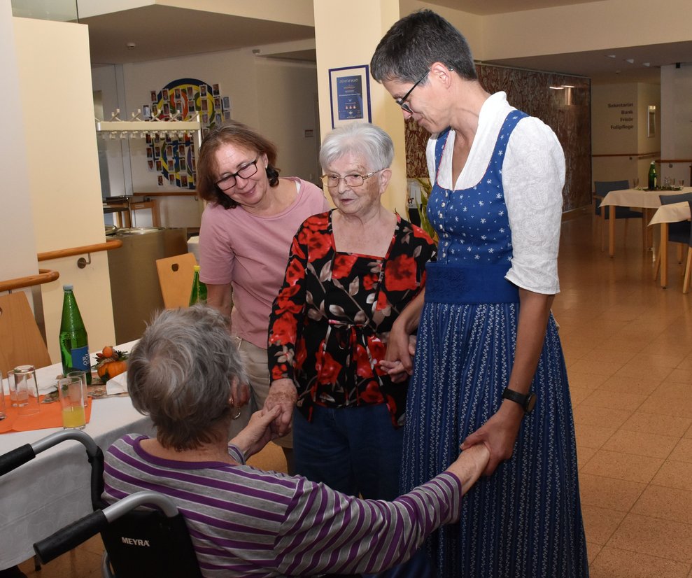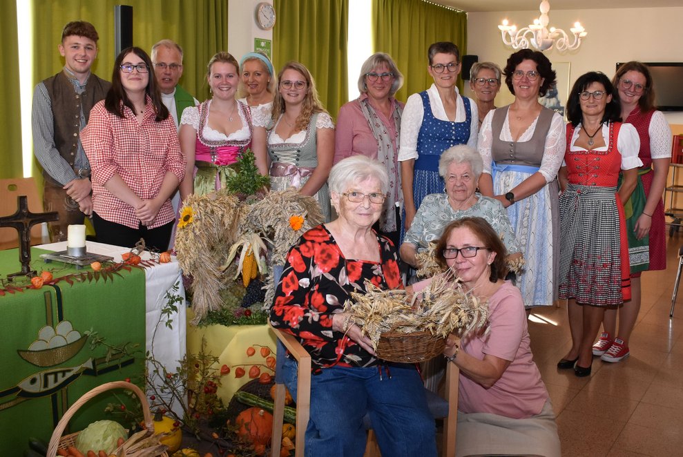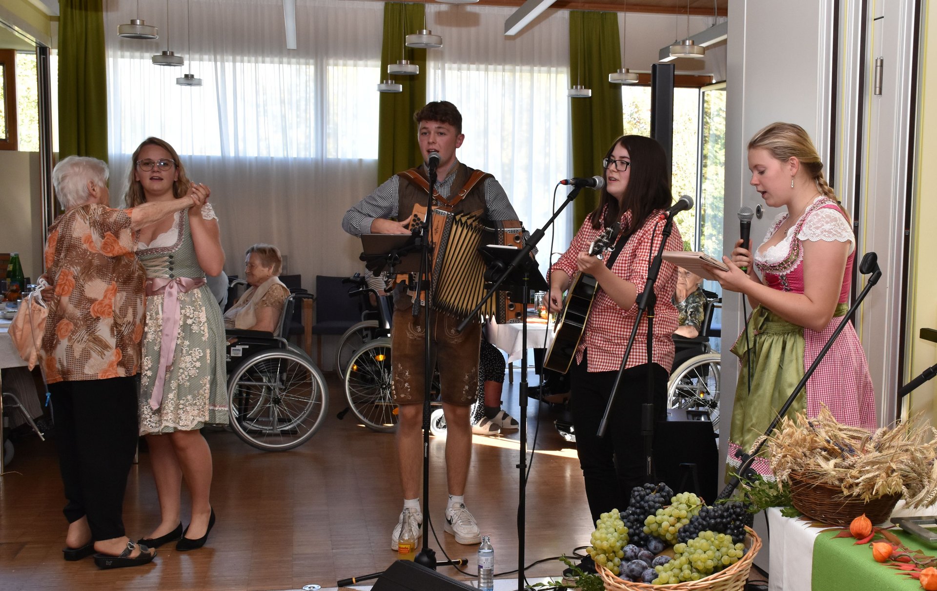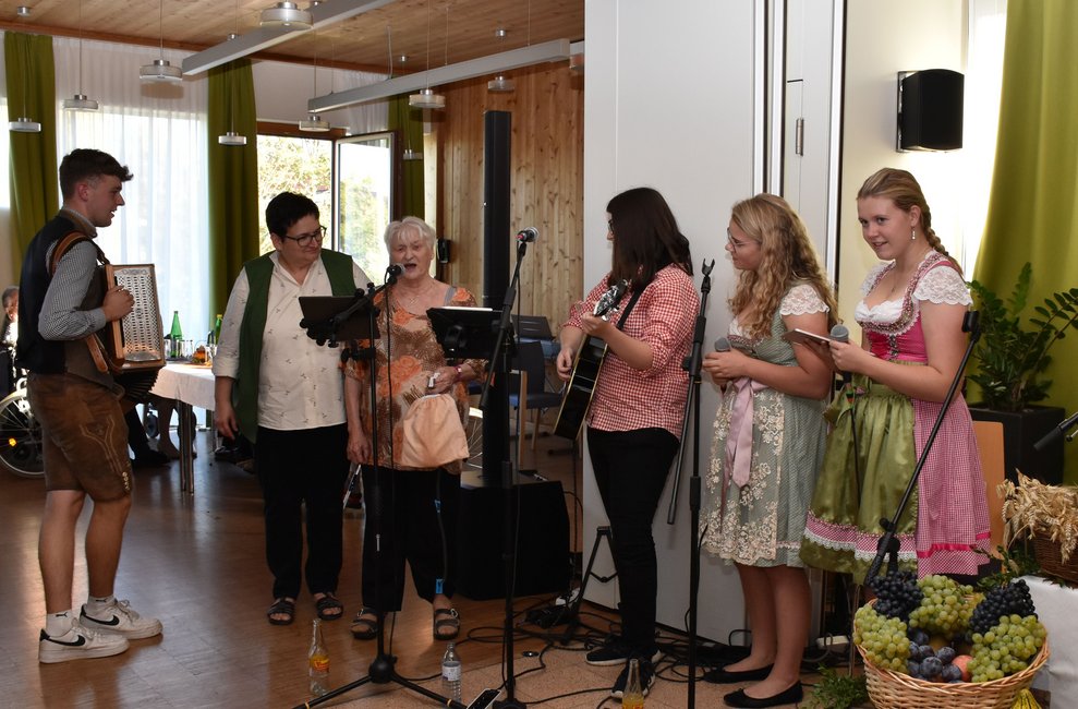 Das Erntedankfest fand in der Cafeteria des Pflege- und Betreuungszentrums statt. Pfarrer Friedrich Mikesch gestaltete gemeinsam mit Dr. Mag. Margit Biedermann von der Seelsorge und der neuen Musikgruppe „Freindschoft“ aus dem Waldviertel die Heilige Messe. Von Bewohnerinnen und Bewohnern angeregt, wurde danach zur volkstümlichen spritzigen Musik der jungen Band auch gesungen und getanzt. Erklärung dafür: Nach getaner, oft harter mühsamer Arbeit, wurde für die gute Ernte gedankt und anschließend gefeiert und getanzt. Dadurch wurde der Zusammenhalt gestärkt und die Folgen der körperlichen Anstrengungen während der Ernte waren weniger spürbar.