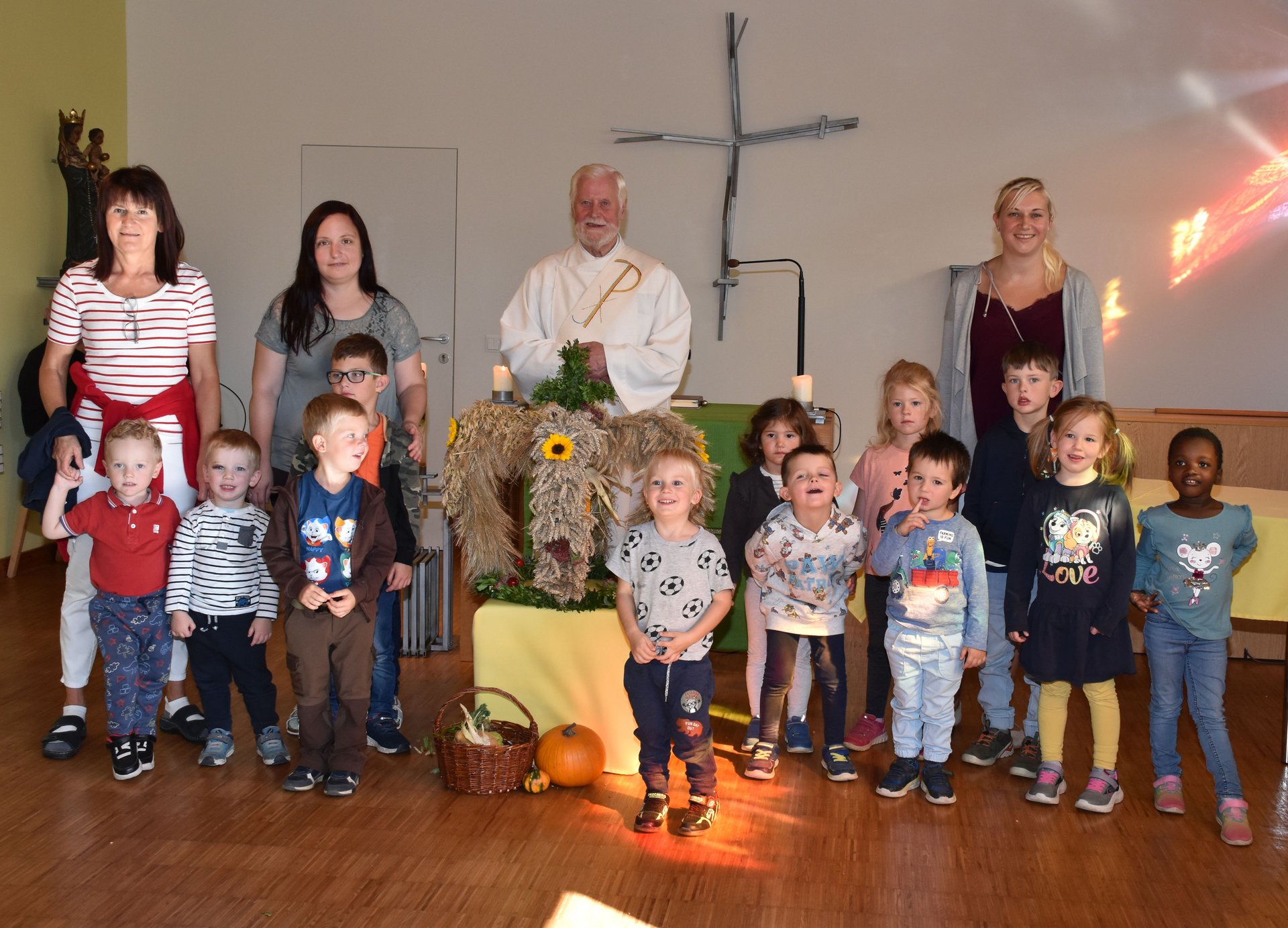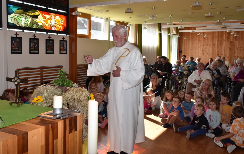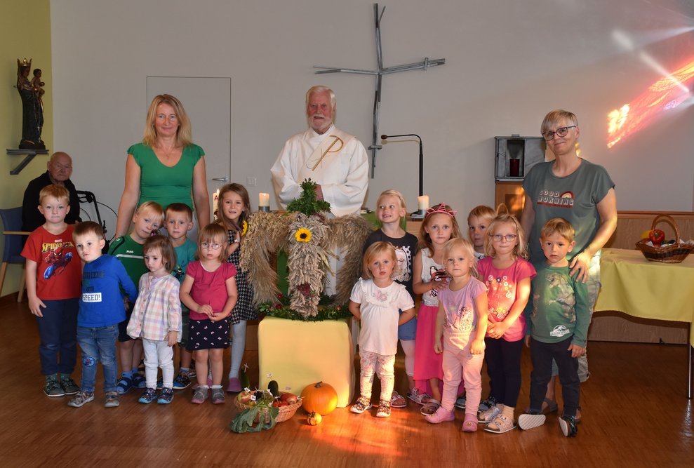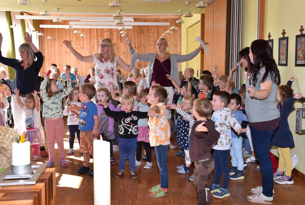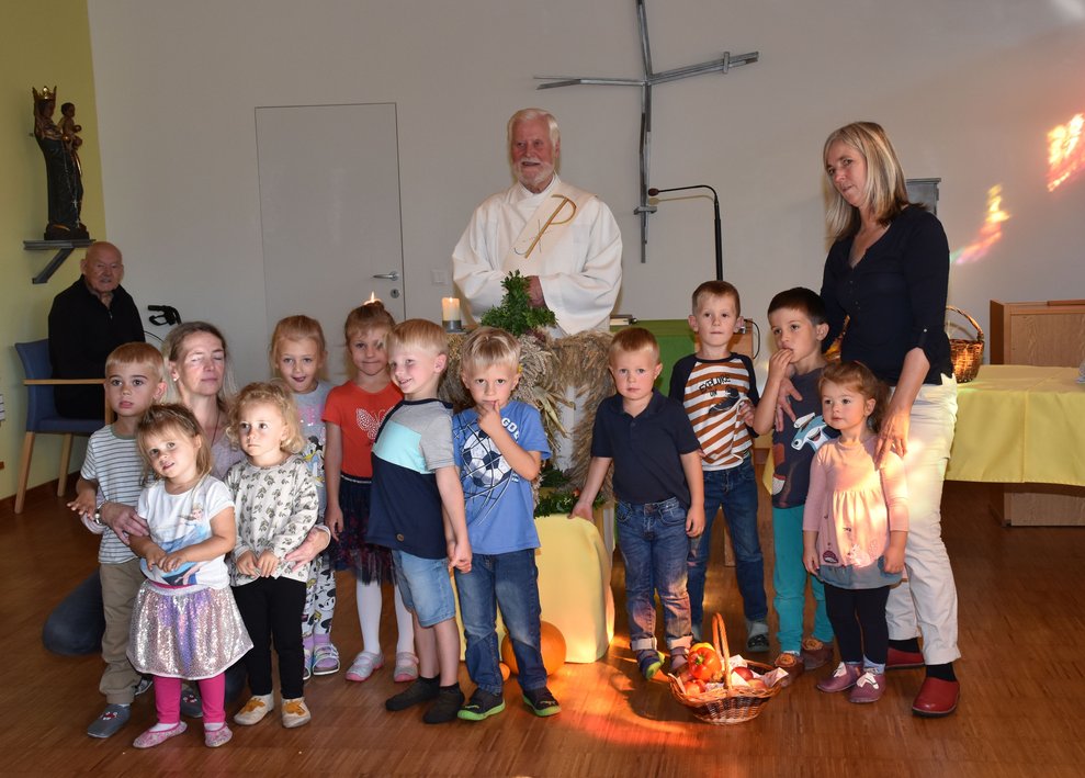 Erntedankfest feiern mit den Kindergartenkindern ist ein besonderes Erlebnis! Gut vorbereitet kamen 49 Kinder mit Leiterin Ulli Bayer und ihren Kolleginnen zu uns in die Kapelle um zu singen, zu tanzen, zu danken und um die mitgebrachte reiche Ernte der Natur segnen zu lassen. Hr. Diakon Josef Trinko fand die richtigen Worte um den Sinn von Erntedank allen näher zu bringen und animierte die Kinder zu erzählen, wo die verschiedenen Früchte- und Gemüsesorten geerntet wurden!