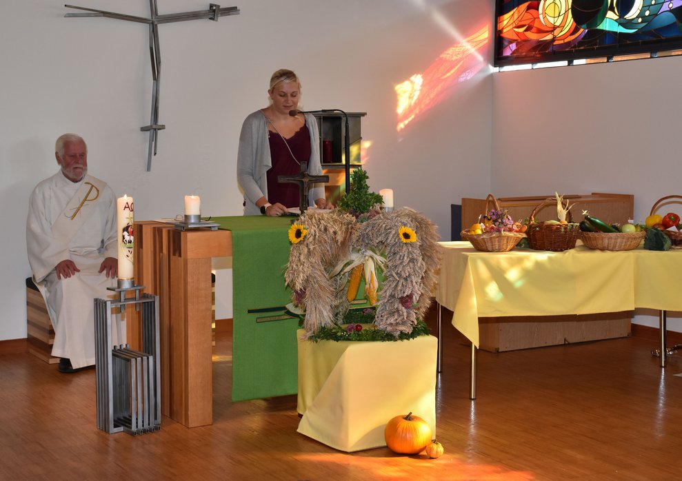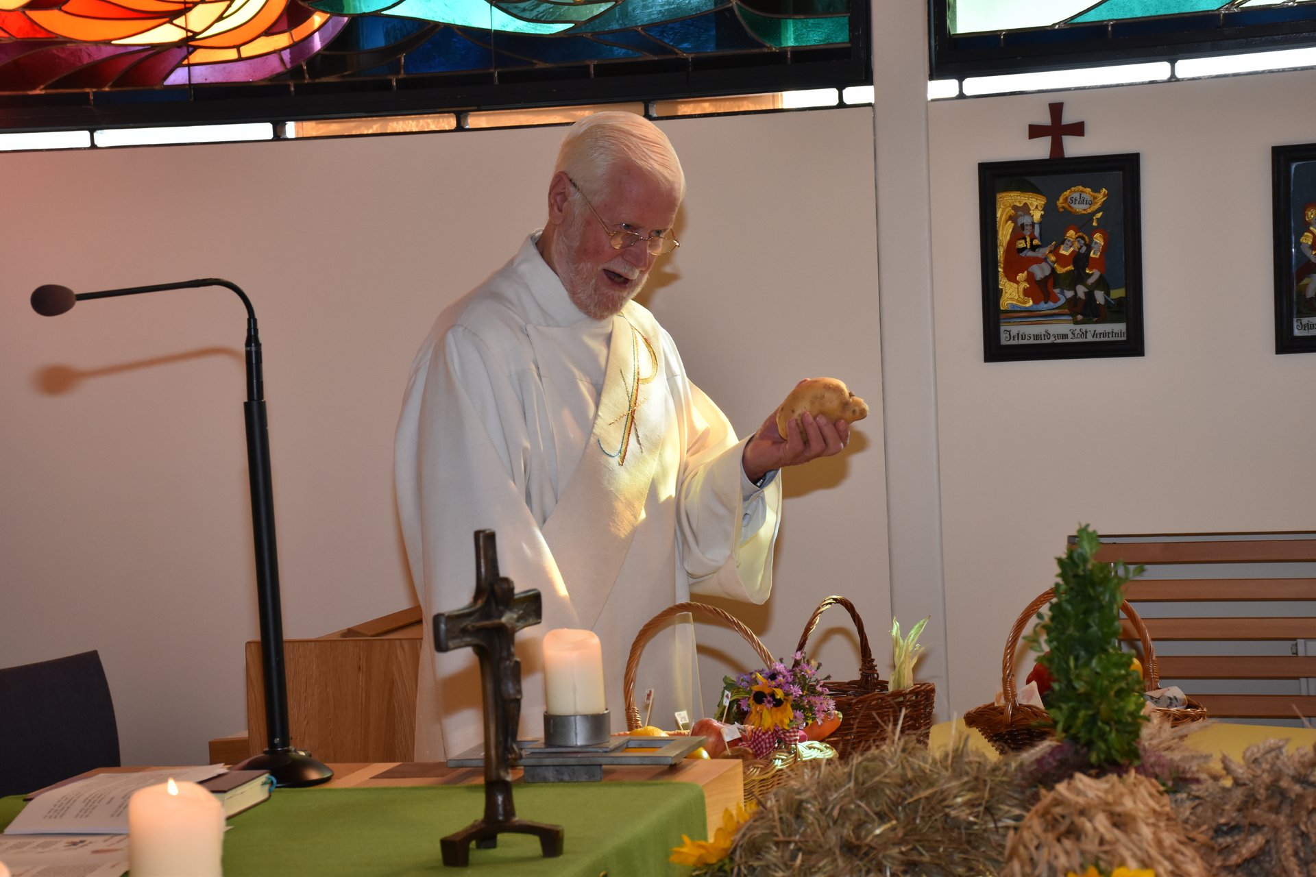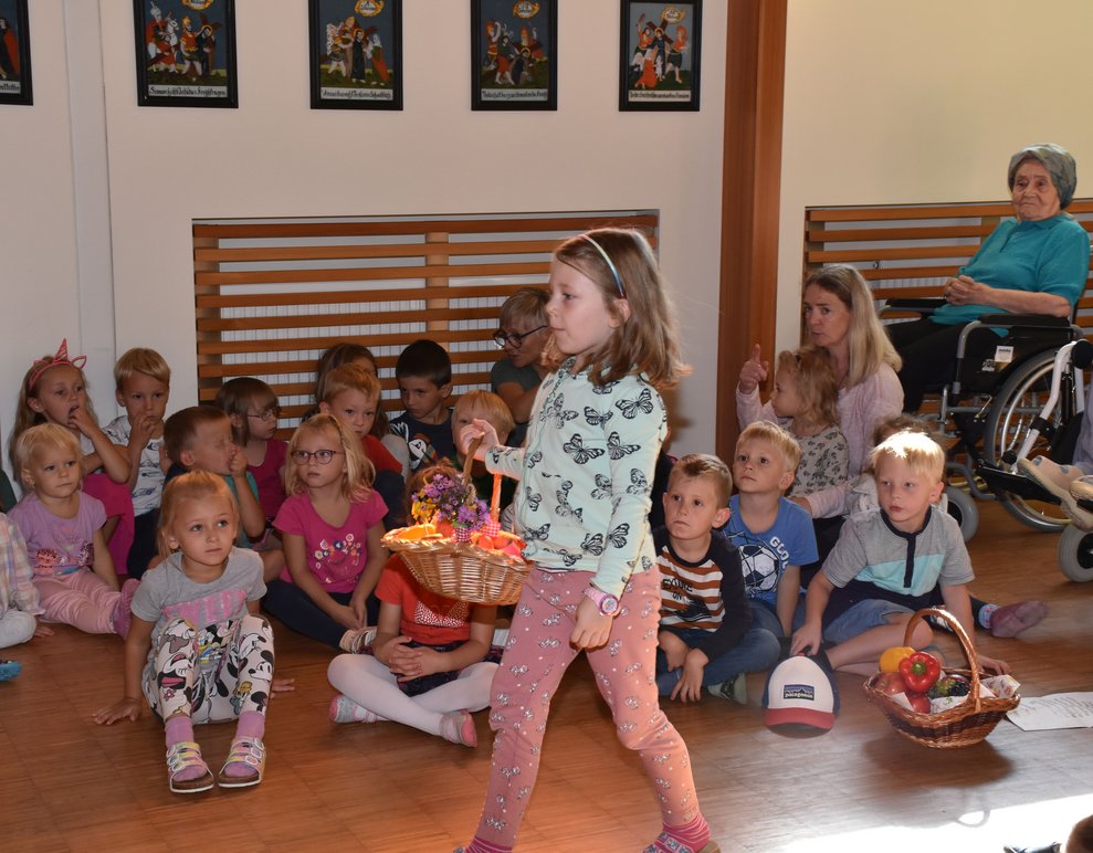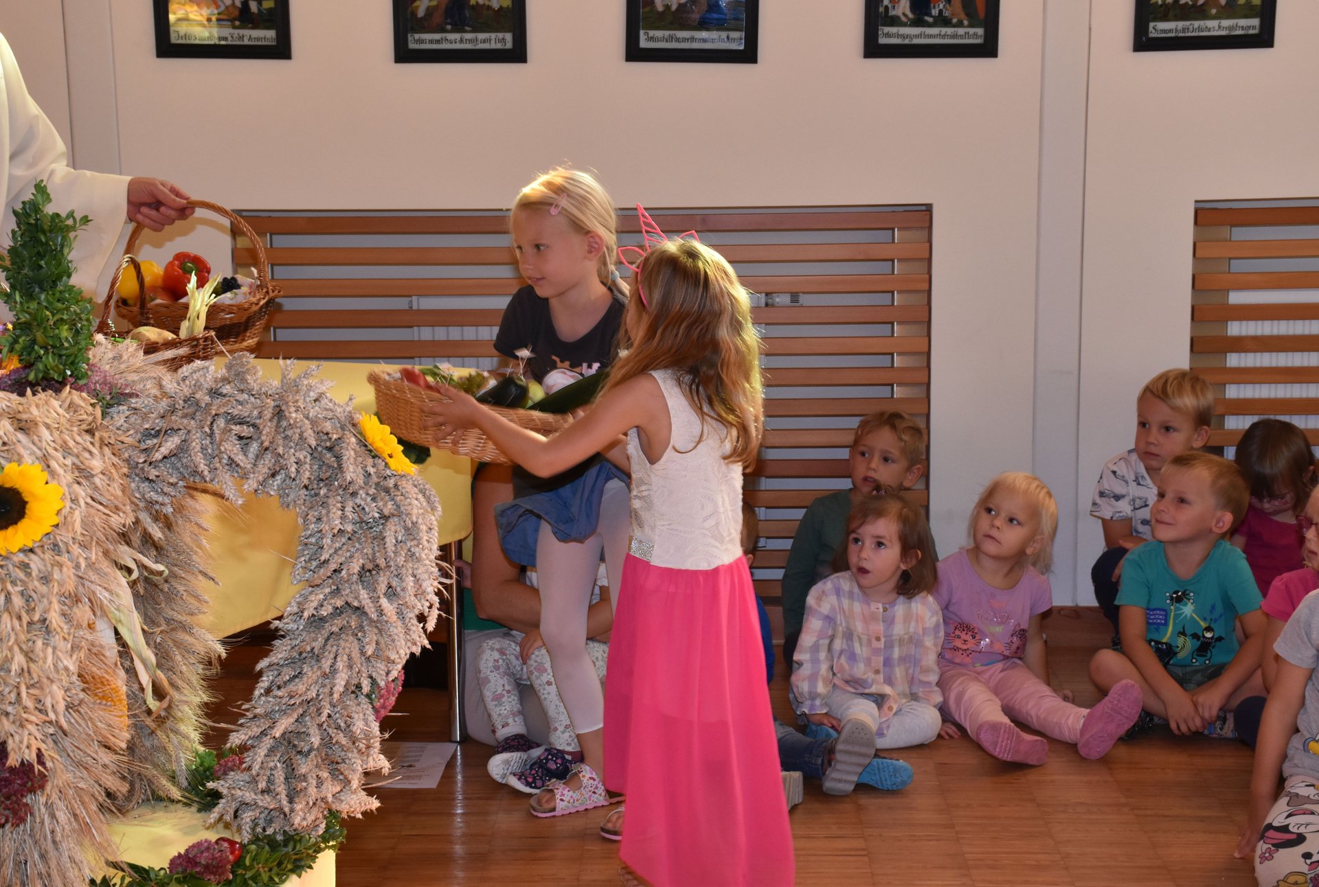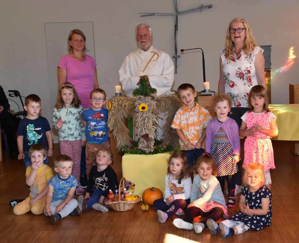Erntedankfest feiern mit den Kindergartenkindern ist ein besonderes Erlebnis! Gut vorbereitet kamen 49 Kinder mit Leiterin Ulli Bayer und ihren Kolleginnen zu uns in die Kapelle um zu singen, zu tanzen, zu danken und um die mitgebrachte reiche Ernte der Natur segnen zu lassen. Hr. Diakon Josef Trinko fand die richtigen Worte um den Sinn von Erntedank allen näher zu bringen und animierte die Kinder zu erzählen, wo die verschiedenen Früchte- und Gemüsesorten geerntet wurden!
