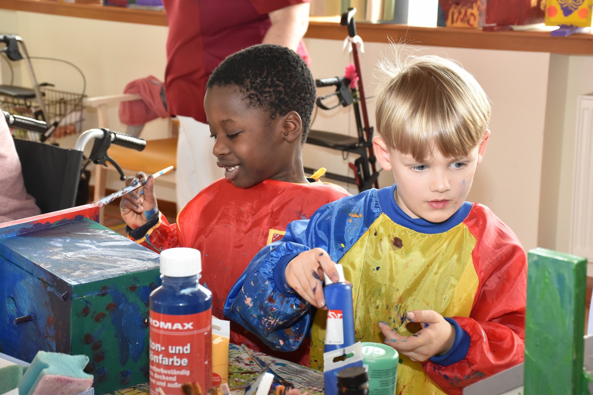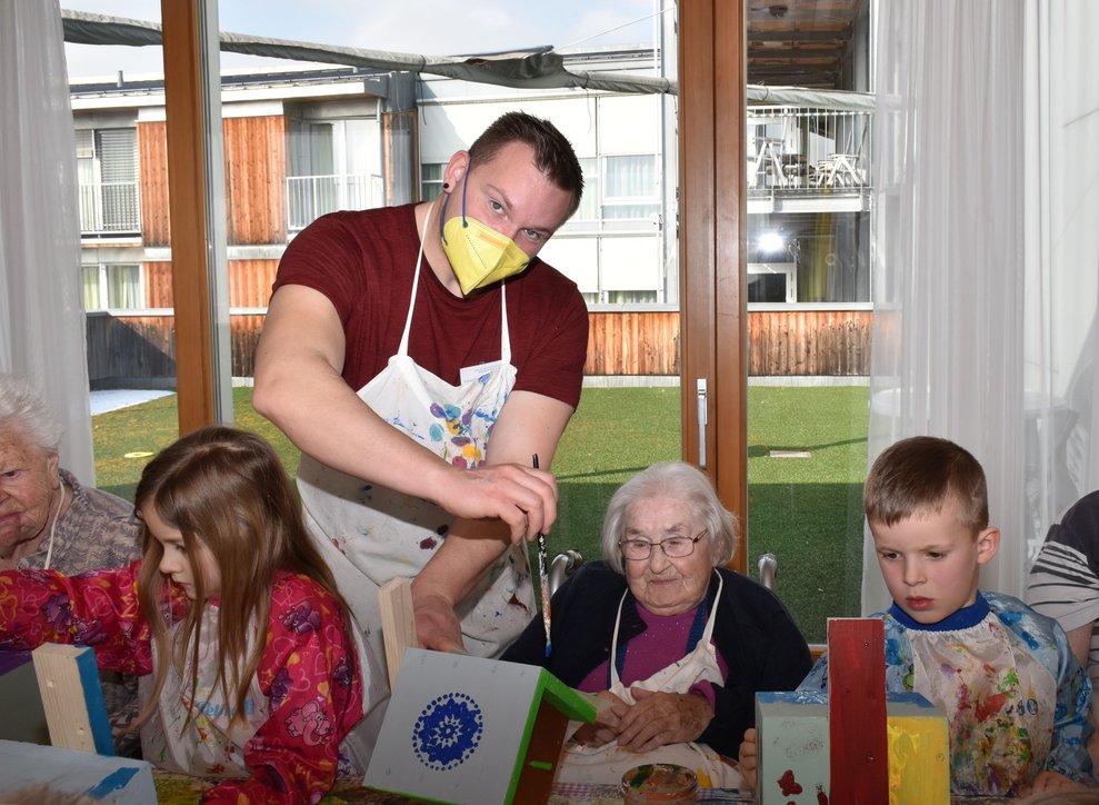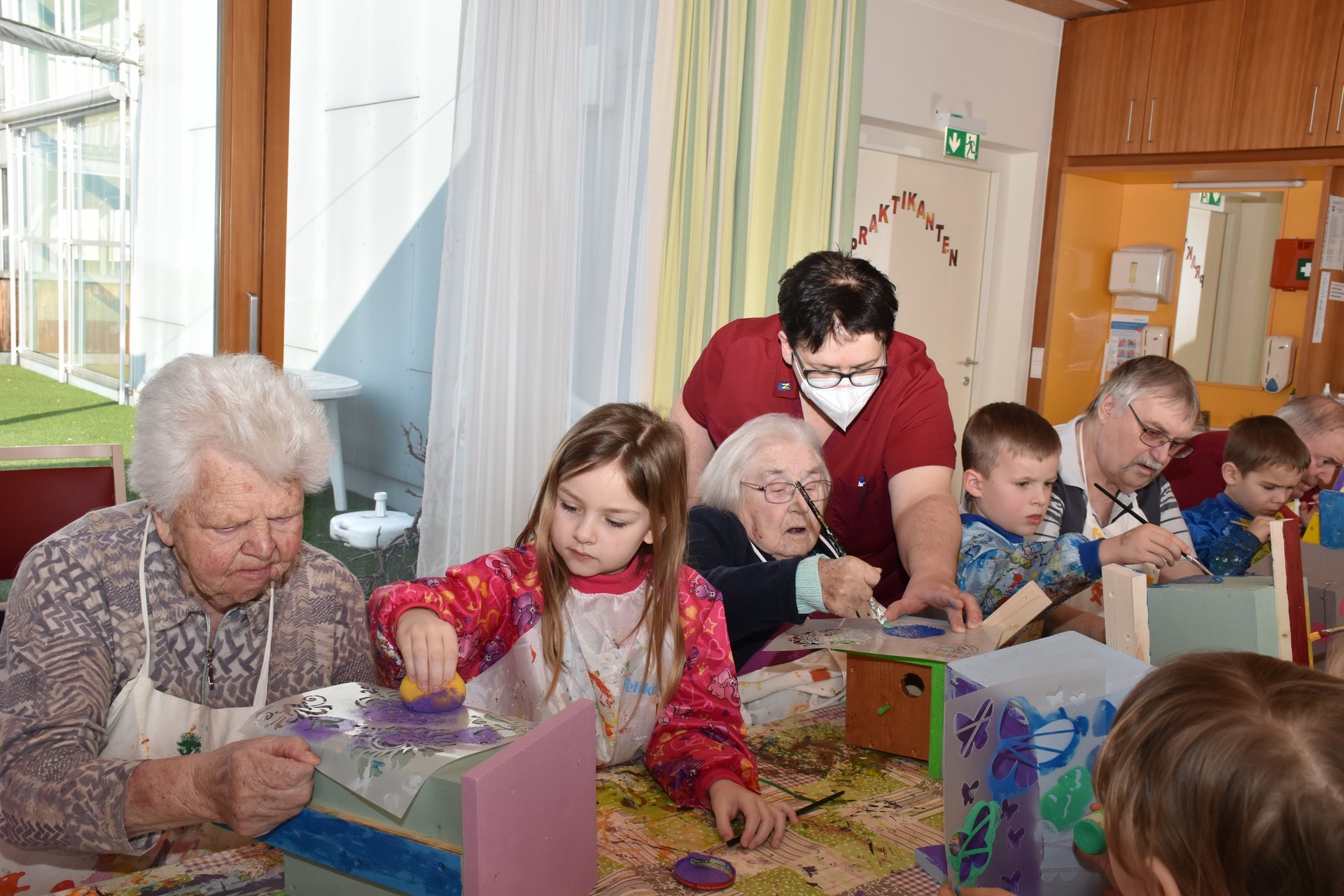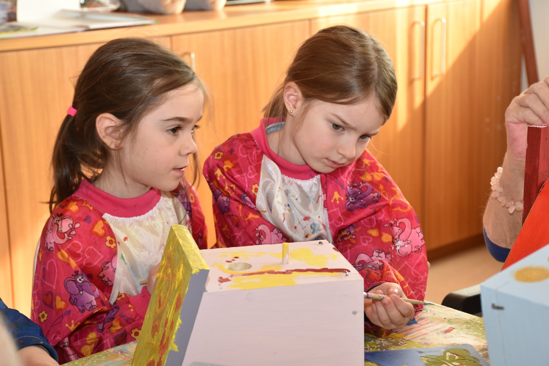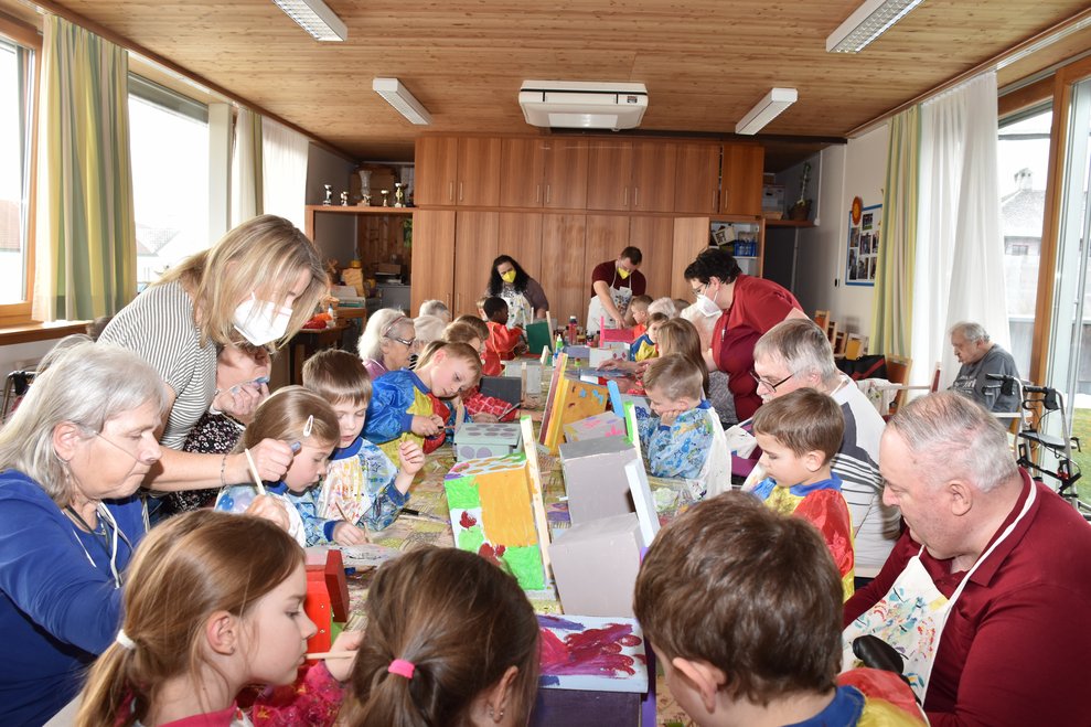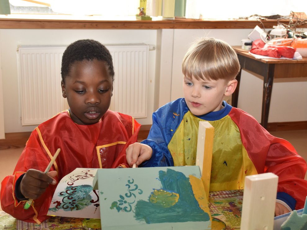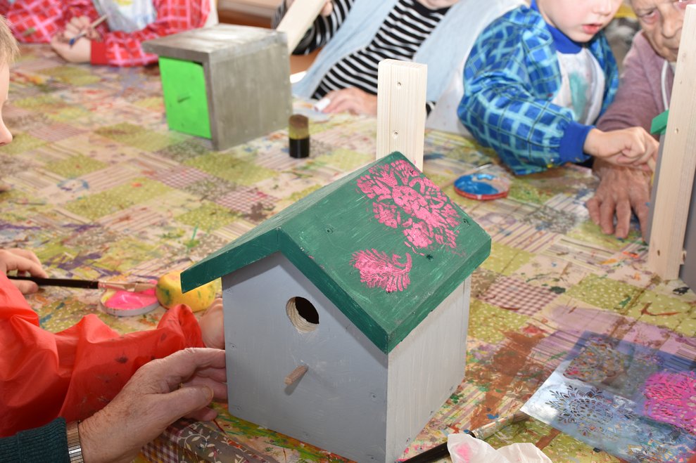 Die Arbeiten an den Nistkästen werden mit den Kindern vom Kindergarten II, Heubachstraße, fortgeführt! Mit Farben, Pinseln und Schablonen, dem nötigen Schaffensdrang und Spaß an der Sache bekommen die zukünftigen Behausungen verschiedener Vogelarten ein spezielles farbenfrohes Aussehen!