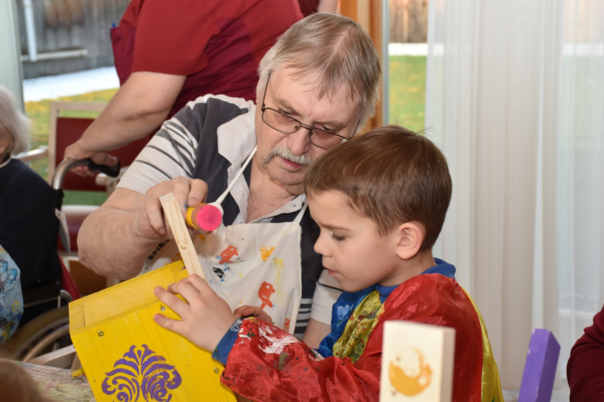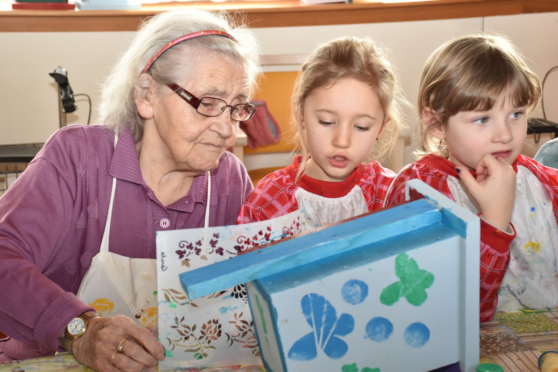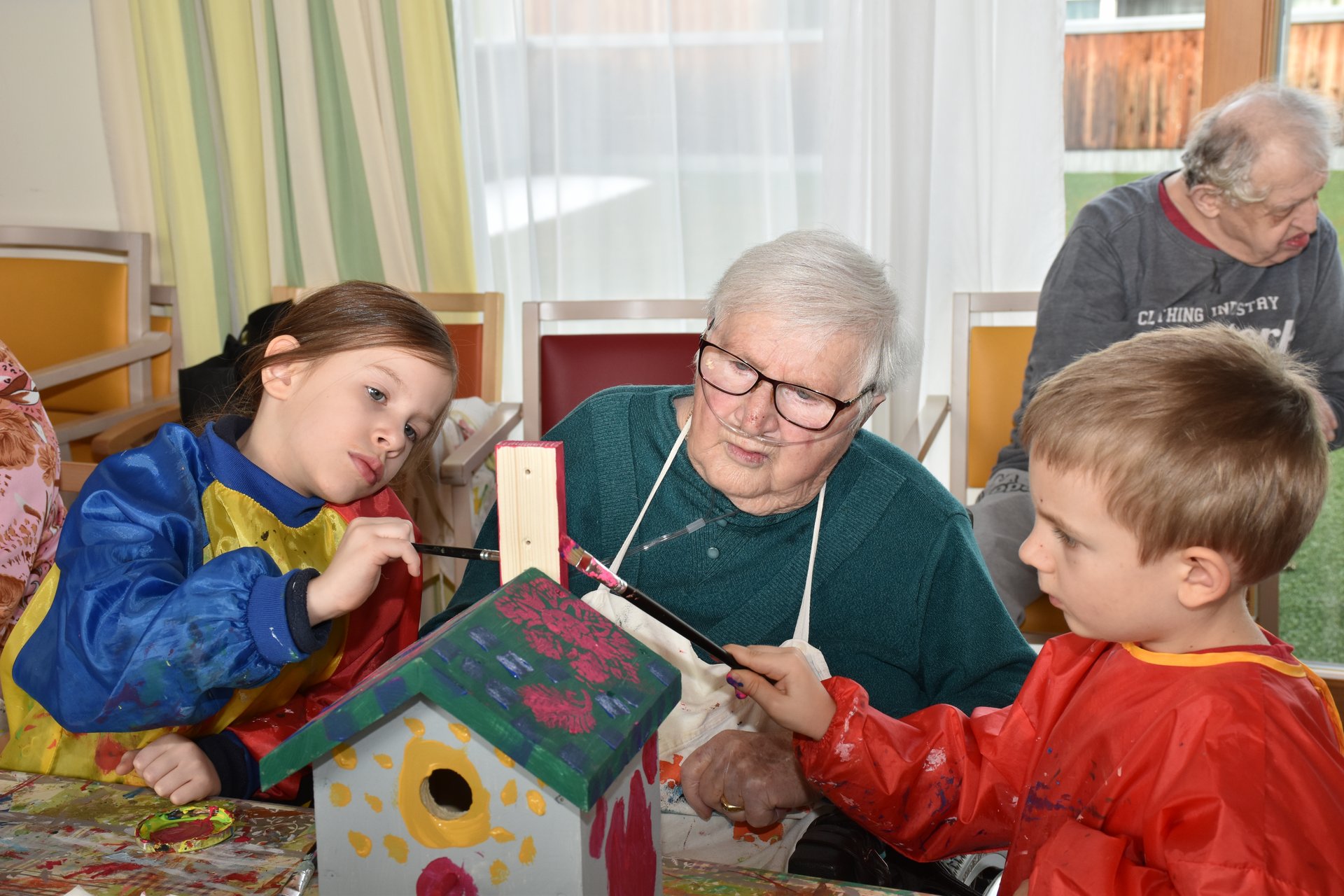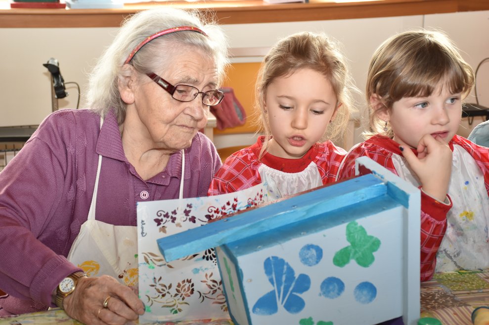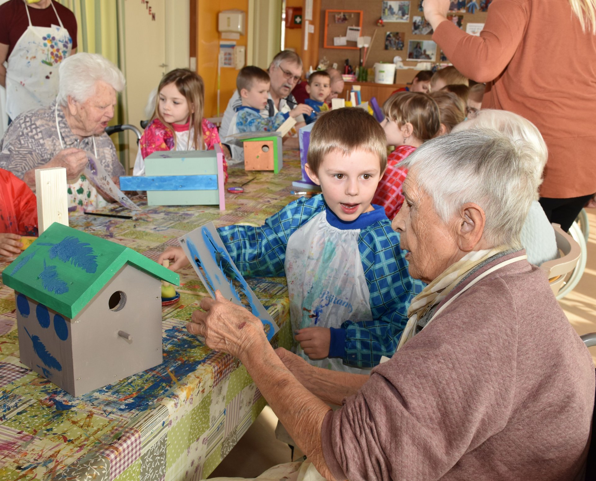 Die Arbeiten an den Nistkästen werden mit den Kindern vom Kindergarten II, Heubachstraße, fortgeführt! Mit Farben, Pinseln und Schablonen, dem nötigen Schaffensdrang und Spaß an der Sache bekommen die zukünftigen Behausungen verschiedener Vogelarten ein spezielles farbenfrohes Aussehen!