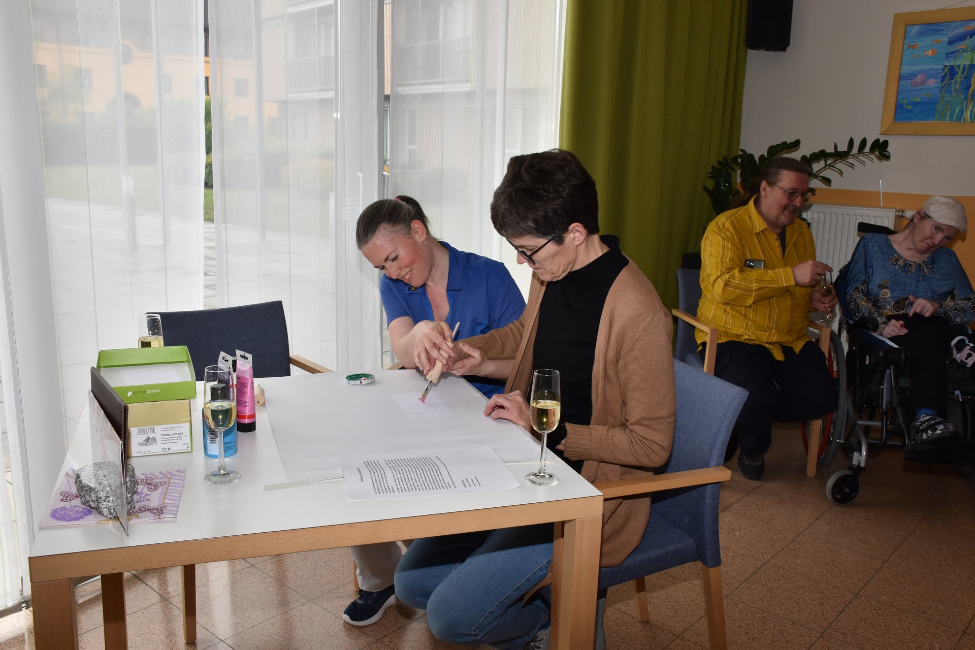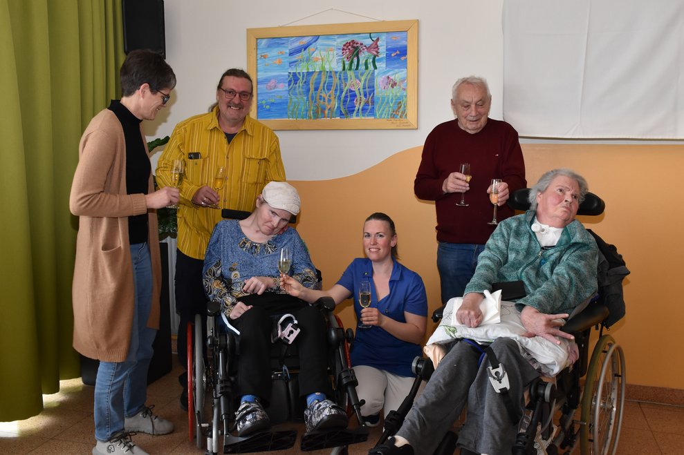 Das Kunstwerk wurde im Beisein der Angehörigen feierlich in der Cafeteria aufgehängt und mit Sekt auf das perfekt gelungene Projekt angestoßen. Dankesworte an die Künstlerinnen Aloisia Gundacker, Anna Minihold und Christa Pregesbauer. folgten von Pflegedirektorin Roswitha Astner und kaufmännischem Direktor Rainer Hirschmann.