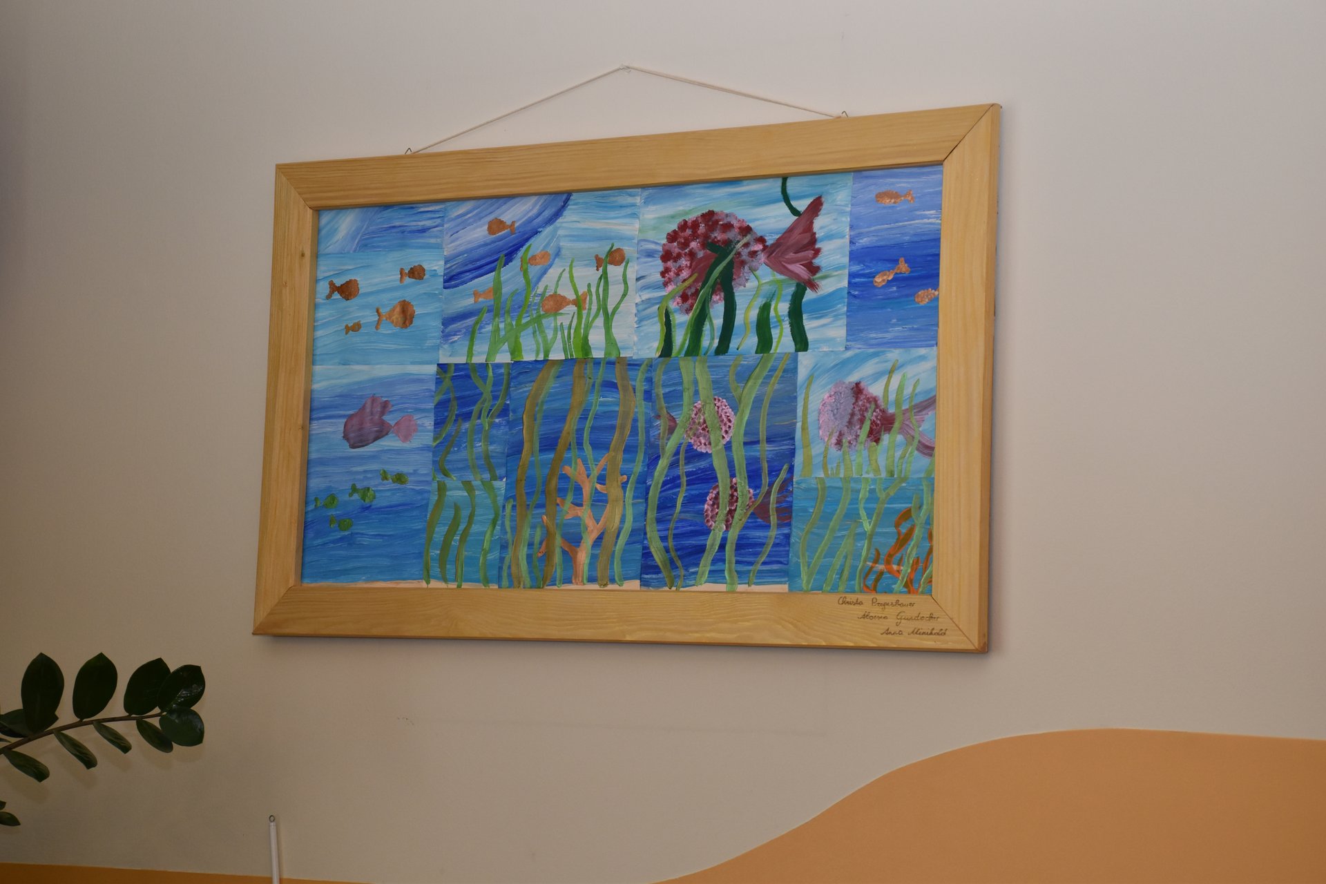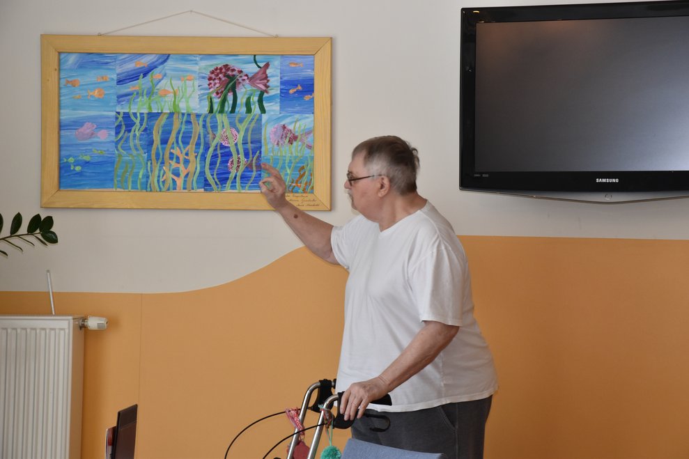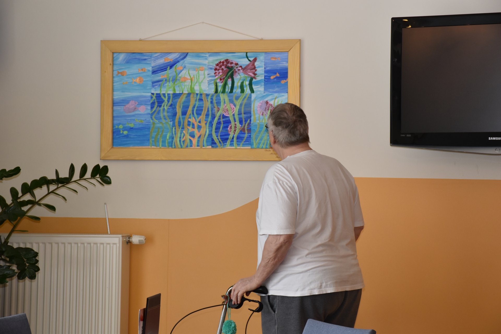 Am Beginn des Projekts „Kunst in der Schwerstpflege“ stand das Ziel, das Bewegungs-, Koordinations- und Wahrnehmungstraining der Bewohnerinnen freudvoller und produktiver zu gestalten und Farbe in den Alltag zu bringen. Besonderes Augenmerk wurde gelegt, die Eigeninitiative zu fördern und das Treffen eigener Entscheidungen sowie deren Umsetzung in einem sonst stark fremdbestimmten Umfeld zu ermöglichen. Die Bewohnerinnen bemalten assistiv jeweils kleine Teilbilder, die am Ende zu einem großen Ganzen zusammengefügt wurden. Jedes Teilstück entstand dabei in gemeinsamer Arbeit zwischen Künstlerin und Ergotherapeutin. Beim Malen wurde das Gewicht des Arms von der Therapeutin übernommen, die Bewegungsrichtung jedoch von der Künstlerin bestimmt. Ebenso wählten die Bewohnerinnen das Design der Fische sowie die Farben selbst aus. Die positiven Effekte des gemeinsamen Malens reichten von gesteigerter Ausdauer und sinkendem Muskeltonus bis zu verbesserter Konzentration und Fokussierung auf die Tätigkeit. Die Freude an der Tätigkeit selbst und am Sich-Selbst-wirksam-erleben während des Malens stand während des gemeinsamen Malens immer mehr im Vordergrund.