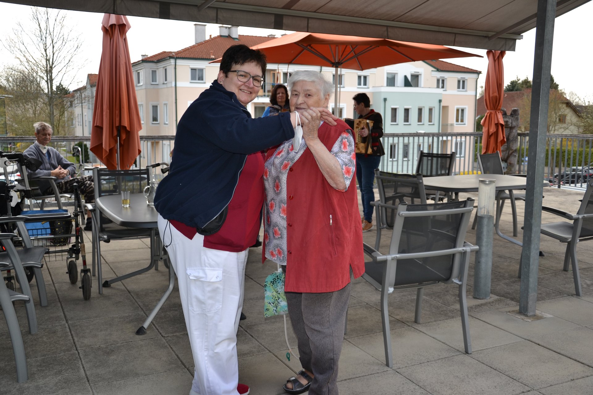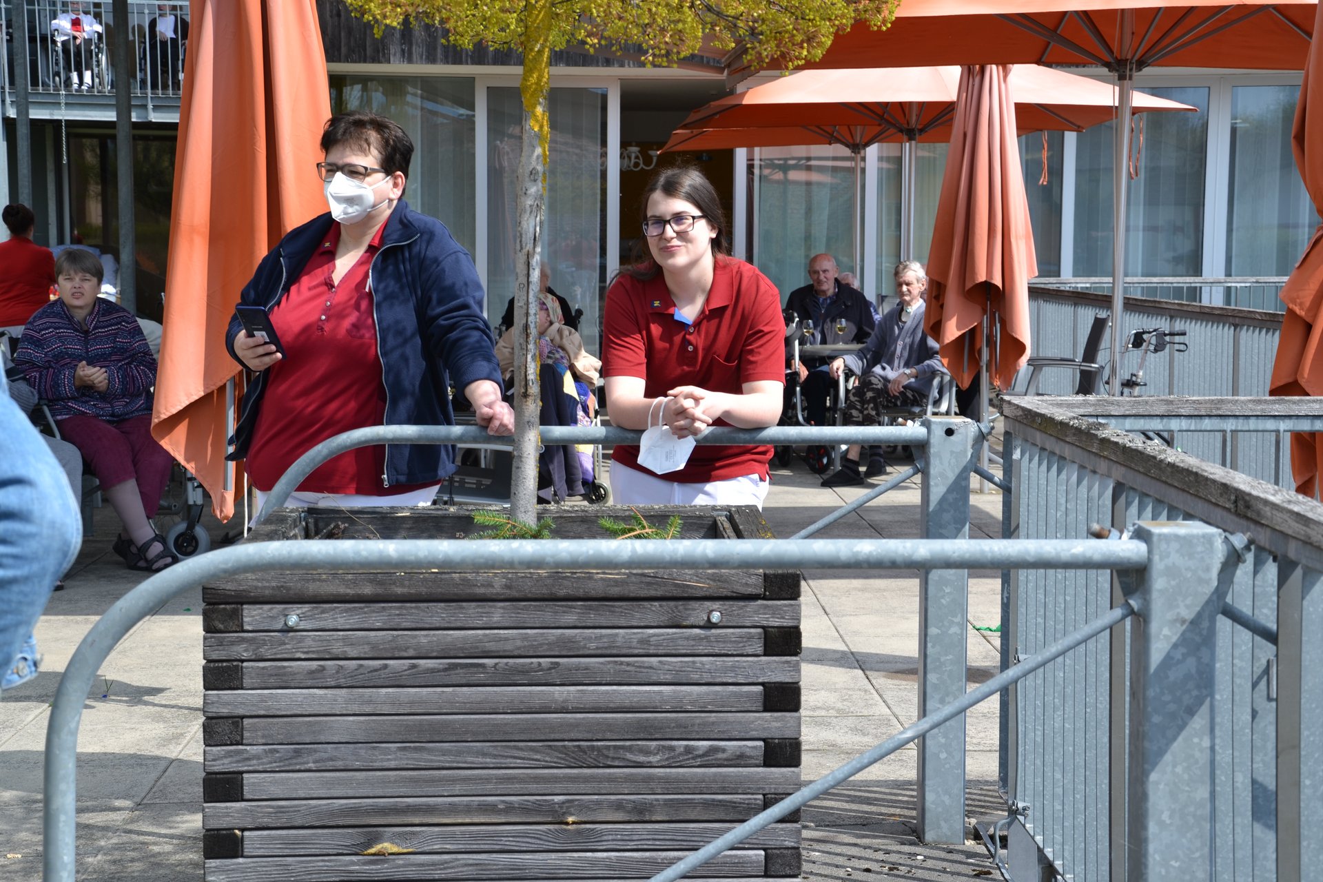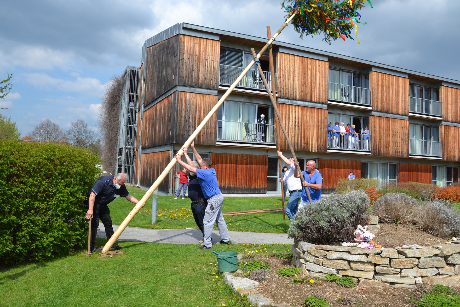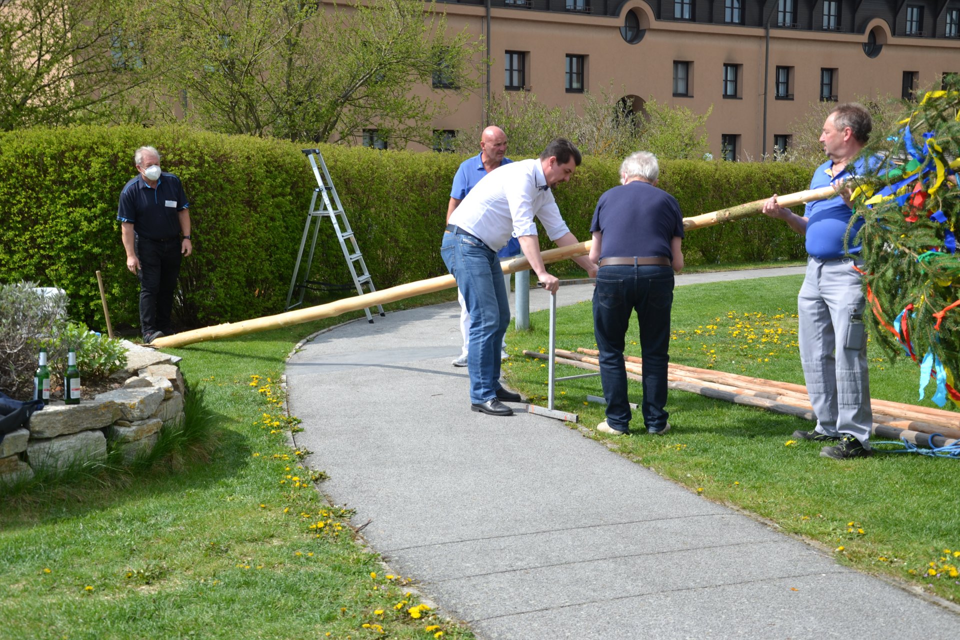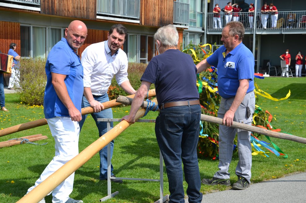Durch die Lockerungen der Corona-Maßnahmen fiel der diesjährige Maibaum wieder viel größer aus und einige Bewohnerinnen und Bewohner saßen draußen auf der Terrasse oder beobachteten das Spektakel vom Balkon aus. Musikalisch umrahmt wurde das Maibaumaufstellen von zwei Freiwilligen Mitarbeiterinnen, Karin Hölzl und Claudia Steiner.