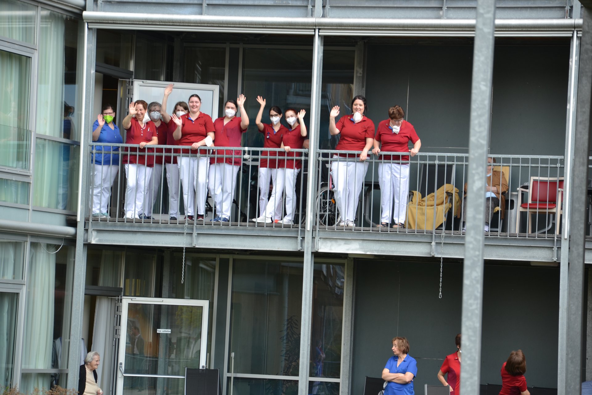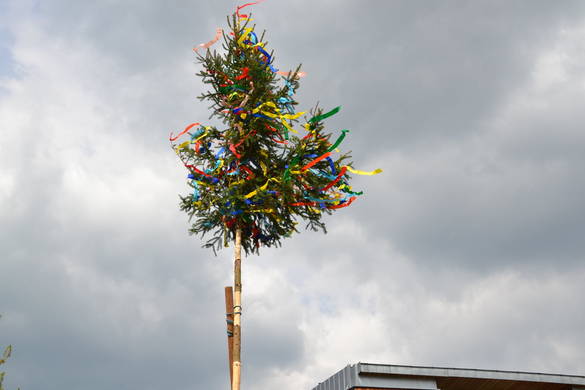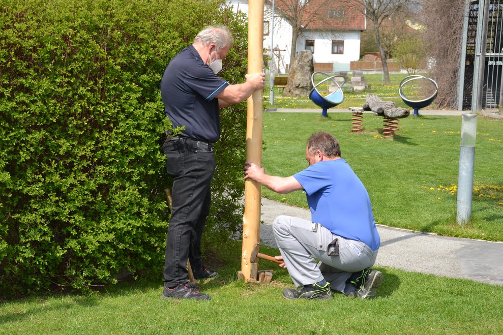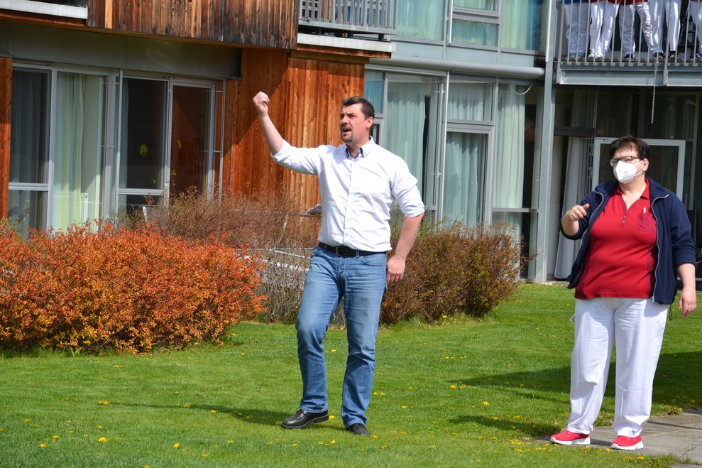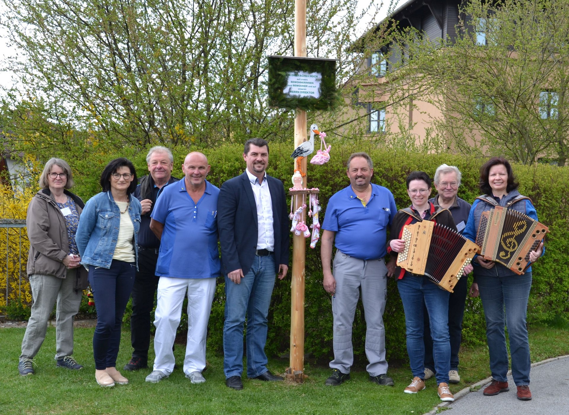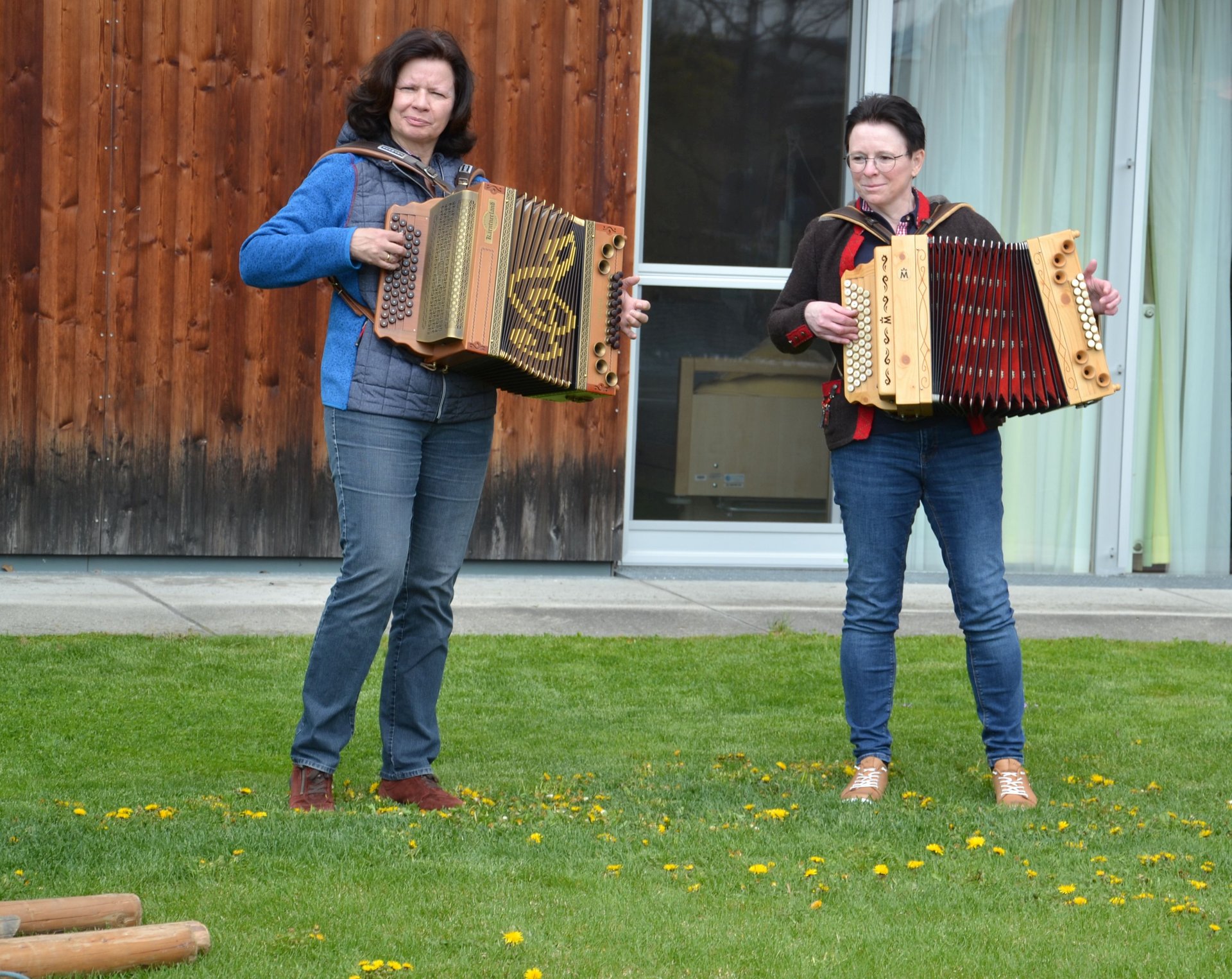 Durch die Lockerungen der Corona-Maßnahmen fiel der diesjährige Maibaum wieder viel größer aus und einige Bewohnerinnen und Bewohner saßen draußen auf der Terrasse oder beobachteten das Spektakel vom Balkon aus. Musikalisch umrahmt wurde das Maibaumaufstellen von zwei Freiwilligen Mitarbeiterinnen, Karin Hölzl und Claudia Steiner.