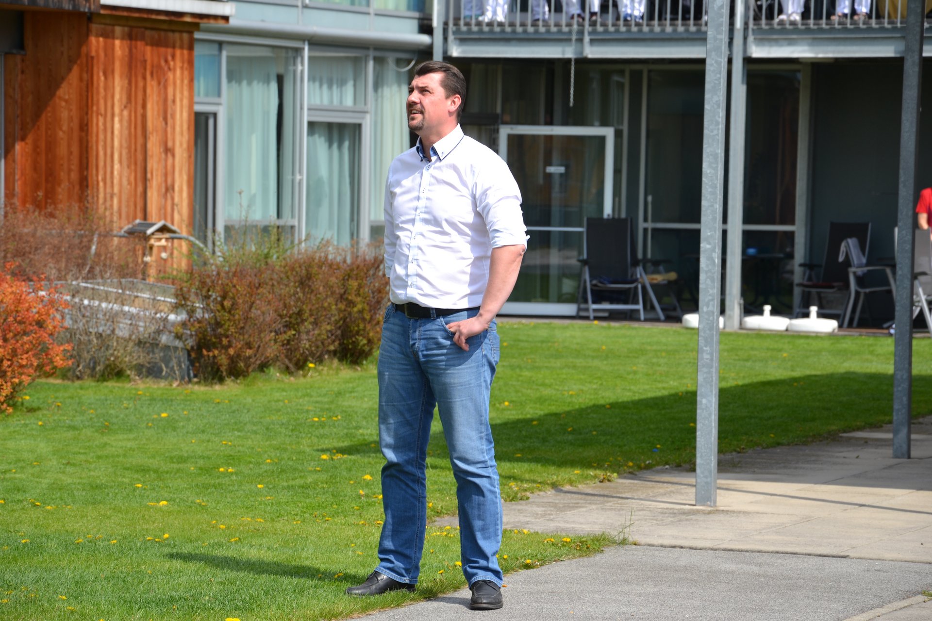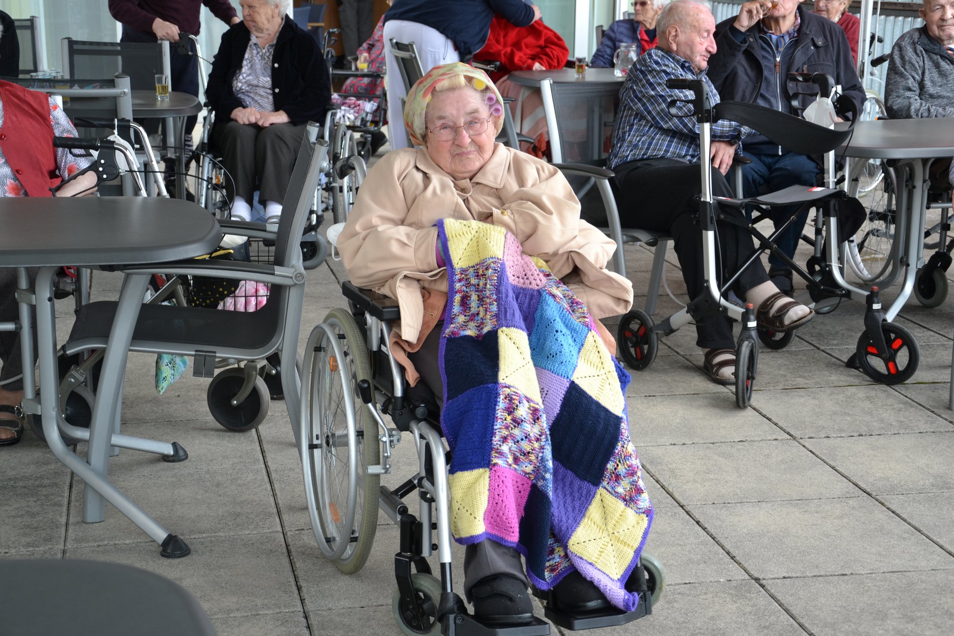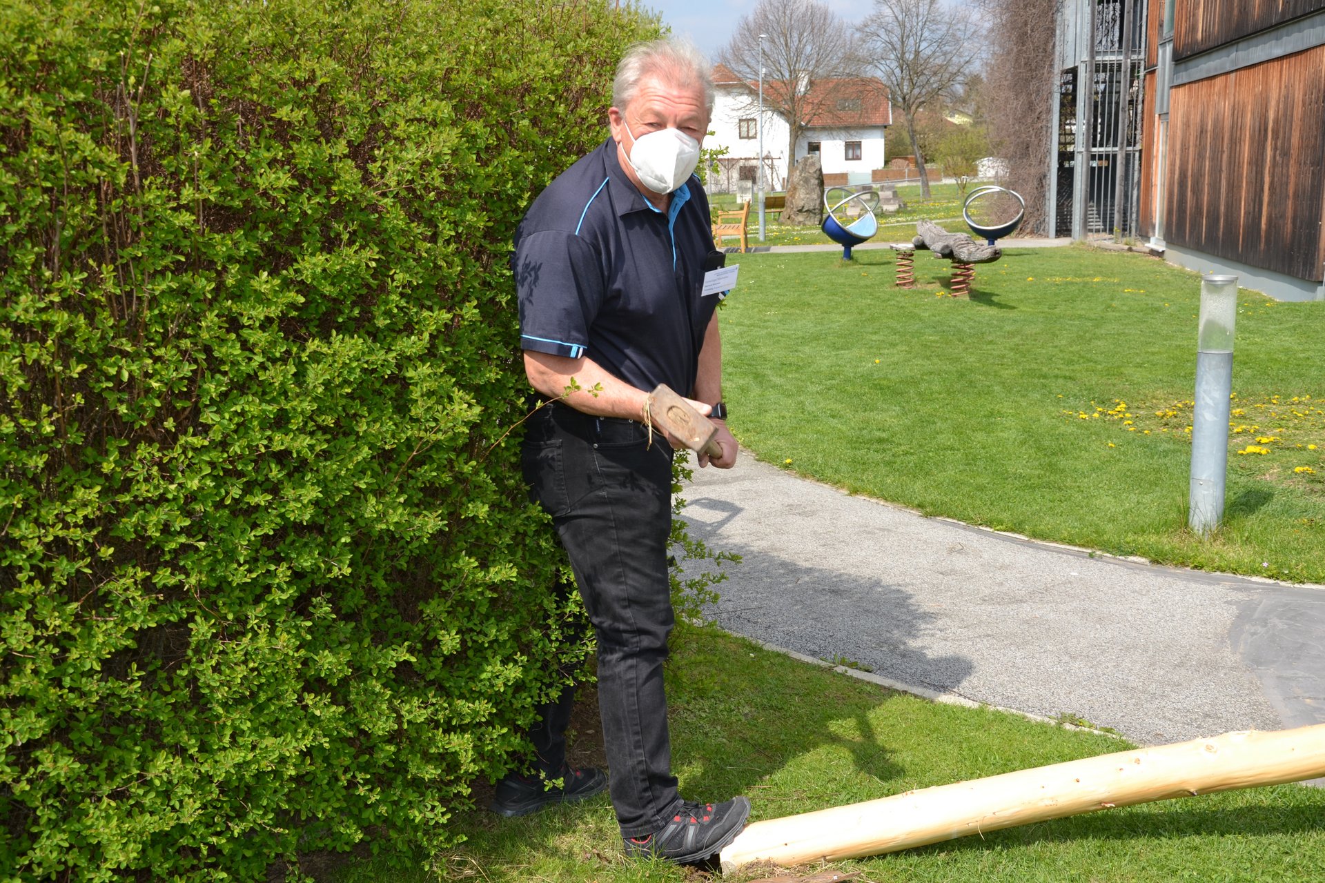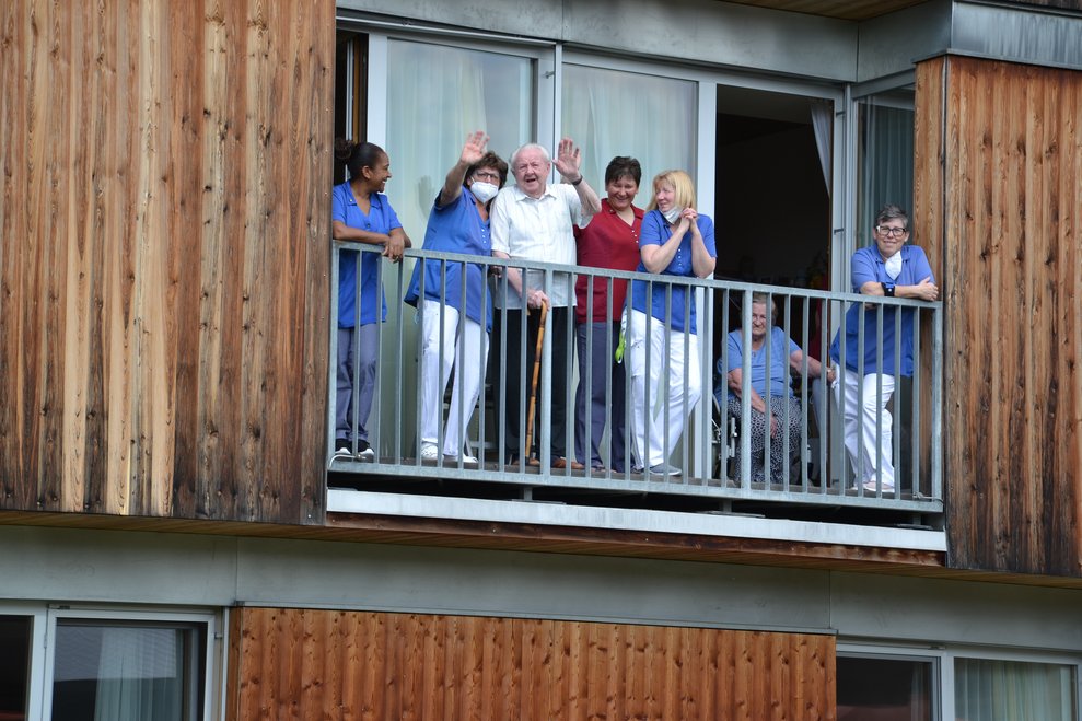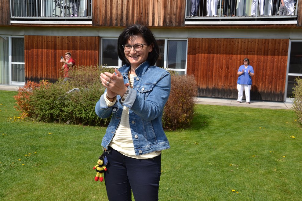 Durch die Lockerungen der Corona-Maßnahmen fiel der diesjährige Maibaum wieder viel größer aus und einige Bewohnerinnen und Bewohner saßen draußen auf der Terrasse oder beobachteten das Spektakel vom Balkon aus. Musikalisch umrahmt wurde das Maibaumaufstellen von zwei Freiwilligen Mitarbeiterinnen, Karin Hölzl und Claudia Steiner.