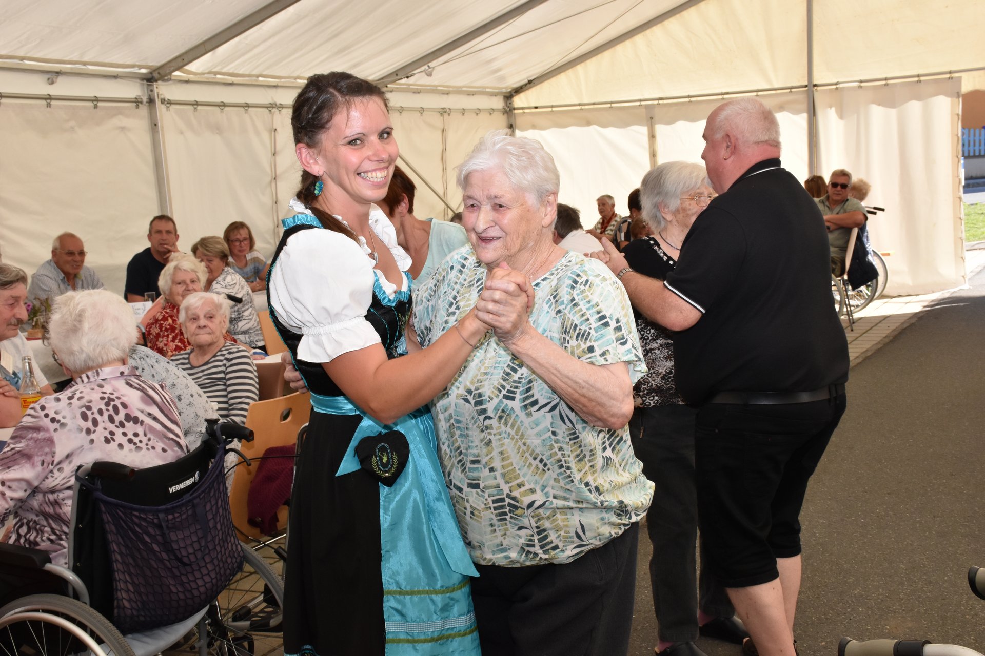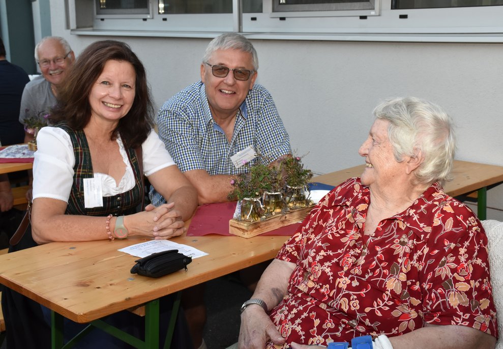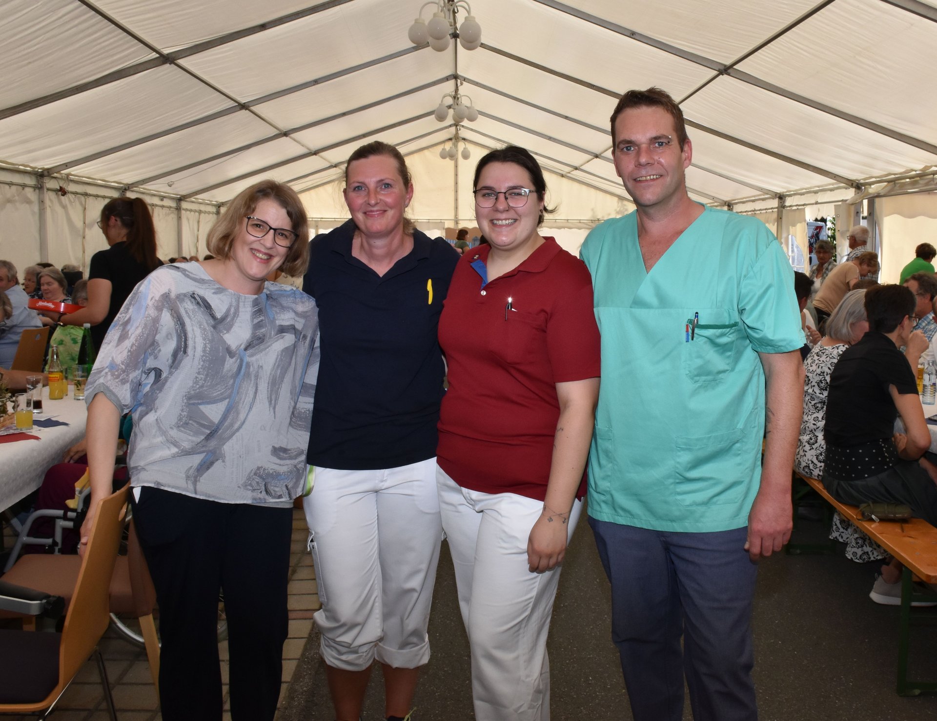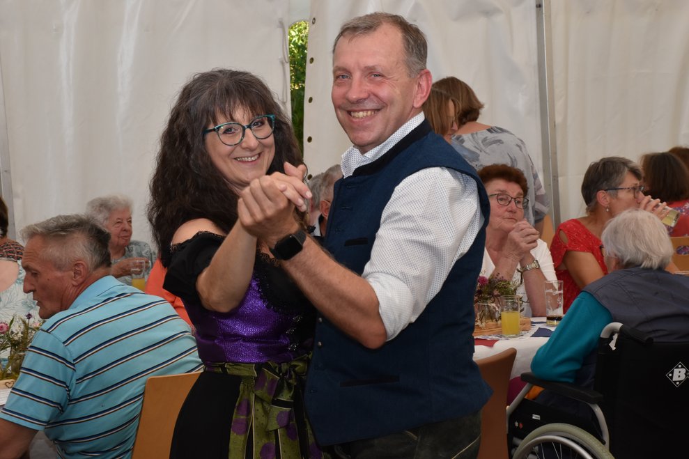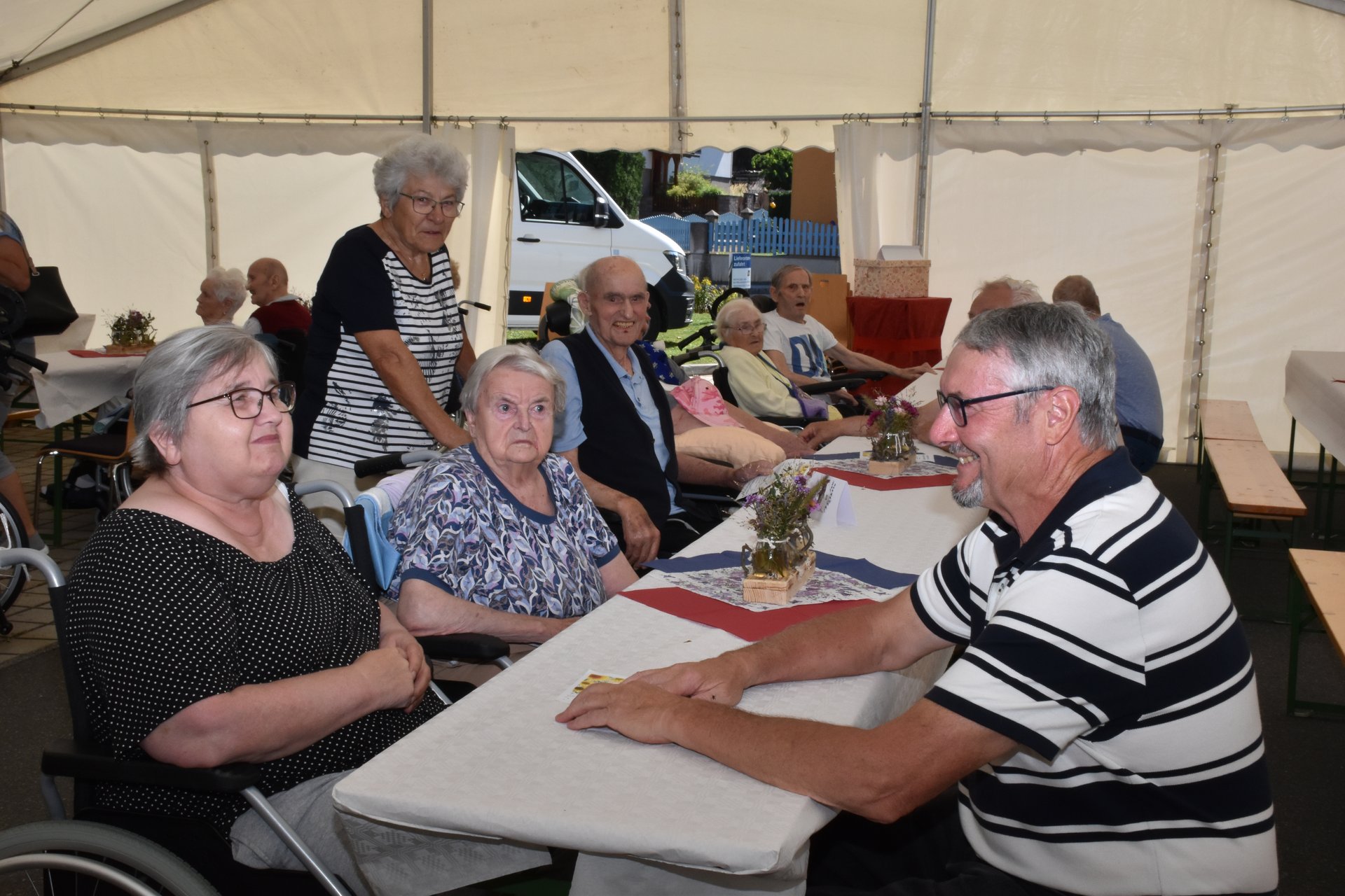 Natürlich waren zudem auch einige wichtige Elemente erforderlich: Ein schützendes Zeltdach über dem Kopf, schmackhaftes Essen für alle, eine Ausschank und eine Weinbar, um den Gaumen zu verwöhnen. Die Hauptzutaten im Haus waren die Anwesenheit unseres kaufmännischen Direktors Rainer Hirschmann und der Pflegedirektorin Roswitha Astner. Die perfekte Mischung an Ehrengästen und die Teilnahme vieler Bewohnerinnen und Bewohner sowie ihrer Angehörigen verstärkten den besonderen Geschmack des Festes. Diese Formel trug zum entspannten Ablauf des Festes bei, bei dem auch Kolleginnen in den Ruhestand verabschiedet und die langjährige Zusammenarbeit mit der Kindergartenleitung Jutta Gary gewürdigt wurden. Außerdem konnte die neue Leiterin, Ulli Bayer, begrüßt werden.
