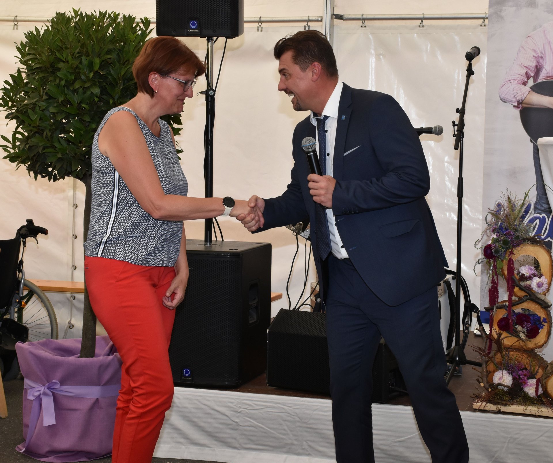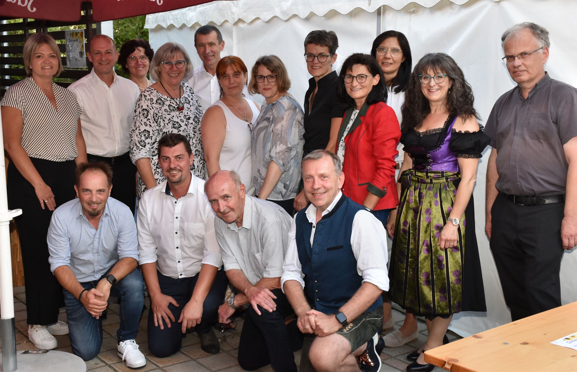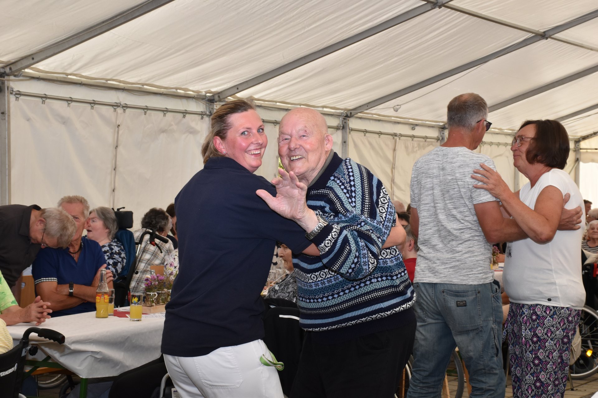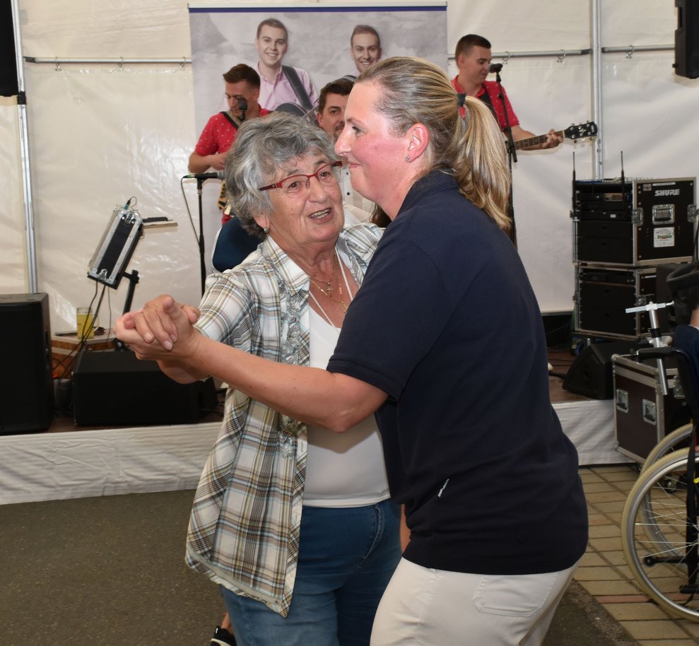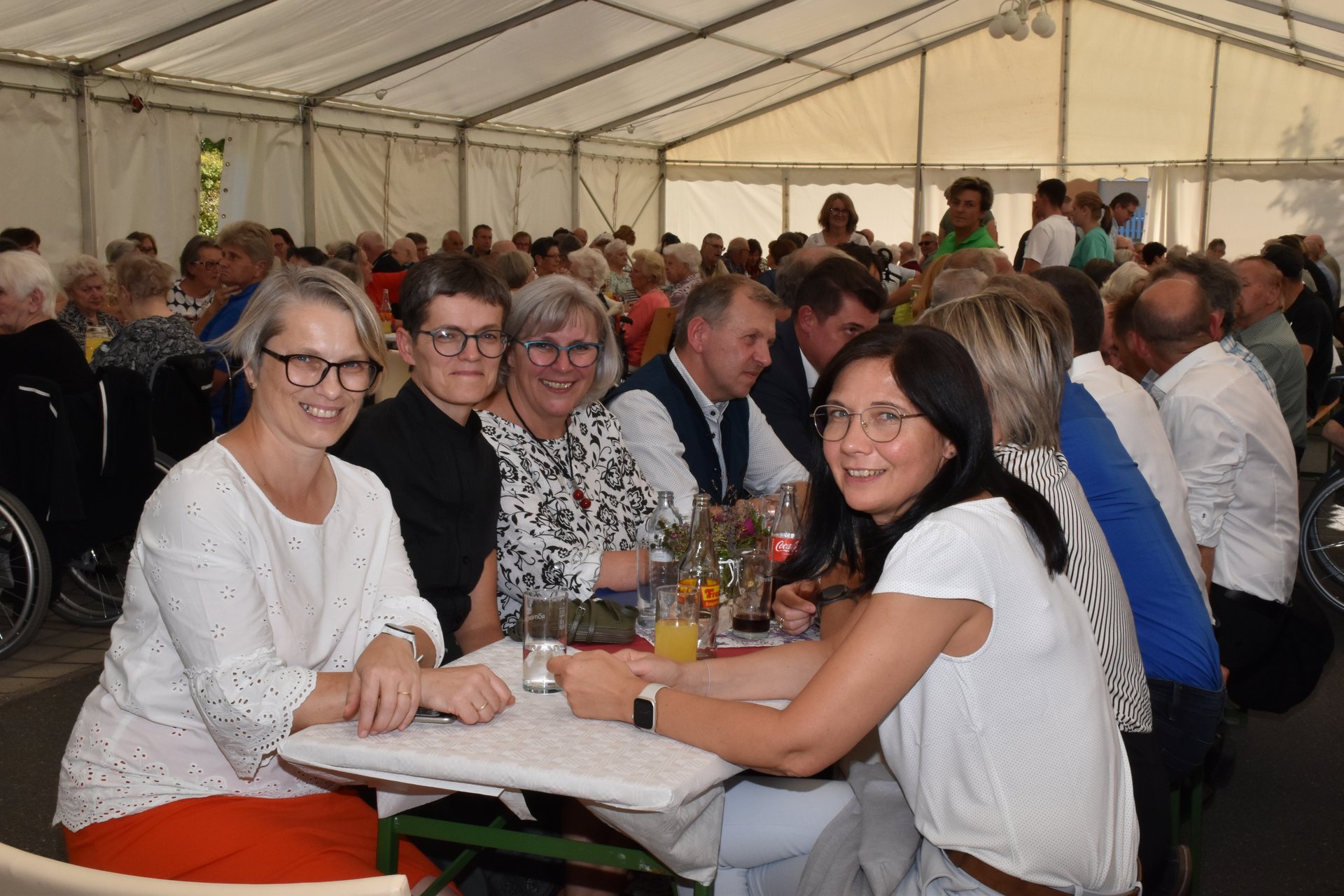 Natürlich waren zudem auch einige wichtige Elemente erforderlich: Ein schützendes Zeltdach über dem Kopf, schmackhaftes Essen für alle, eine Ausschank und eine Weinbar, um den Gaumen zu verwöhnen. Die Hauptzutaten im Haus waren die Anwesenheit unseres kaufmännischen Direktors Rainer Hirschmann und der Pflegedirektorin Roswitha Astner. Die perfekte Mischung an Ehrengästen und die Teilnahme vieler Bewohnerinnen und Bewohner sowie ihrer Angehörigen verstärkten den besonderen Geschmack des Festes. Diese Formel trug zum entspannten Ablauf des Festes bei, bei dem auch Kolleginnen in den Ruhestand verabschiedet und die langjährige Zusammenarbeit mit der Kindergartenleitung Jutta Gary gewürdigt wurden. Außerdem konnte die neue Leiterin, Ulli Bayer, begrüßt werden.