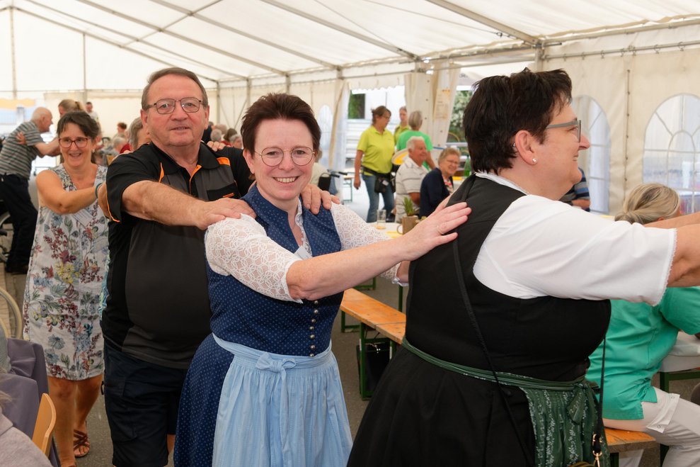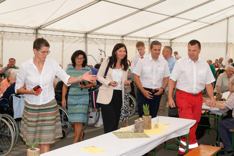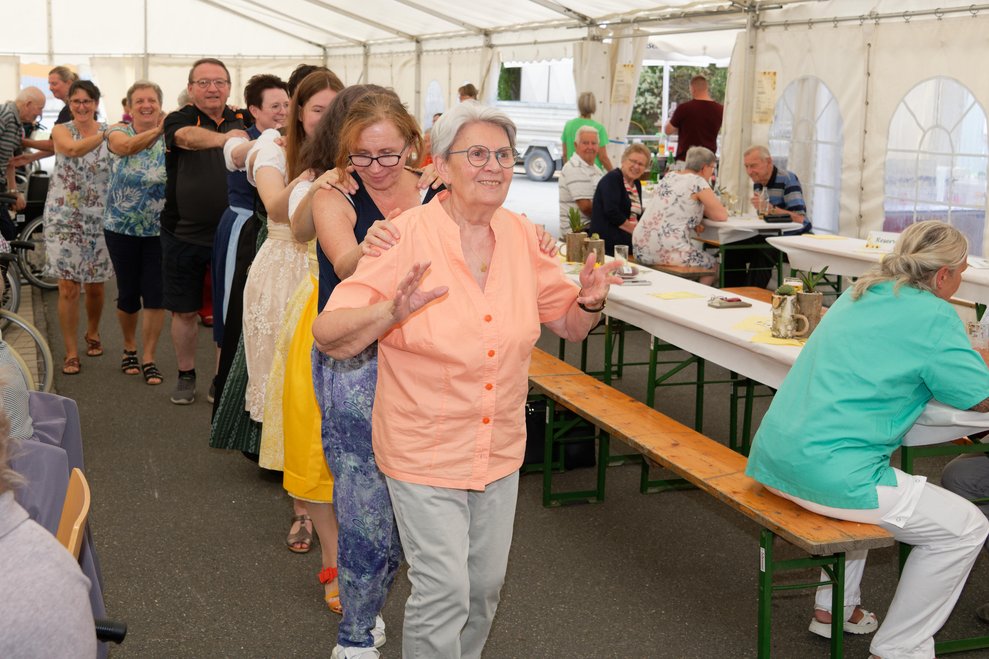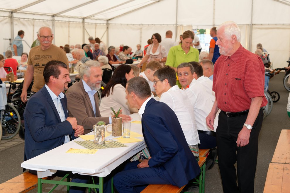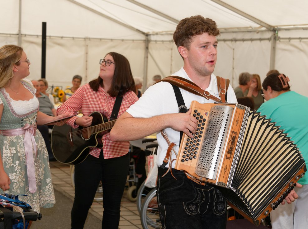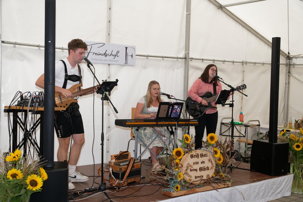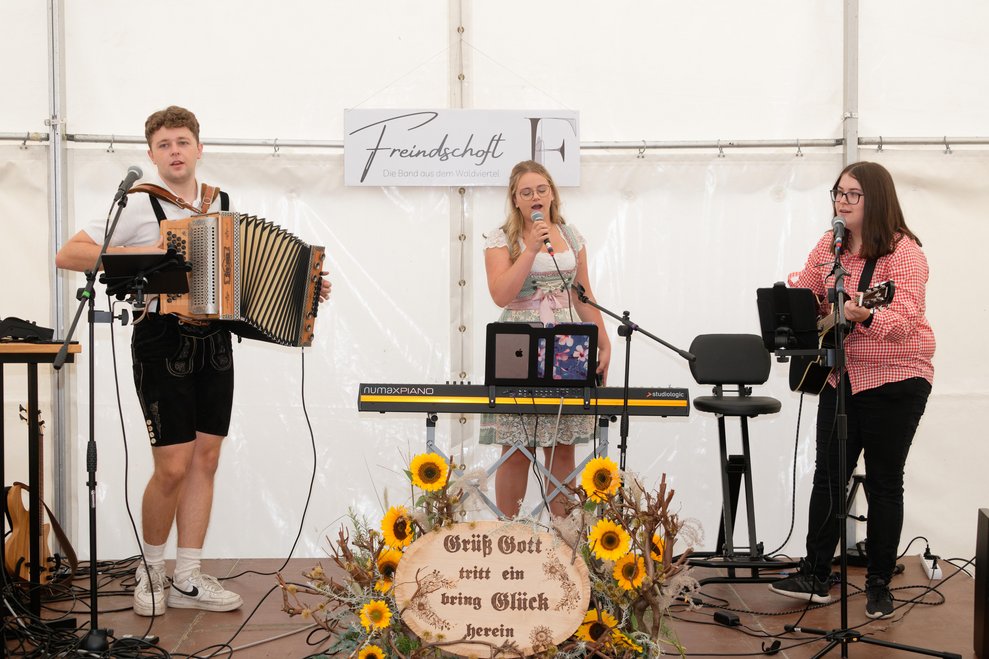 In diesem Jahr fand erstmals der Spätsommerfrühschoppen statt und ersetzte damit das traditionelle Spätsommerfest. Begleitet von der Musikgruppe „Freindschoft“, die Band aus dem Waldviertel, die für die perfekte musikalische Umrahmung sorgte, wurde das Lied „Wir sind eine große Familie“ angestimmt. Dabei sangen nicht nur Ehrenamtliche, Personal und Bewohnerinnen und Bewohner mit, sondern auch die Angehörigen und es entwickelte sich eine überaus heitere und ausgelassene Stimmung. Kulinarisch wurden die Gäste bestens mit Leckereien vom Grill und einem reichhaltigen Kuchenbuffet verwöhnt. Der reibungslose Ablauf des Festes wurde durch die engagierten Mitarbeiterinnen und Mitarbeiter des PBZ und die zahlreichen Ehrenamtlichen möglich gemacht, die in allen Bereichen tatkräftig mithalfen.